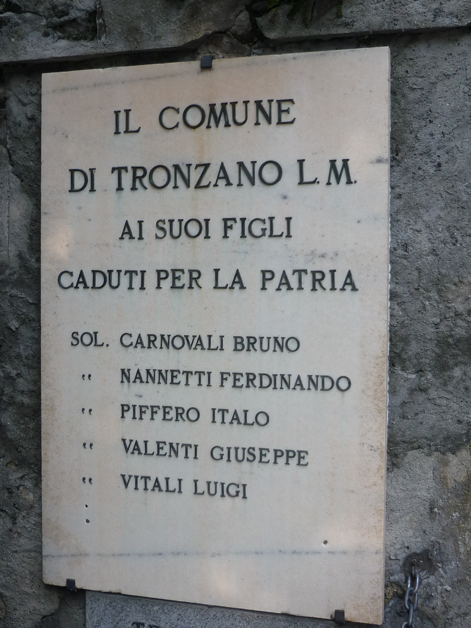 - ISCRIZIONI sulla lapide - IL COMUNE/ DI TRONZANO L.M./ AI SUOI FIGLI/ CADUTI PER LA PATRIA/ SOL. CARNOVALI BRUNO/ “ NANNETTI FERDINANDO/ “ PIFFERO ITALO/ “ VALENTI GIUSEPPE/ “ VITALI LUIGI - capitale -