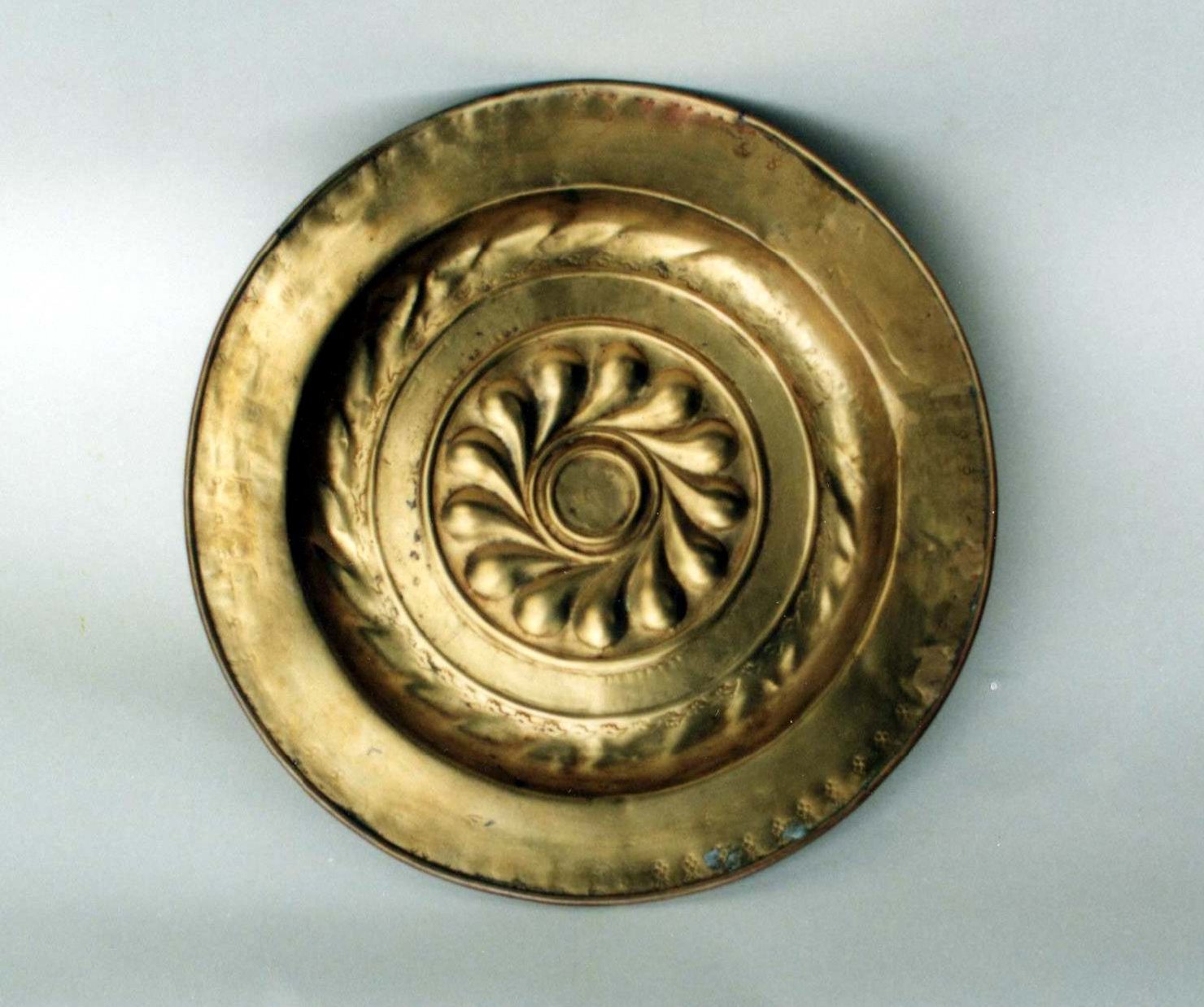 Lastra di ottone battuta e tornita. Al centro classica decorazione a ventolina; sul fondo reca impressa scritta poco visibile a caratteri gotici. Sul bordo estroflesso decorazione a bulino, il bordo termina rivoltato su filo di ferro