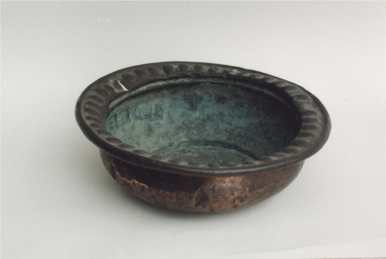 Lastra di rame battuta e modellata, corpo bombato, bordo estroflesso all'esterno con ovuli sbalzati. Termina con con bordo rivoltato su filo di ferro