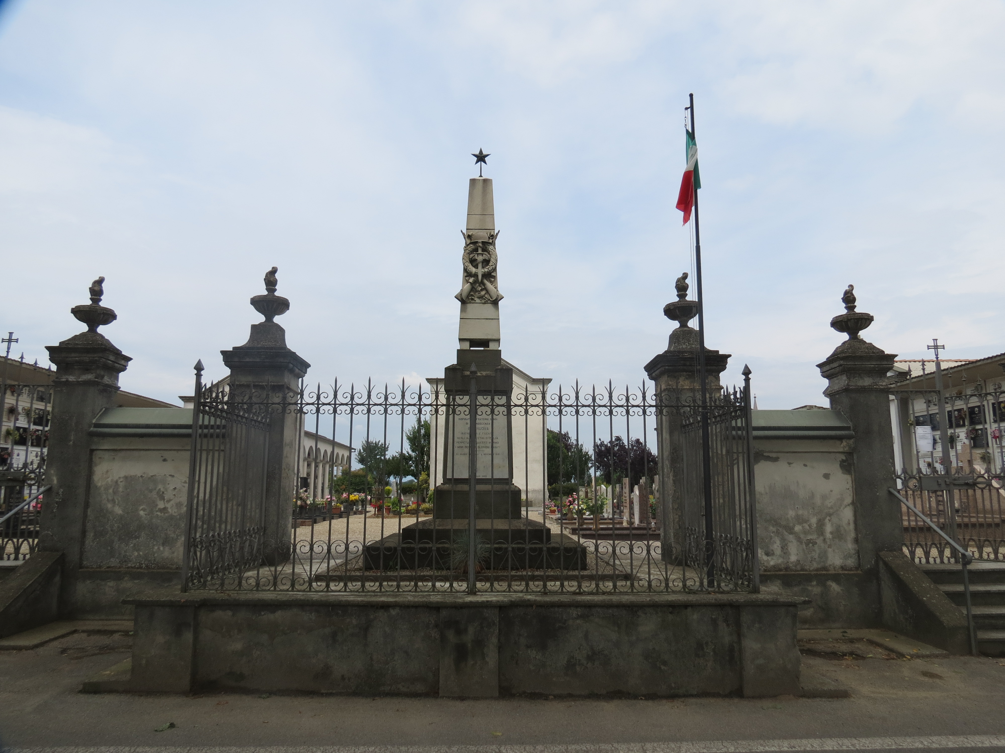Monumento a obelisco su alto basamento e gradini. L'obelisco è ornato da un rilievo con ghirlanda e trofeo di armi e sormontato dalla stella a cinque punte. Sul basamento sono presenti le fotografie dei caduti. Le iscrizioni sono sia incise sia dipinte a pennello