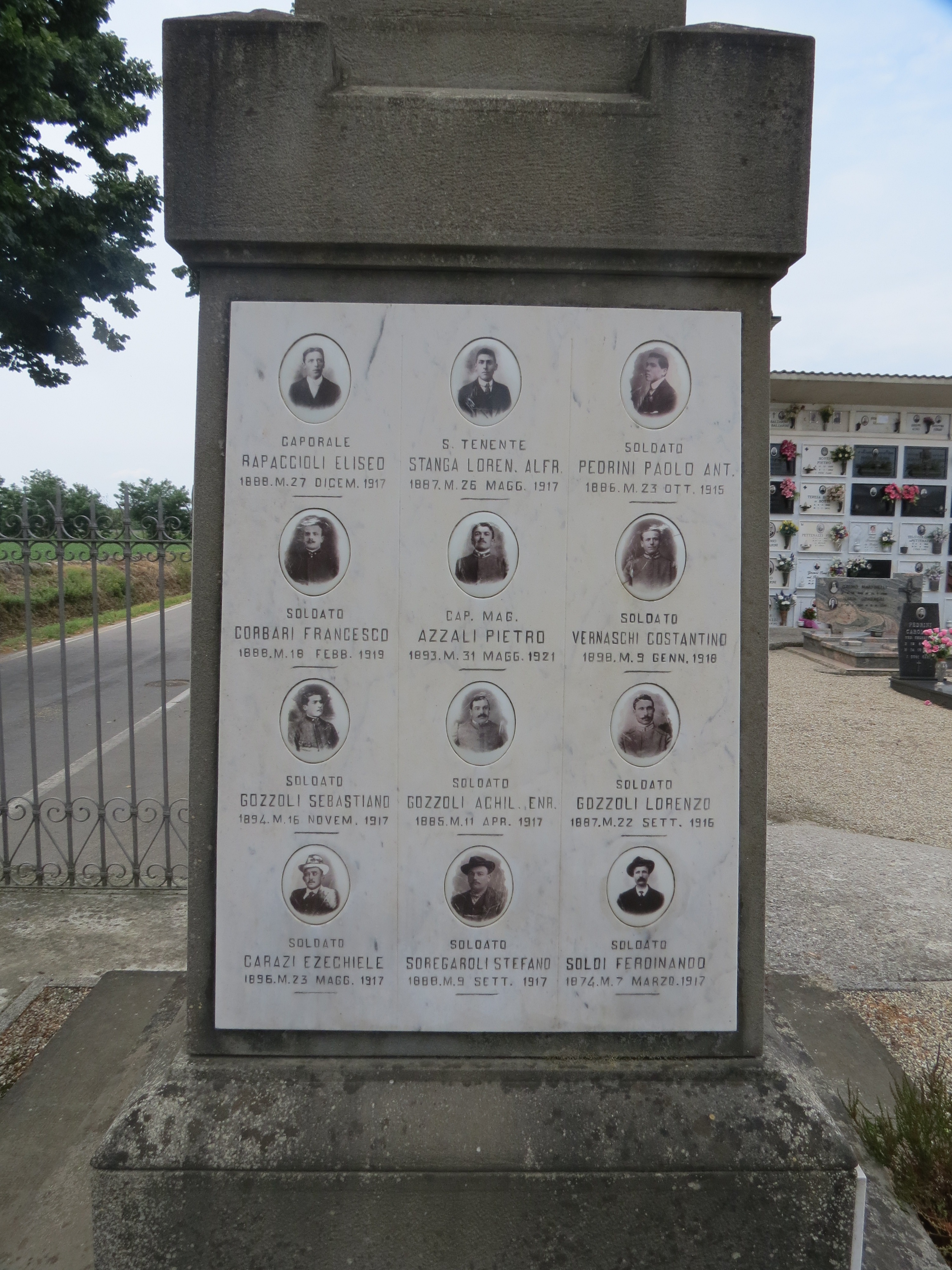 - ISCRIZIONI basamento, lapide sul lato frontale - INSPIRATA A FRATERNI SENSI/ DI RICONOSCENZA/ BINANUOVA/ PATRIOTICA E FIDENTE/ NEGLI ALTI DESTINI D’ITALIA/ PERPETUA IN QUESTO MARMO/ I NOMI DEI SUOI GLORIOSI CADUTI/ 24 MAGGIO 1915 – 4 NOVEMBRE 1918/ 2 LUGLIO 1922 - a incisione -