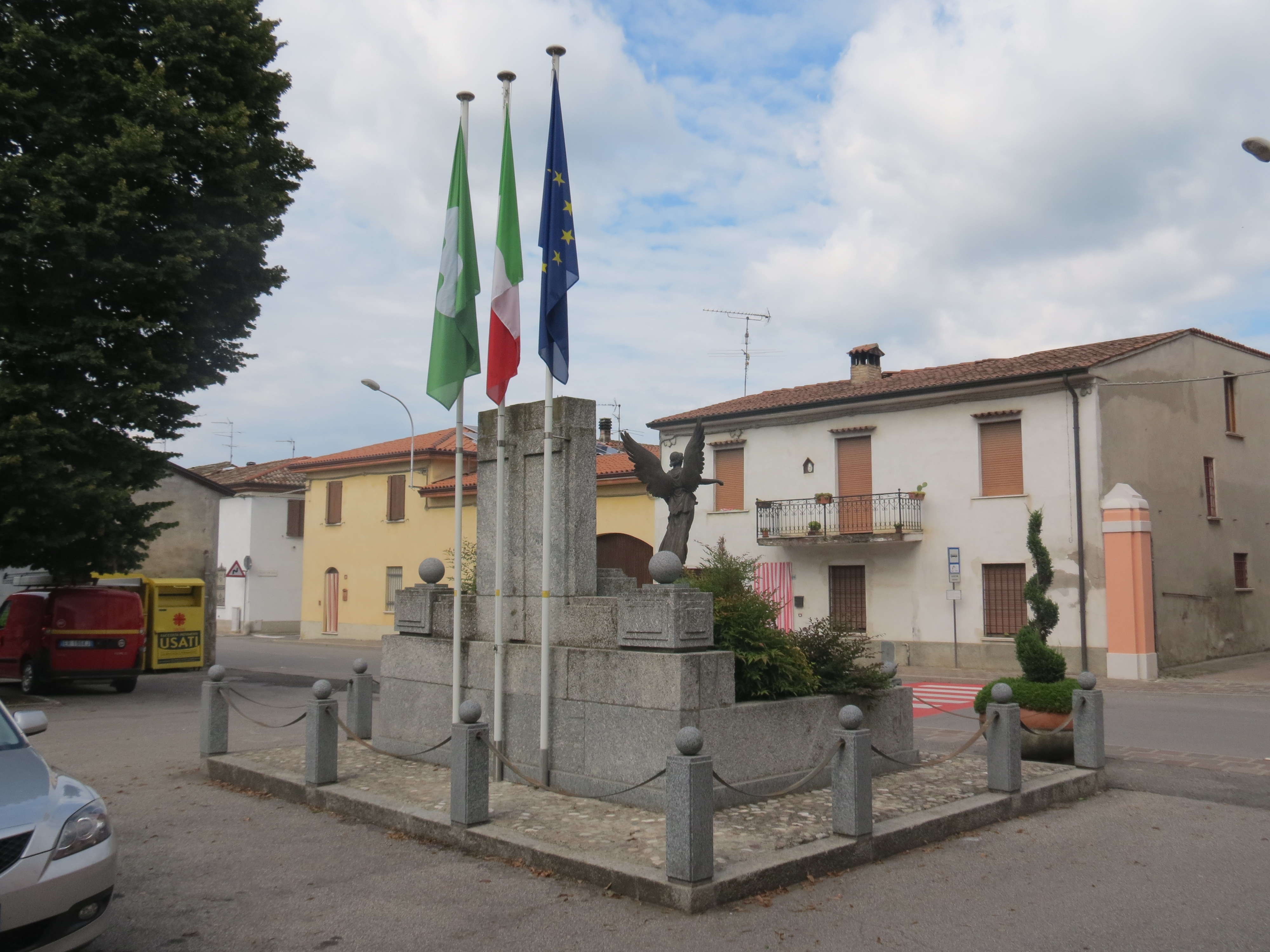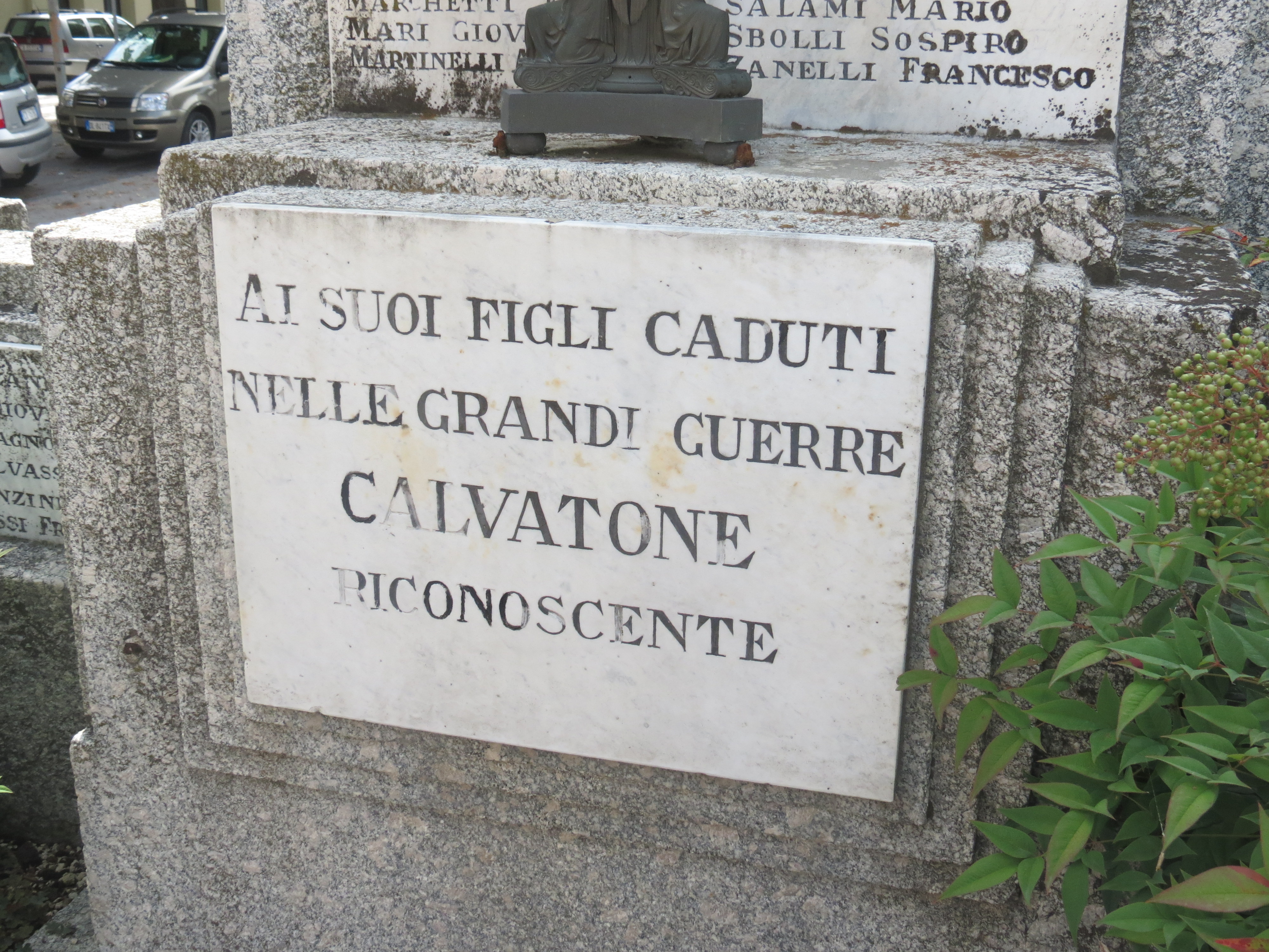 - ISCRIZIONI lato frontale, lapide sotto la statua, al centro - AI SUOI FIGLI CADUTI/ NELLE GRANDI GUERRE/ CALVATONE/ RICONOSCENTE - a incisione -