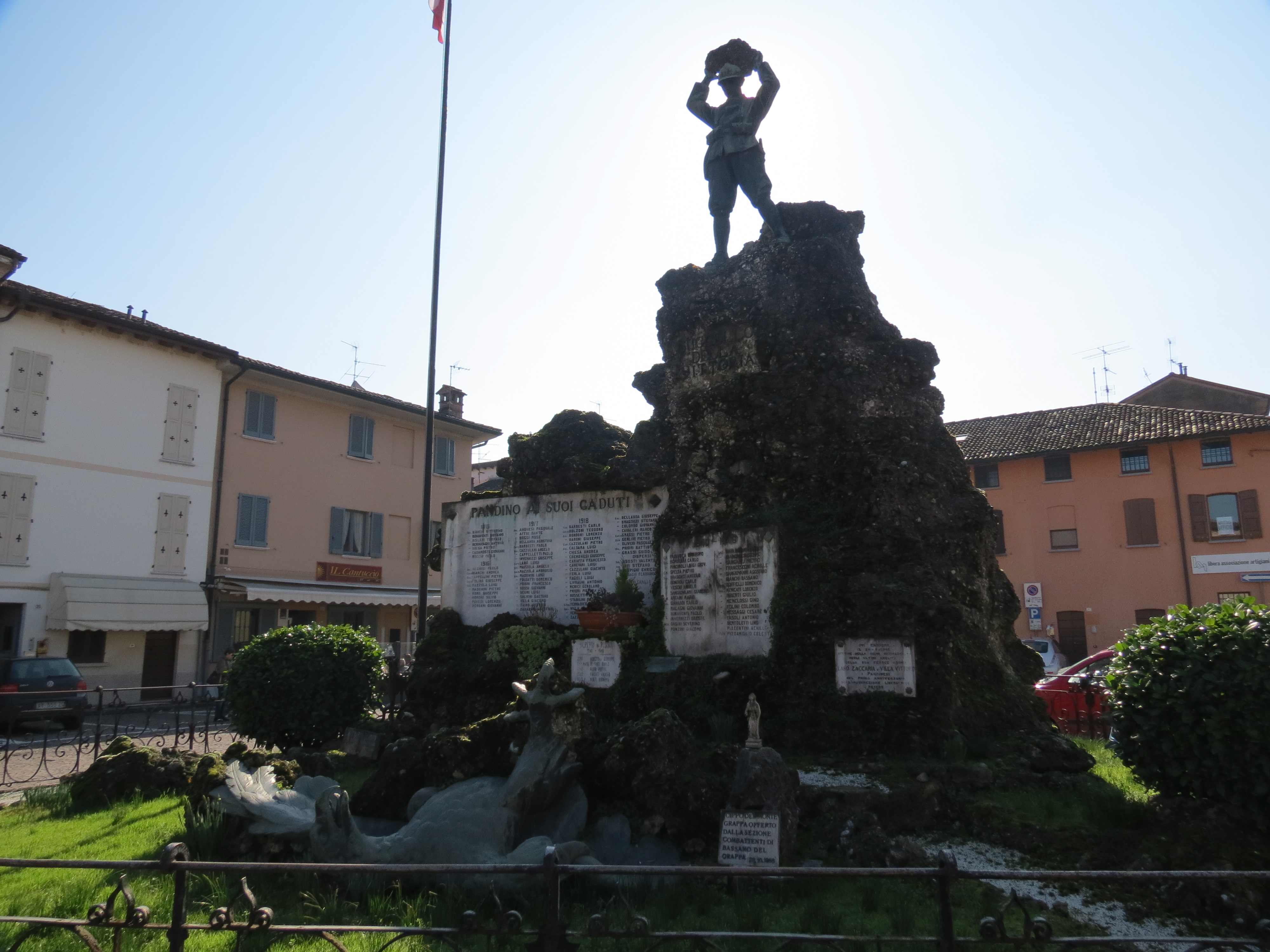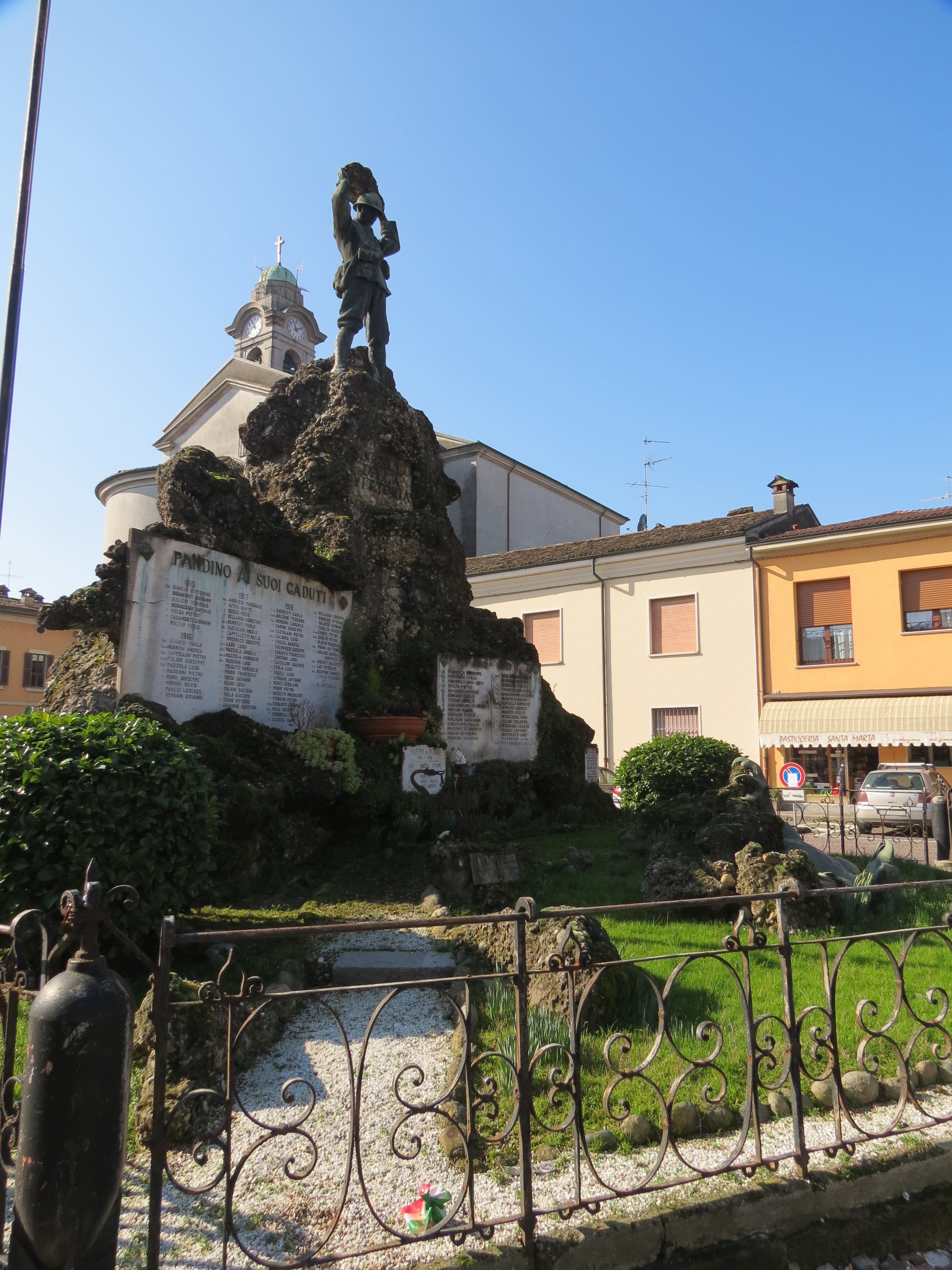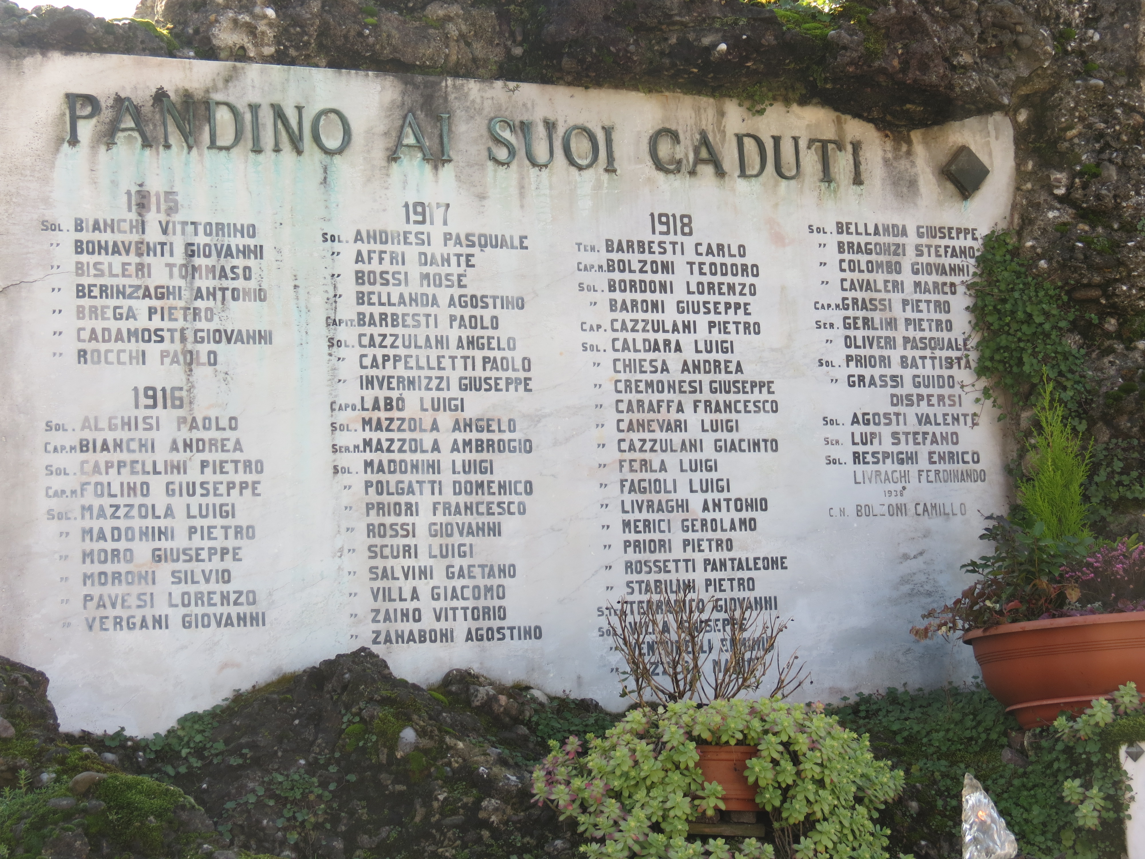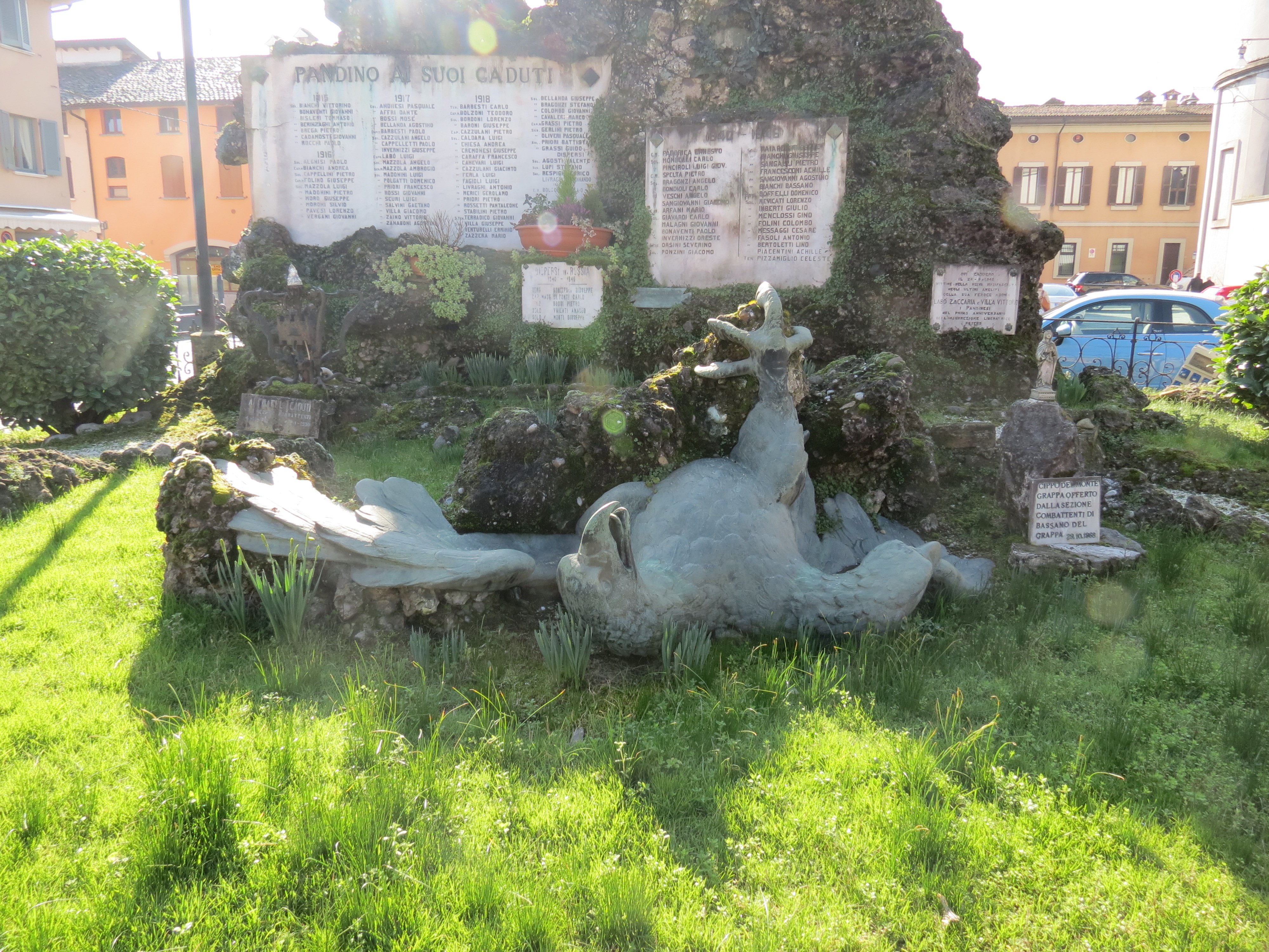 - NOTIZIE STORICO CRITICHE Nel 1928, dopo un pubblico concorso, venne inaugurato il monumento ai caduti davanti al castello, in occasione del decennale della vittoria italiana nella prima guerra mondiale. Il monumento riporta sulle lapidi i nomi dei caduti pandinesi di tutte le guerre del XX secolo. Bibliografia: E. W. Loda, I monumenti ai caduti della grande guerra nel contesto socio-politico del territorio cremonese, tesi di laurea, Università degli Studi di Pavia, facoltà di Musicologia, a.a. 2005-2006, p. 67; G. M. Bassi, Le pietre della memoria, Monumenti, lapidi, cippi, targhe, elenco dei Caduti delle Guerre del ‘900 della Provincia di Lodi e dei Comuni vicini, Sezione A.N.C.R. “M. Stroppa” di Casalpusterlengo, Casalpusterlengo 2011, vol. 1, pp. 159-162