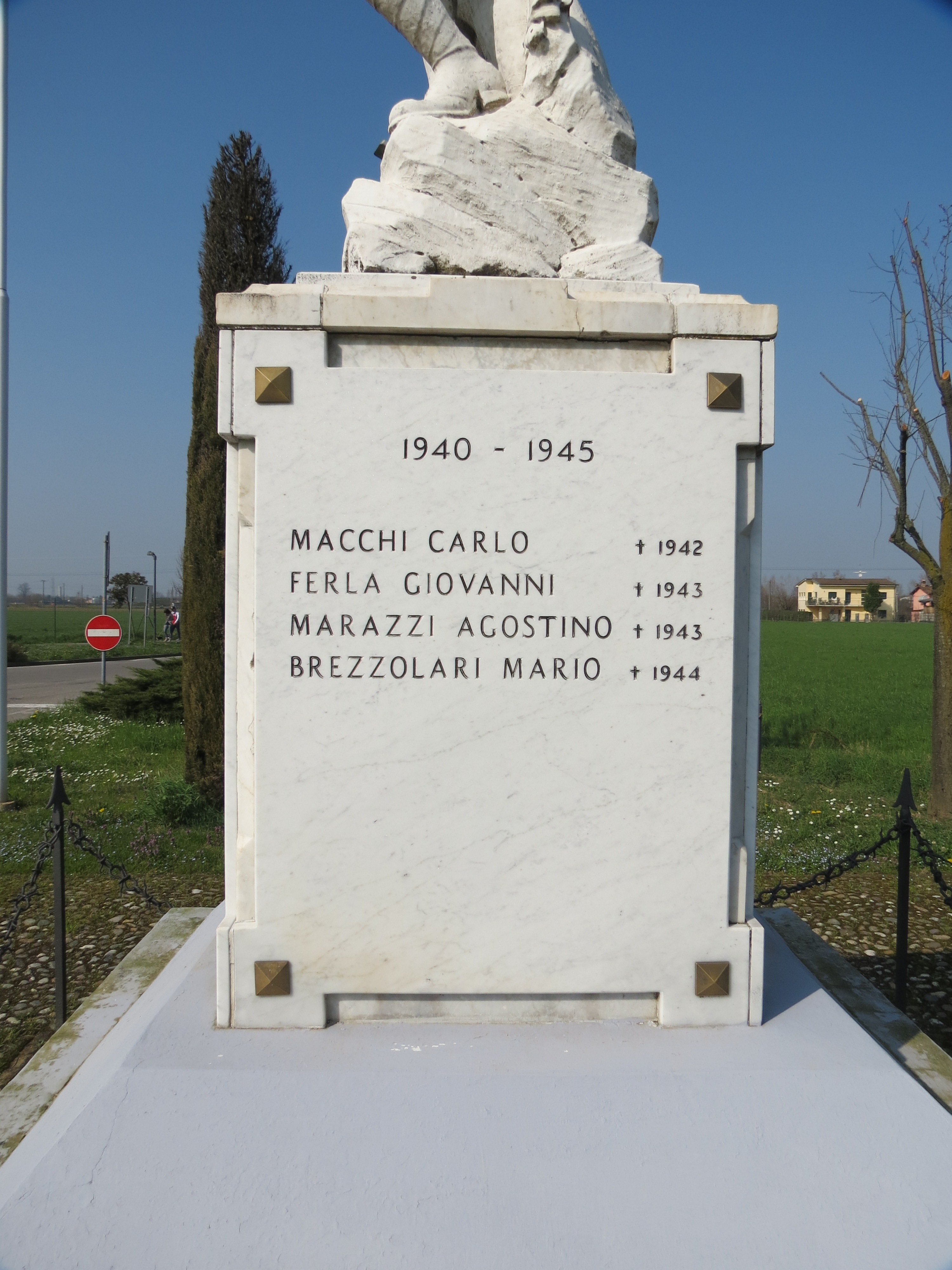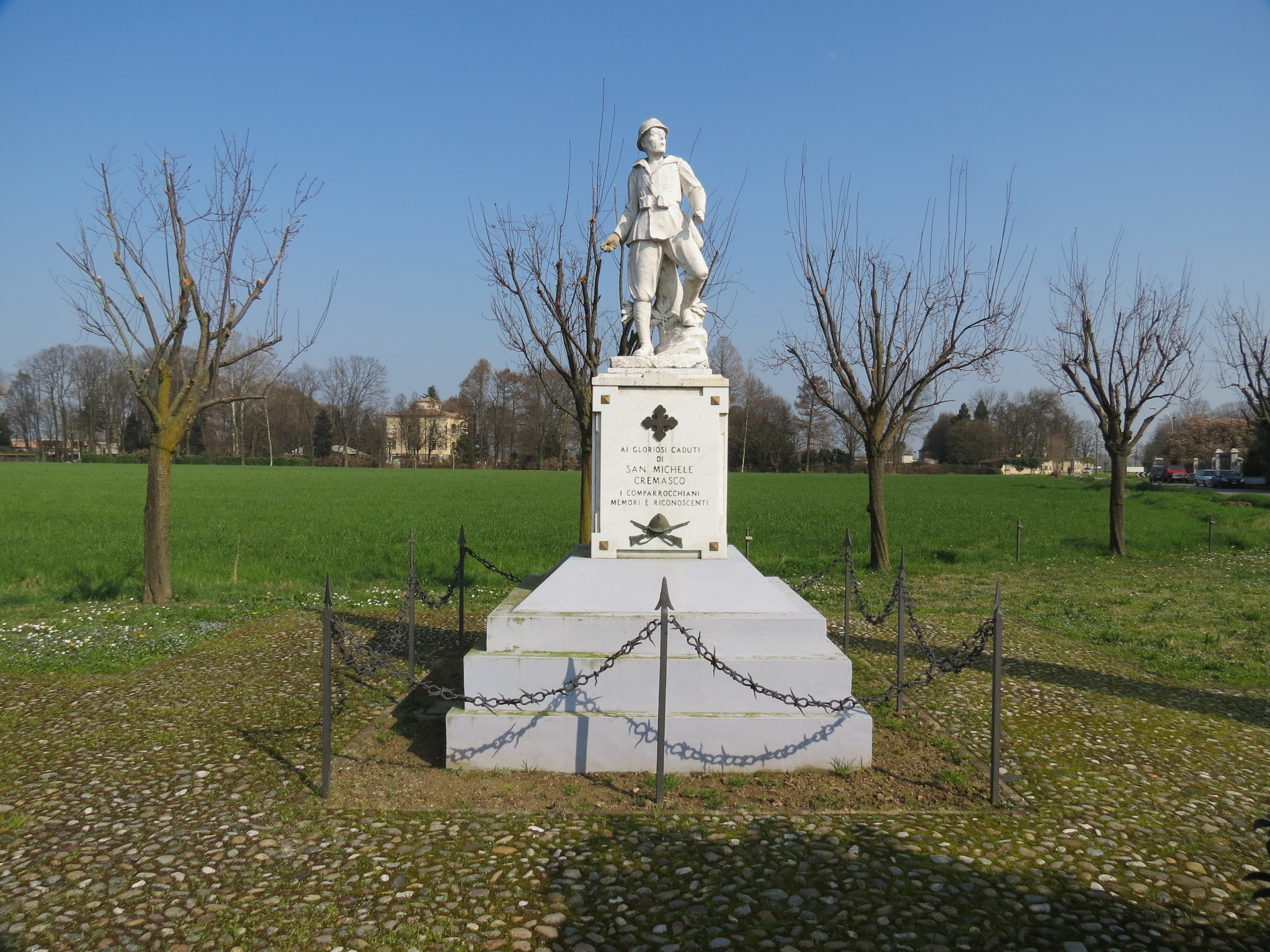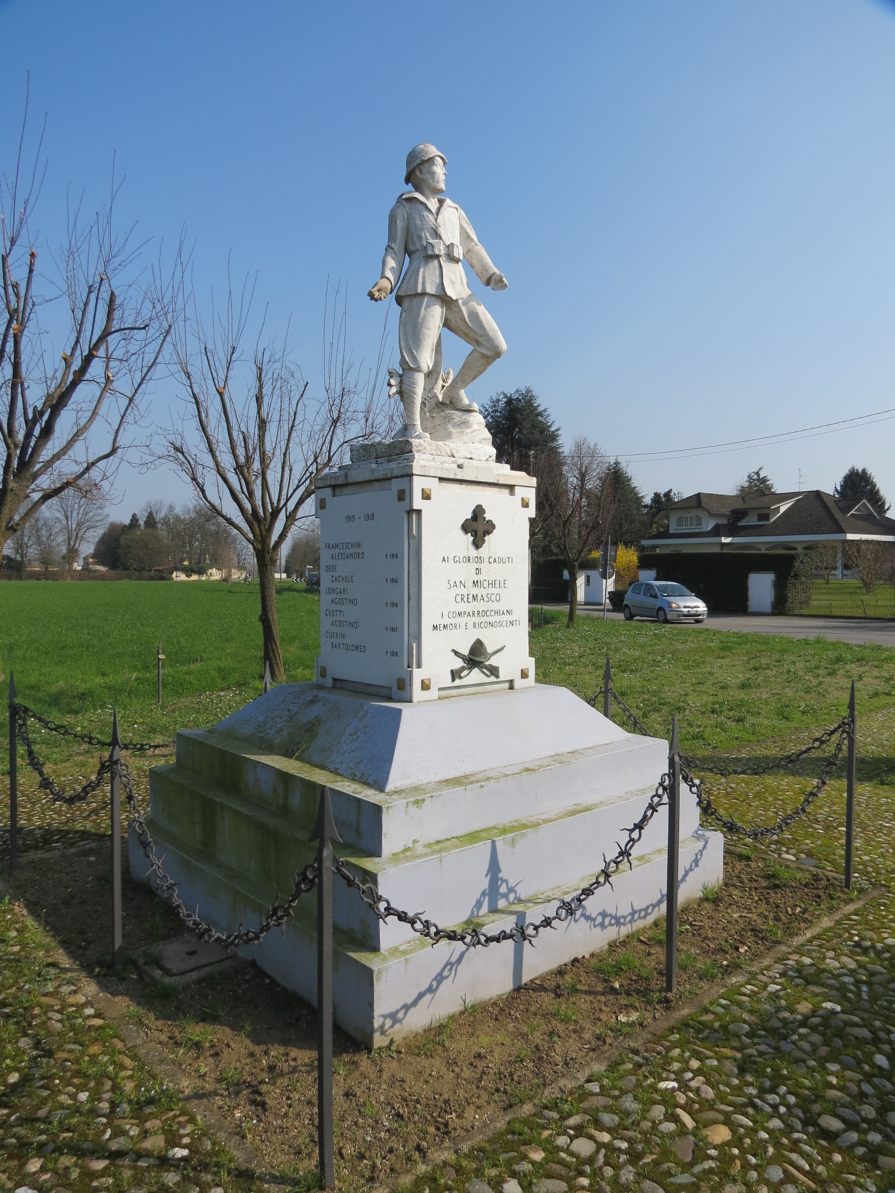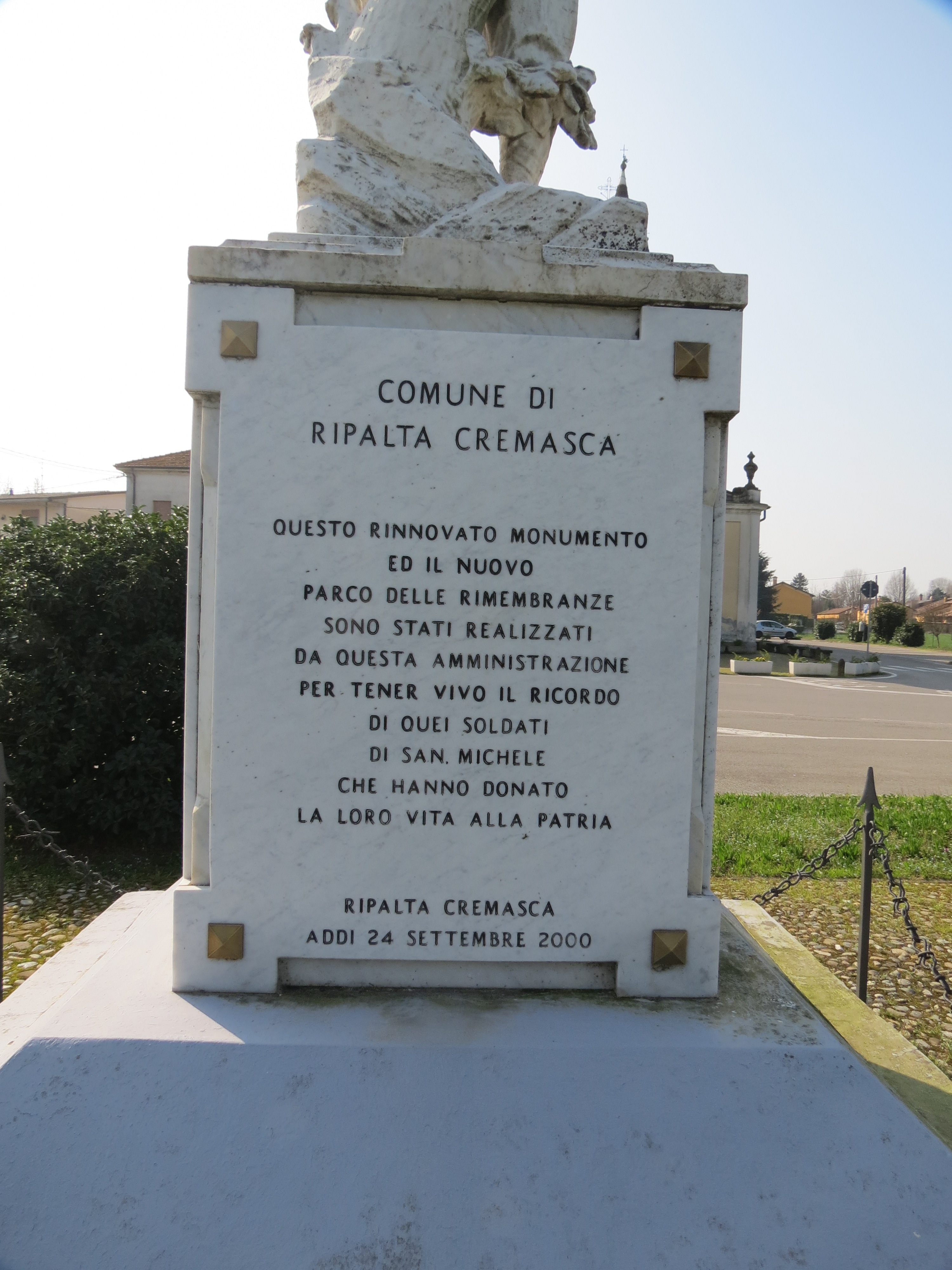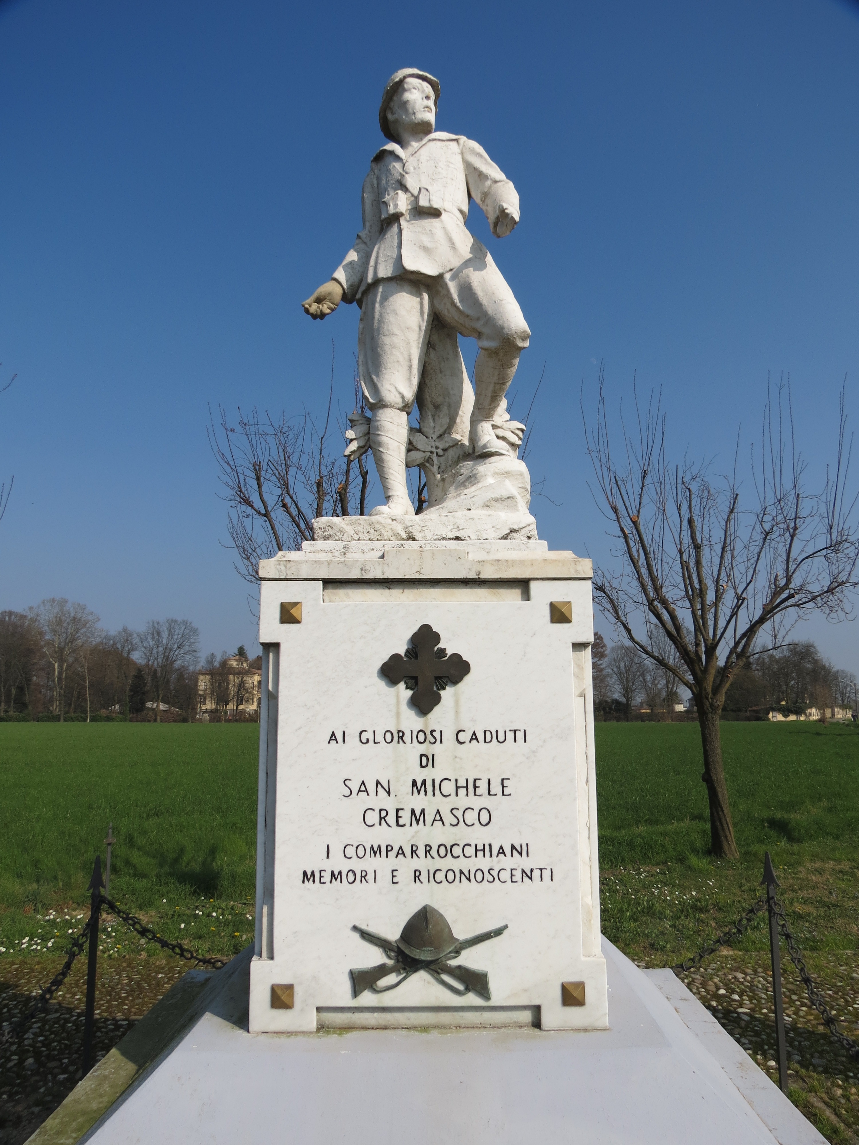 - ISCRIZIONI base della statua, lato frontale - AI GLORIOSI CADUTI/ DI/ SAN MICHELE/ CREMASCO/ I COMPARROCCHIANI/ MEMORI E RICONOSCENTI - a incisione -