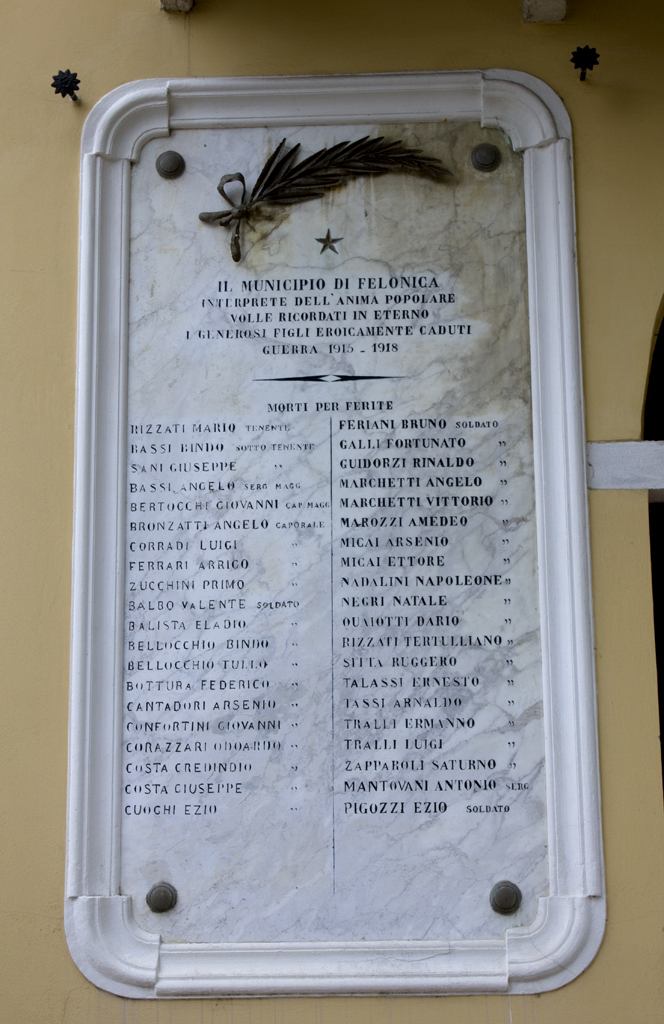 - ISCRIZIONI lapide sinistra - IL MUNICIPIO DI FELONICA/ INTERPRETE DELL’ANIMA POPOLARE/ VOLLE RICORDATI IN ETERNO/ I GENEROSI FIGLI EROICAMENTE CADUTI/ GUERRA 1915 – 1918/ MORTI PER FERITE/ RIZZATI MARIO TENENTE/ BASSI BINDO SOTTOTENENTE/ SANI GIUSEPPE “/ BASSI ANGELO SERG. MAGG./ BERTOCCHI GIOVANNI CAP. MAGG./ BRONZATTI ANGELO CAPORALE/ CORRADI LUIGI “/ FERRARI ARRIGO “/ ZUCCHINI PRIMO “/ BALBO VALENTE SOLDATO/ BALISTA ELADIO “/ BELLOCCHIO BINDO “/ BELLOCCHIO TULLO “/ BOTTURA FEDERICO “/ CANTADORI ARSENIO “/ CONFORTINI GIOVANNI “/ CORAZZARI ODOARDO “/ COSTA CREDINDIO “/ COSTA GIUSEPPE “/ CUOGHI EZIO “/ FERIANI BRUNO SOLDATO/ GALLI FORTUNATO “/ GUIDORZI RINALDO “/ MARCHETTI ANGELO “/ MARCHETTI VITTORIO “/ MAROZZI AMADEO “/ MICAI ARSENIO “/ MICAI ETTORE “/ NADALINI NAPOLEONE “/ NEGRI NATALE “/ QUAIOTTI DARIO “/ RIZZATI TERTULLIANO “/ SITTA RUGGERO “/ TALASSI ERNESTO “/ TASSI ARNALDO “/ TRALLI ERMANNO “/ ZAPPAROLI SATURNO “/ MANOVANI ANTONIO SERG./ PIGOZZI EZIO SOLDATO - capitale - a incisione -