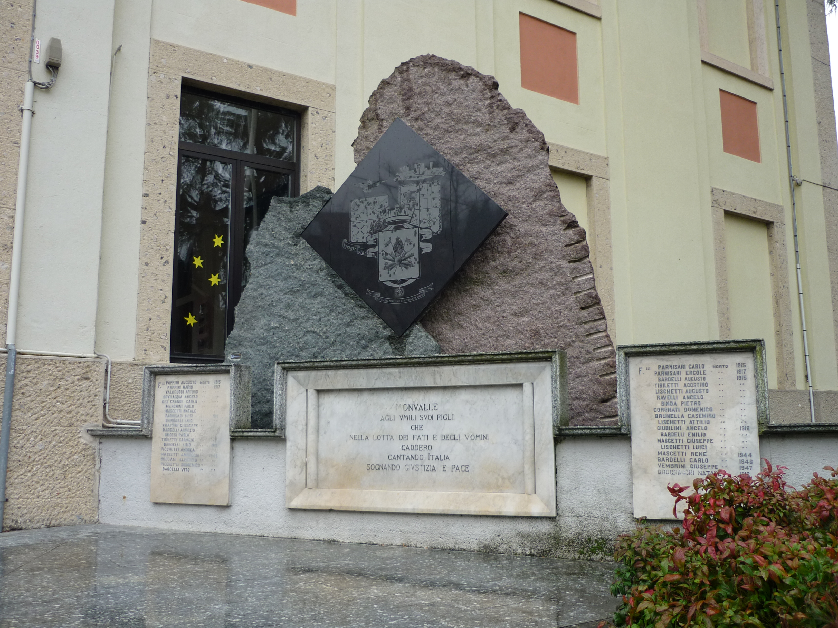 - NOTIZIE STORICO CRITICHE Il monumento è stato rifatto e ricostruito in anni recenti a destra dell’edificio scolastico (scuola primaria “Manzoni”). Le lastre in marmo bianco recanti i nomi dei caduti e l’iscrizione commemorativa provengono dal primo monumento ai caduti (comunicazione orale). Le altre lastre sono state realizzate in tempi recenti dall’azienda F.LLI OSSOLA S.N.C., azienda che si occupa dell’estrazione e lavorazione del marmo e derivati. (Motta Annalisa/ Pozzi Giovanni, Monvalle: una storia antica - Comune di Monvalle 2006 Fedeli Anna Paola/ Castarollo Sara, Valori territoriali: beni architettonici e storici: medio verbano: Brebbia, Laveno Mombello, Leggiuno, Monvalle - Busto Arsizio, Alfa, 2008)