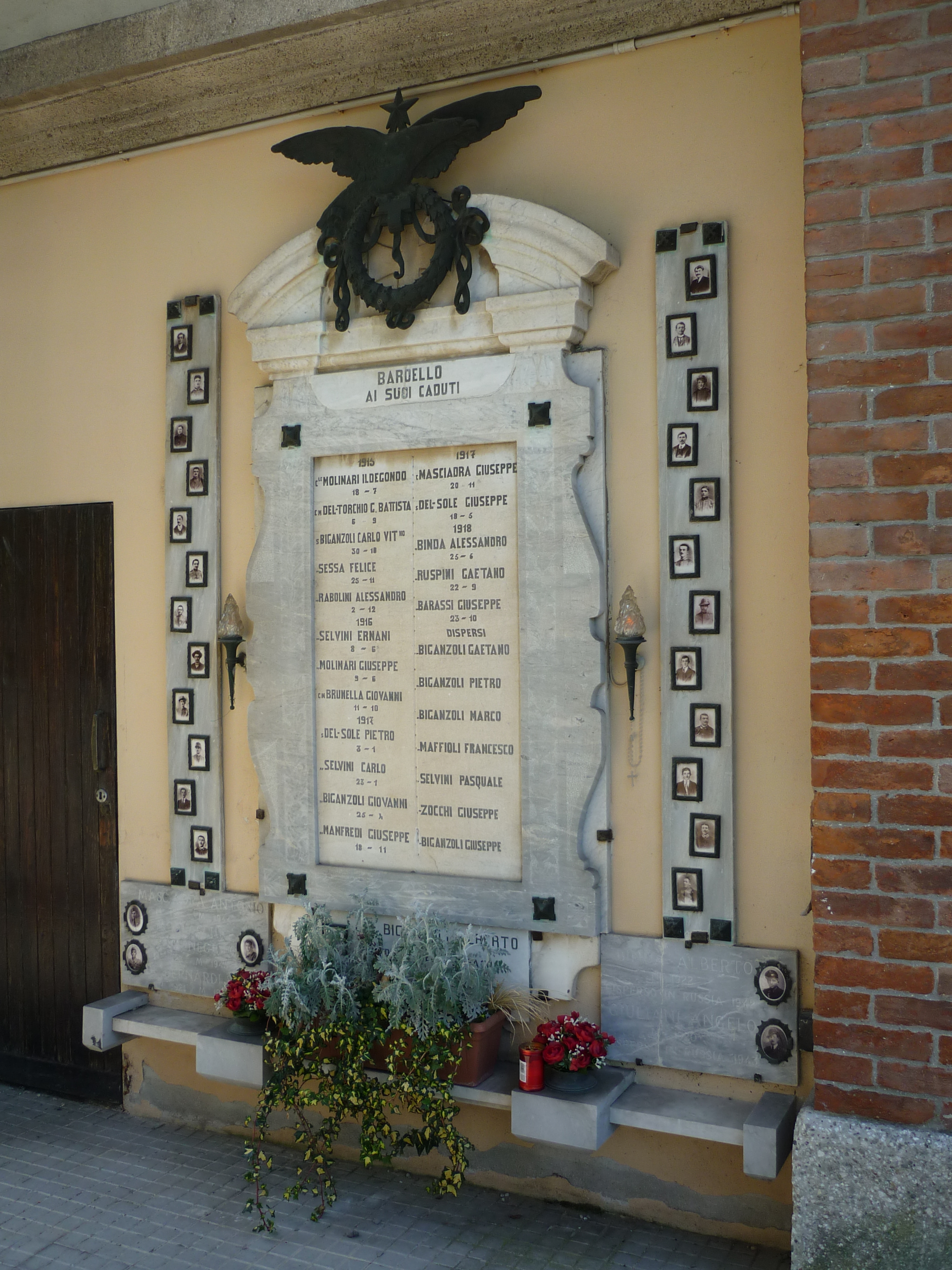 Monumento a lapide dedicato ai caduti della prima e della seconda guerra mondiale; compare la lista dei caduti. Le lapidi inferiori recanti i nomi dei caduti della seconda guerra mondiale e della Spagna sono state aggiunte successivamente. Accanto al nome di ogni caduto è presente la relativa fotografia. Monumento costituito da una edicola sagomata lateralmente, terminante nella parte superiore con un frontone curvilineo spezzato nella parte centrale dove è presente un gruppo scultoreo in bronzo raffigurante un’aquila ad ali spiegate, allegoria della Vittoria, poggiante su una corona d’alloro