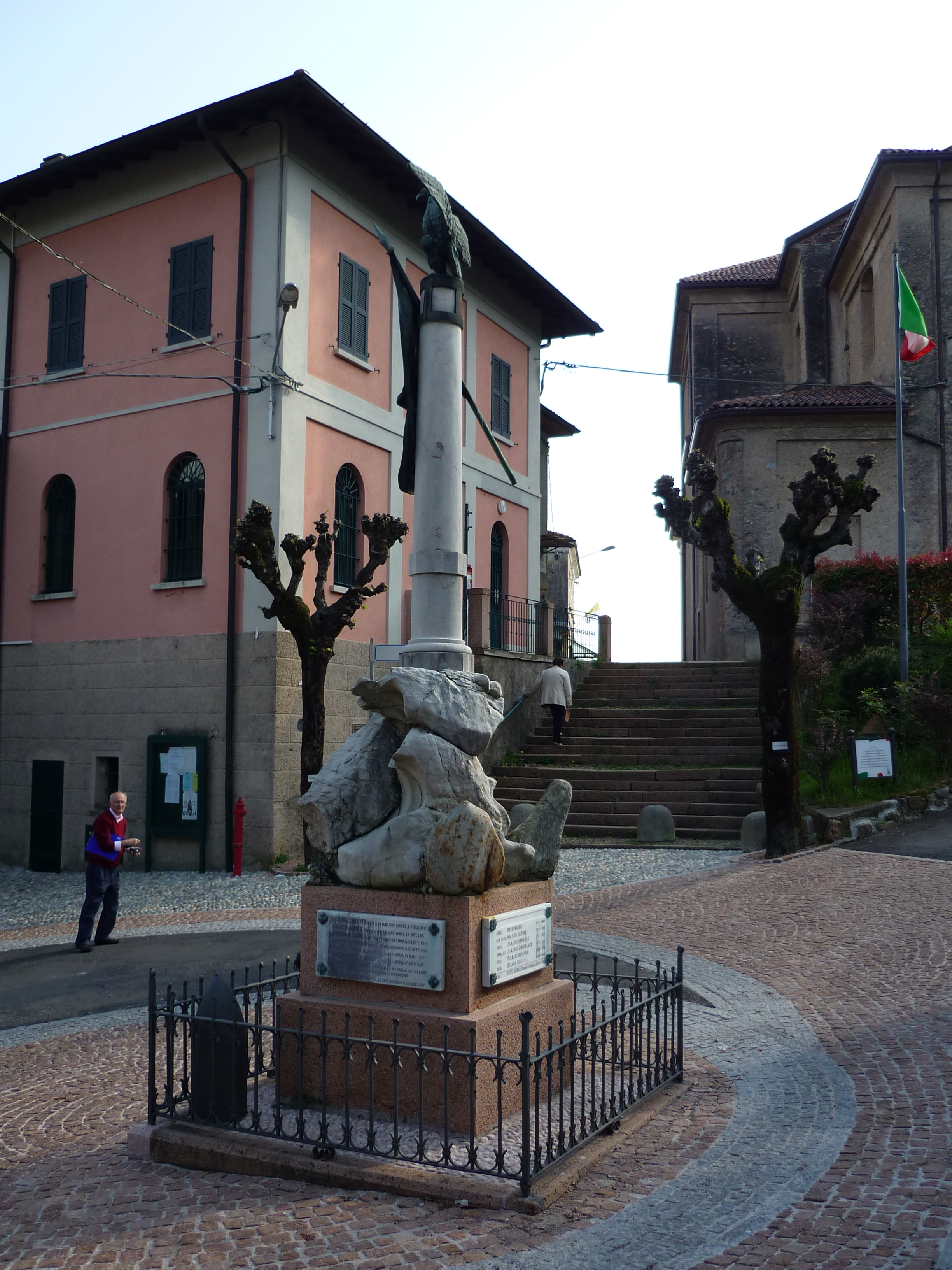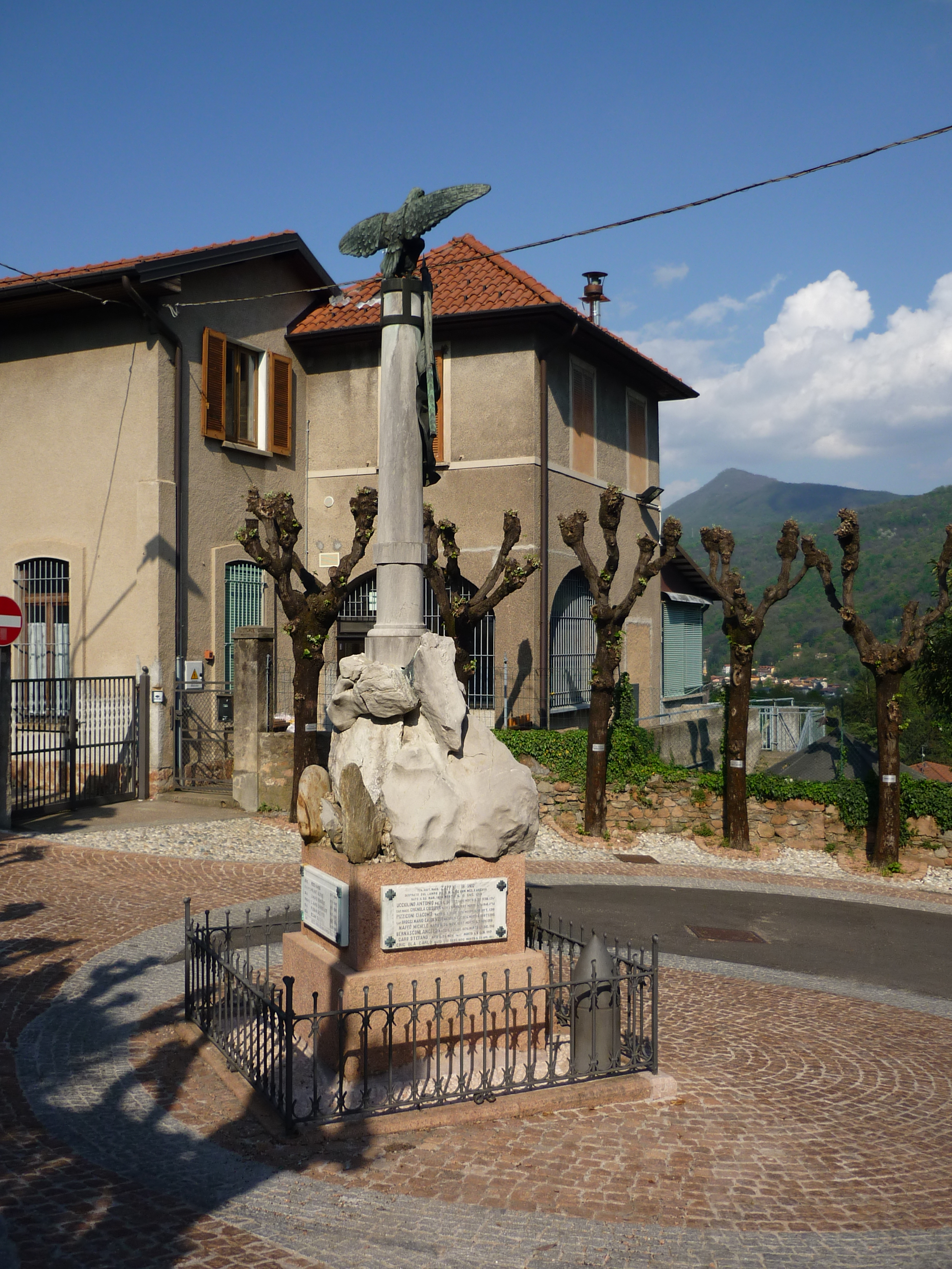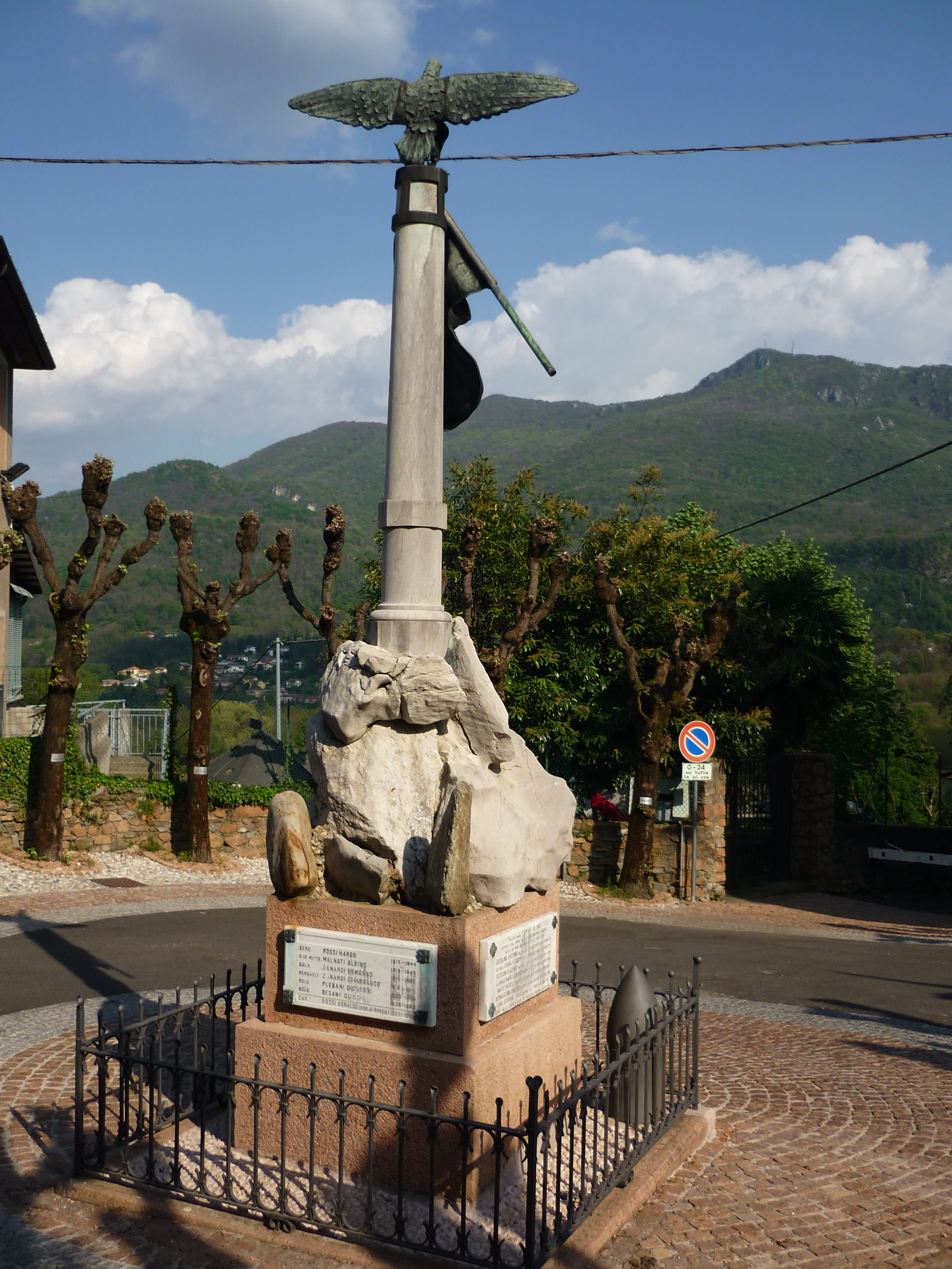 Monumento dedicato ai caduti della prima e della seconda guerra mondiale; compare la lista dei caduti. Composto da un basamento in porfido rosso di Cuasso al Monte, colonna in pietra terminante nella parte superiore con un gruppo scultoreo in bronzo raffigurante un’aquila ad ali spiegate, allegoria della Vittoria, e una bandiera. L’area del monumento è delimitata da una bassa recinzione in ferro battuto