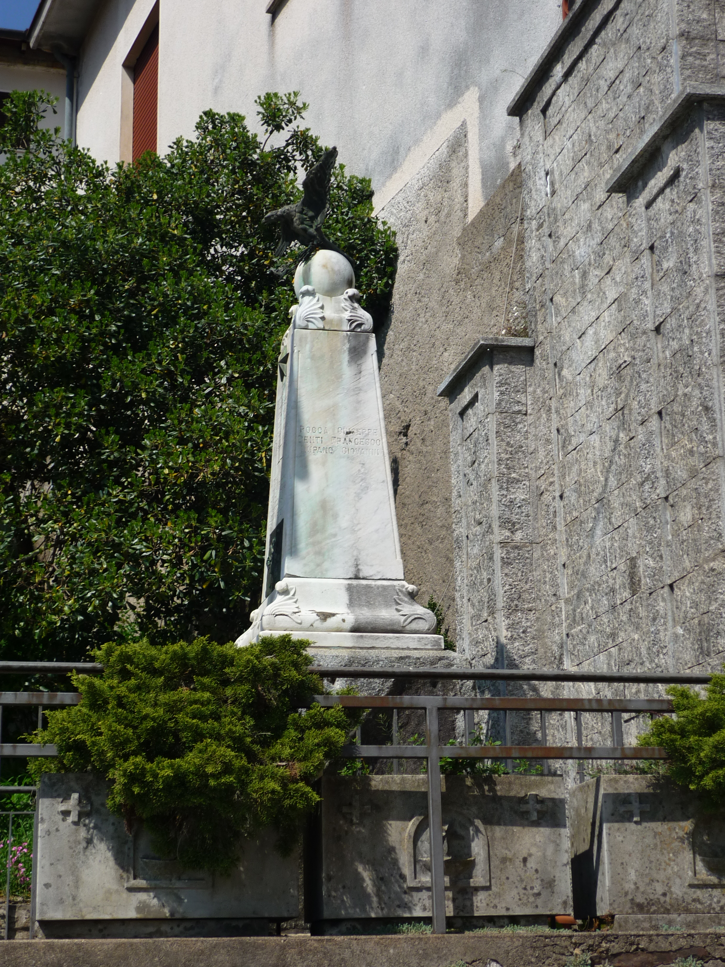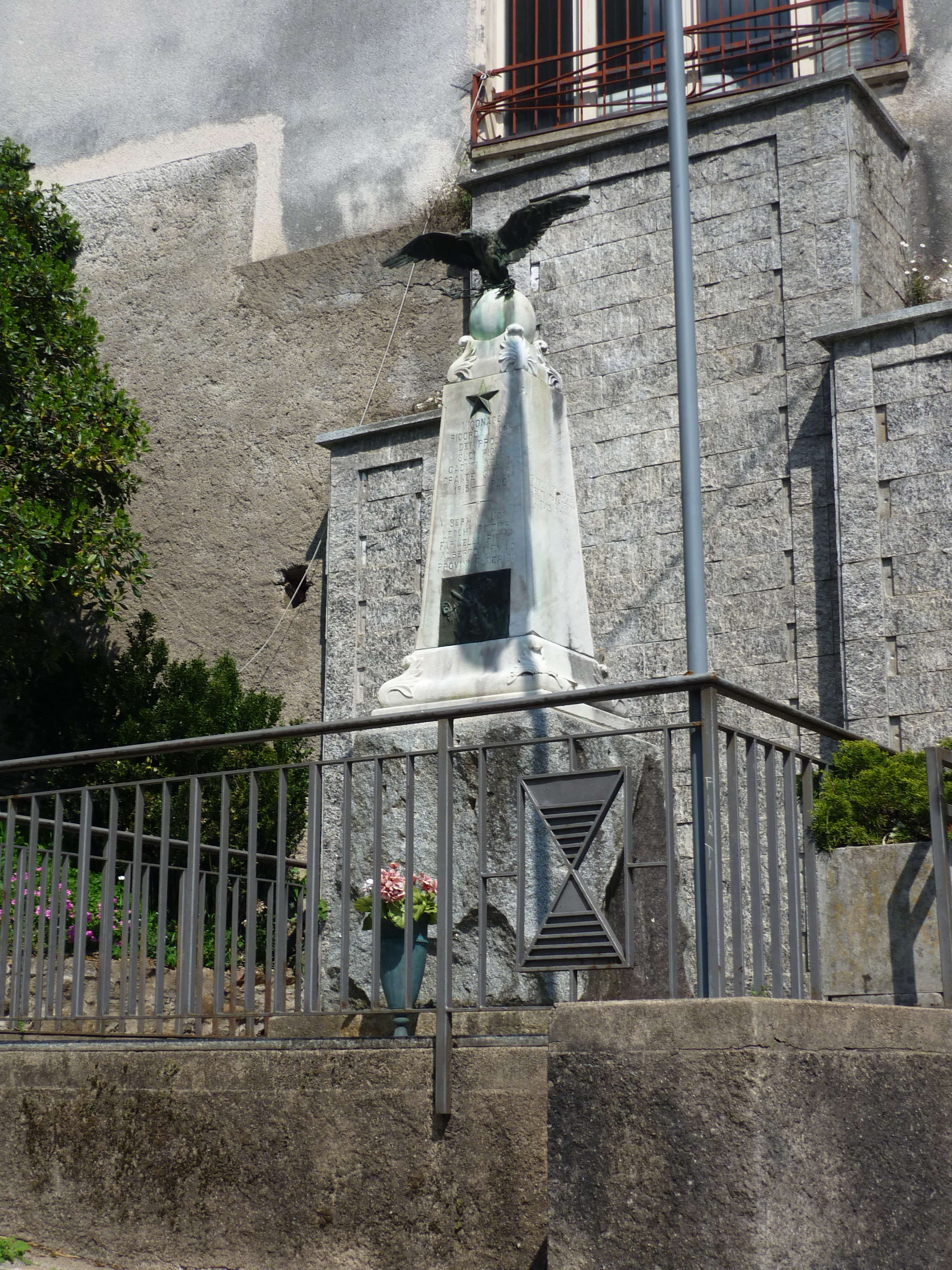 Monumento dedicato ai caduti della prima e della seconda guerra mondiale; compare la lista dei caduti. L’area del monumento è delimitata da una recinzione in ferro con cancelletto. Basamento in pietra sul quale poggia l’obelisco in marmo; nella parte superiore è presente l’aquila ad ali spiegate in bronzo, allegoria della Vittoria