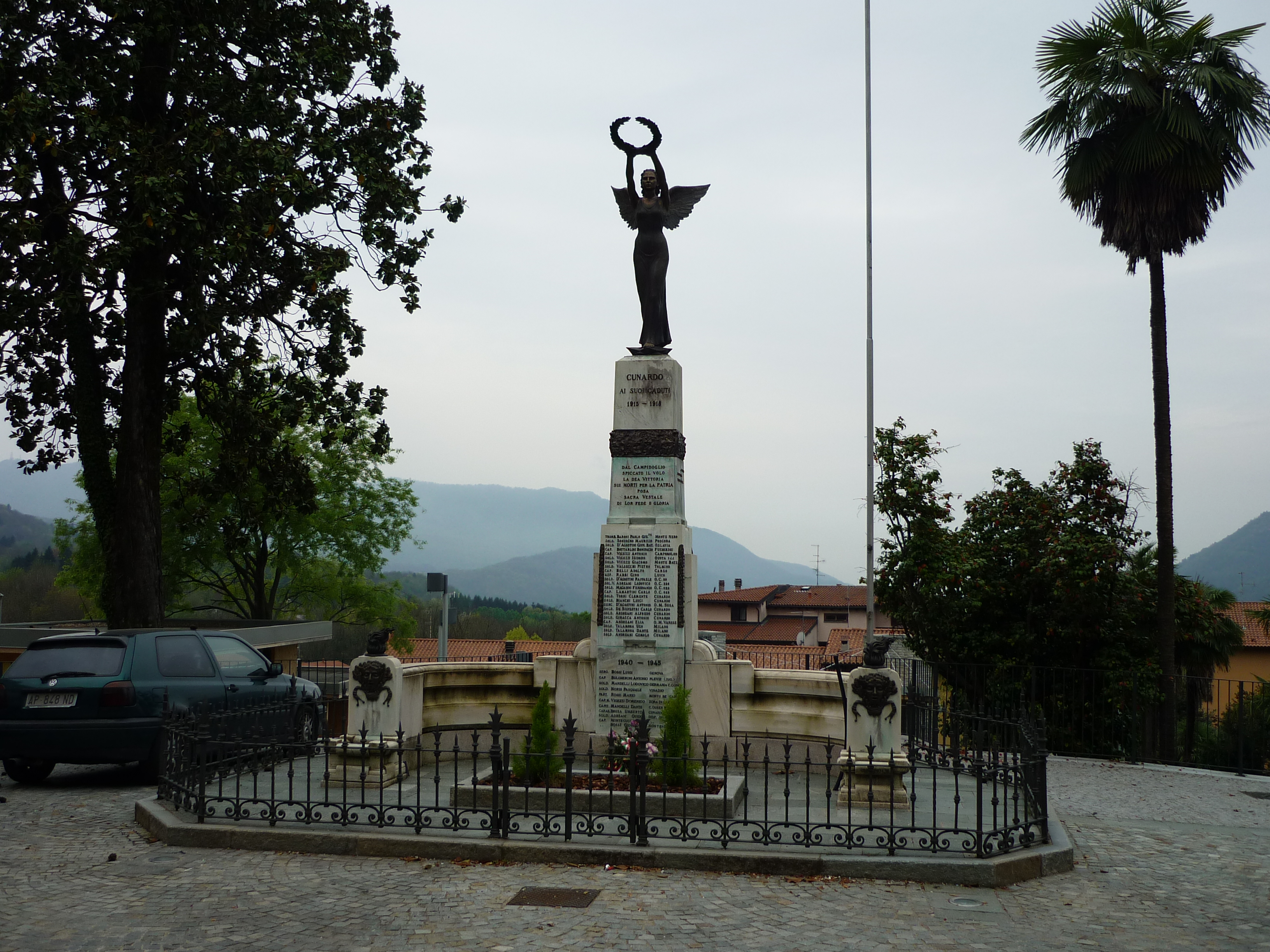 - NOTIZIE STORICO CRITICHE Giugno 1921: inaugurazione del monumento ai caduti di Cunardo. Il marmo e la statua in bronzo sono stati lavorati negli Stati Uniti d’America per opera di un artista originario di Ganna ed emigrato ad inizio secolo negli U.S.A. Si tratta di J.G. Sassi (il marmo, il bronzo, ma anche la modella dell'opera sono 100 % americani). Purtroppo la statua originale venne rifusa durante l’ultimo conflitto mondiale per scopi bellici; la copia che vediamo ora, quasi simile, venne inaugurata il 22 ottobre 1961 ed è opera dello scultore Giorgio Galletti di Muggiò. Giorgio Galletti: nasce a Desio nel 1934; il padre è capo marmista del Duomo di Milano, così sin da giovane si avvicina all'arte. Dal 1948, infatti, incomincia ad apprendere i primi rudimenti che costituiranno la base di un mestiere che non avrebbe mai più abbandonato. I suoi primi lavori, eseguiti nella bottega del padre, sono notati dallo scultore Malerba, che capisce immediatamente le doti del ragazzo e suggerisce al padre - che sarà favorevole - di iscrivere Giorgio all'Accademia di Brera. La passione per l'arte coinvolge totalmente il ragazzo. In questi anni conosce Marchini, Soli e Paiella; a Monza frequenta Manfrini. Approfondisce la tecnica del bronzo lavorando come ritoccatore di cere presso importanti fonderie artistiche. In una di queste, la Fonderia Battaglia di Milano (tra le più importanti), carpisce i segreti delle diverse "mani" di artisti importanti. Nel 1955 conosce lo scultore Francesco Messina, diventandone collaboratore e amico. Agli inizi degli anni Sessanta, ormai noto e stimato nell'ambiente artistico, decide di continuare in proprio l'attività di scultore. Delle sue più significative opere ricordiamo il monumento ai Caduti a Cunardo (Varese), quello all’alpino a Tradate (Varese), il monumento a Giovanni Paolo II nel santuario della Madonna di Czestochowa in Dozio, il monumento ai Caduti di Castiglione Olona (Varese), i portali delle chiese di Sant'Eusebio a Sesona di Vergiate (Varese), di San Giovanni Evangelista ad Albiate (Milano), di Nasca sul Lago Maggiore, di Cesate (Milano), di Garbagnate (Milano), il gruppo in marmo della facciata della chiesa di Muggiò. Tra le singole opere in bronzo, pregevoli sono: Luna, Dondolo, Regina, Riconciliazione, Vele della Chiesa, Seminatore, Serena, e varie Maternità. Attualmente vive e lavora a Muggiò (Milano). Quella di Galletti è una storia tutta lombarda, innestata nella più grande cultura che ha nel lavoro e nell'operosità la sua espressione più alta; è uno scultore che conosce bene le tecniche del suo lavoro, capace di seguire ogni passaggio della fusione in bronzo. Ed è anche artista di grande inventiva iconografica, che sa interpretare la tradizione e darle forma originale. Ciò che muove Galletti è la passione per il proprio lavoro, unita alla precisione tecnica. (Giorgio Galletti: l'estetica del lavoro - Milano Regione Lombardia 2011; Bossi Roberto/ Brenga Jolanda/ Polita Gabriele, Cunardo, immagini nel tempo cuma te sèvat bel Cunard - 2011)
