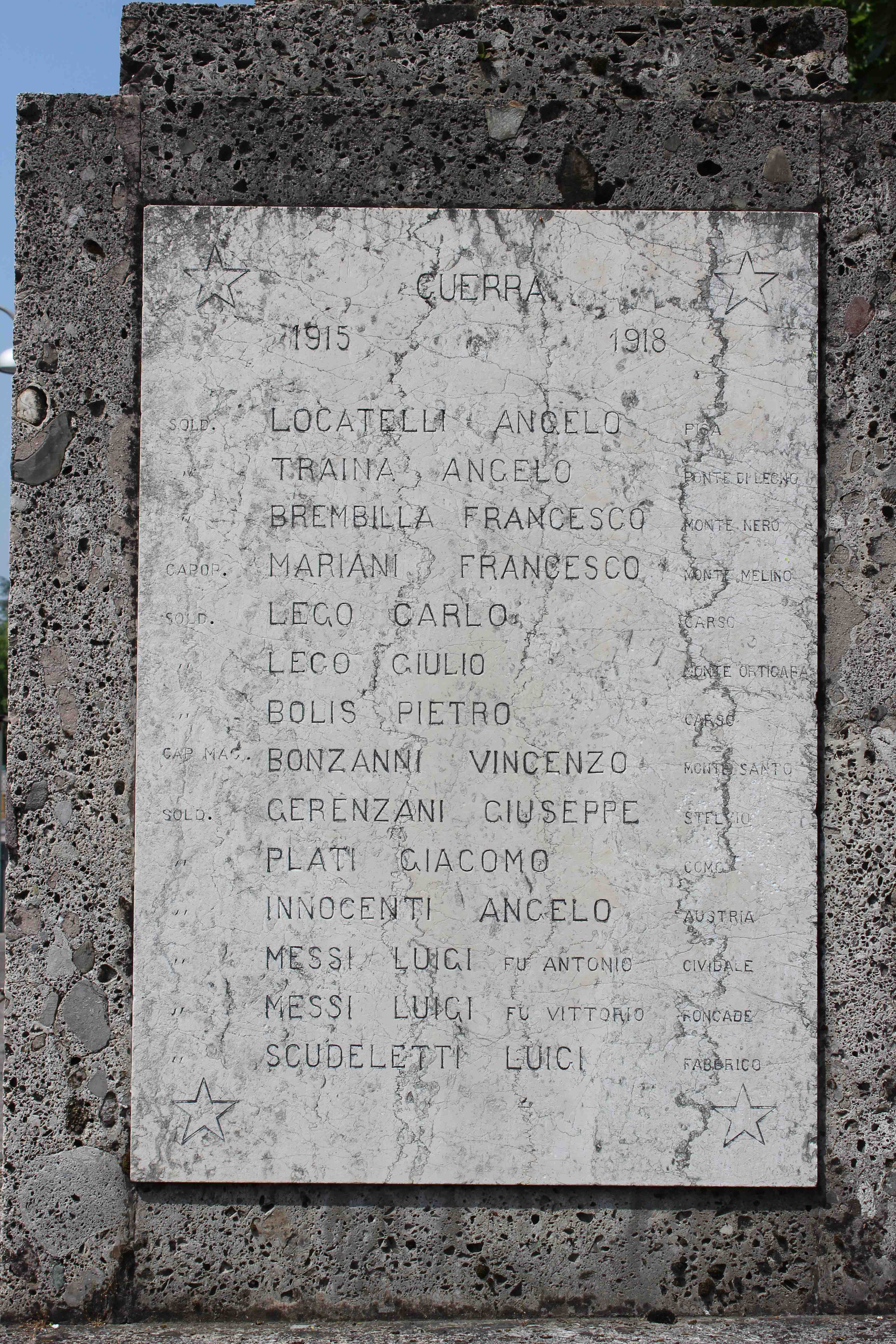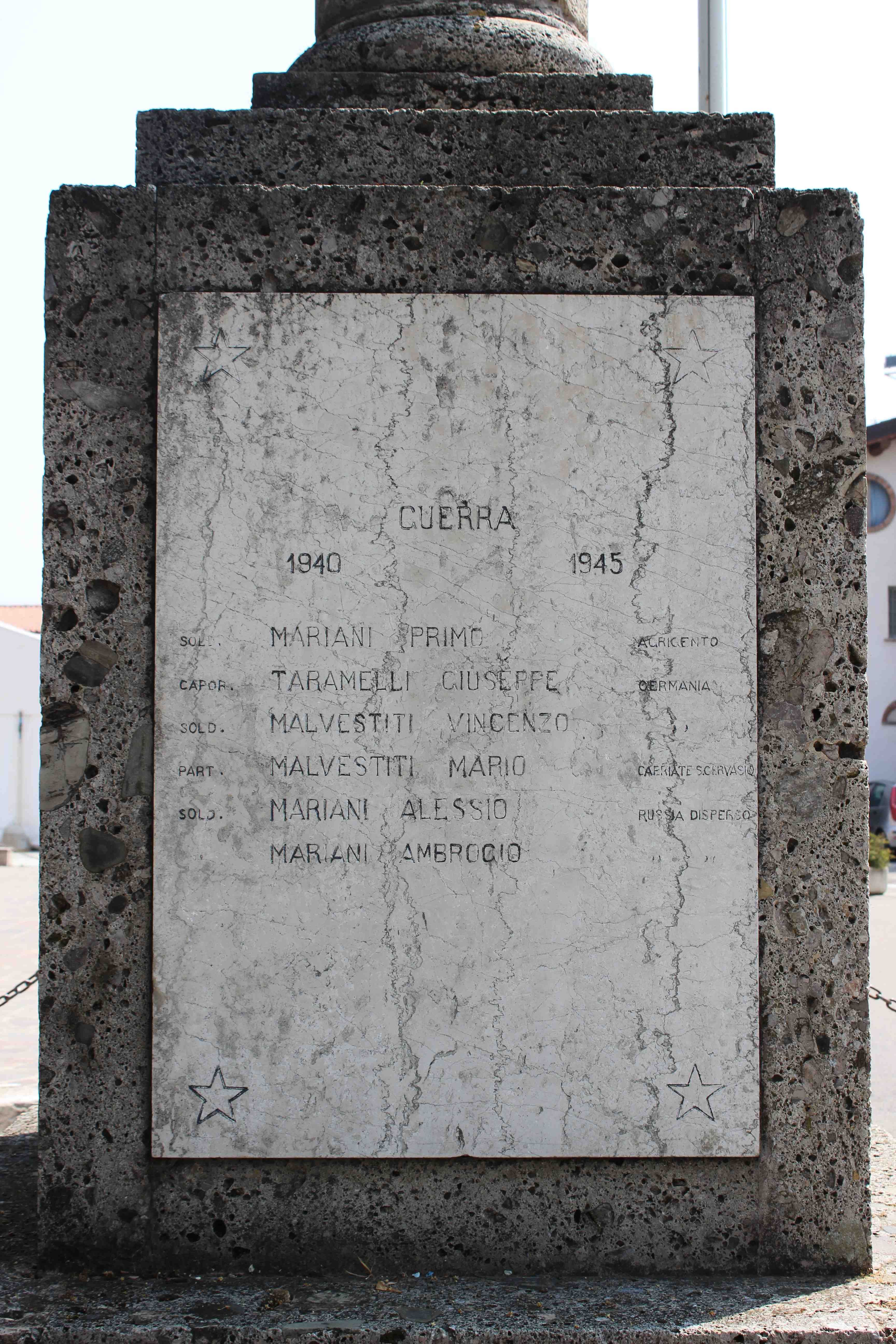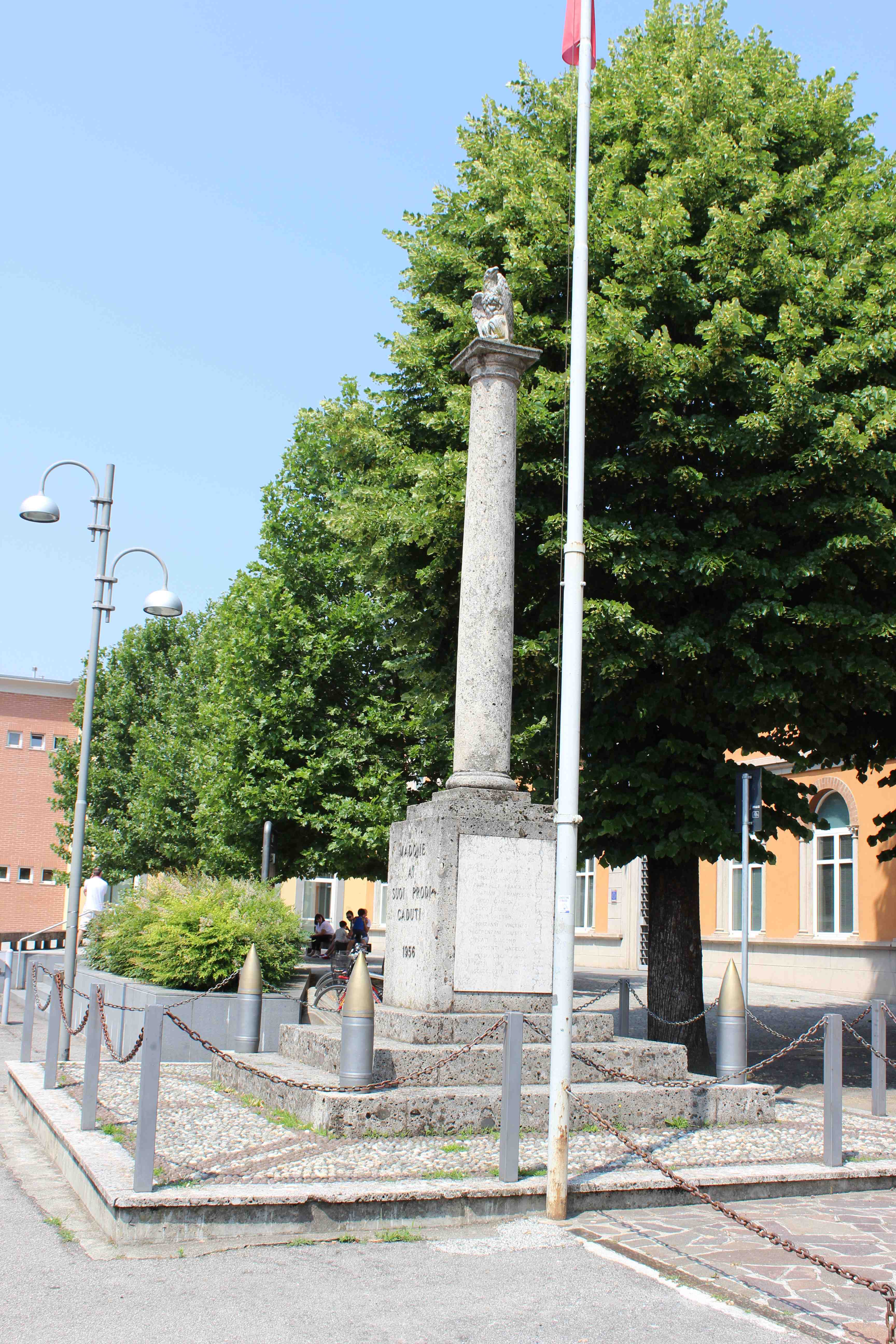 Monumento ai caduti a colonna sormontata da un'aquila. Il perimetro del monumento è delimitato da una catena di ferro con pilastri a forma di proiettile. Sui fianchi del basamento sono le lapidi con l'elenco dei nomi