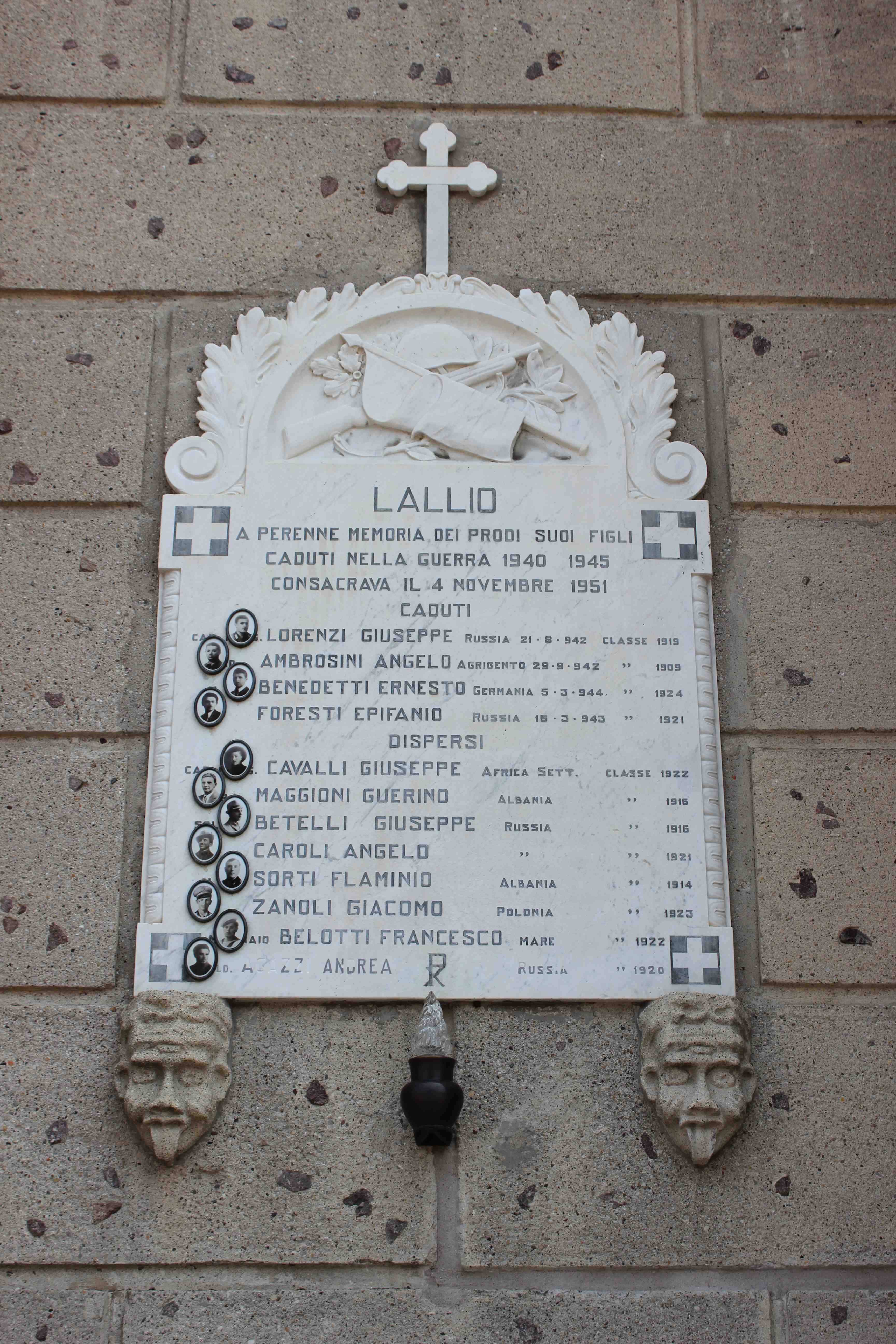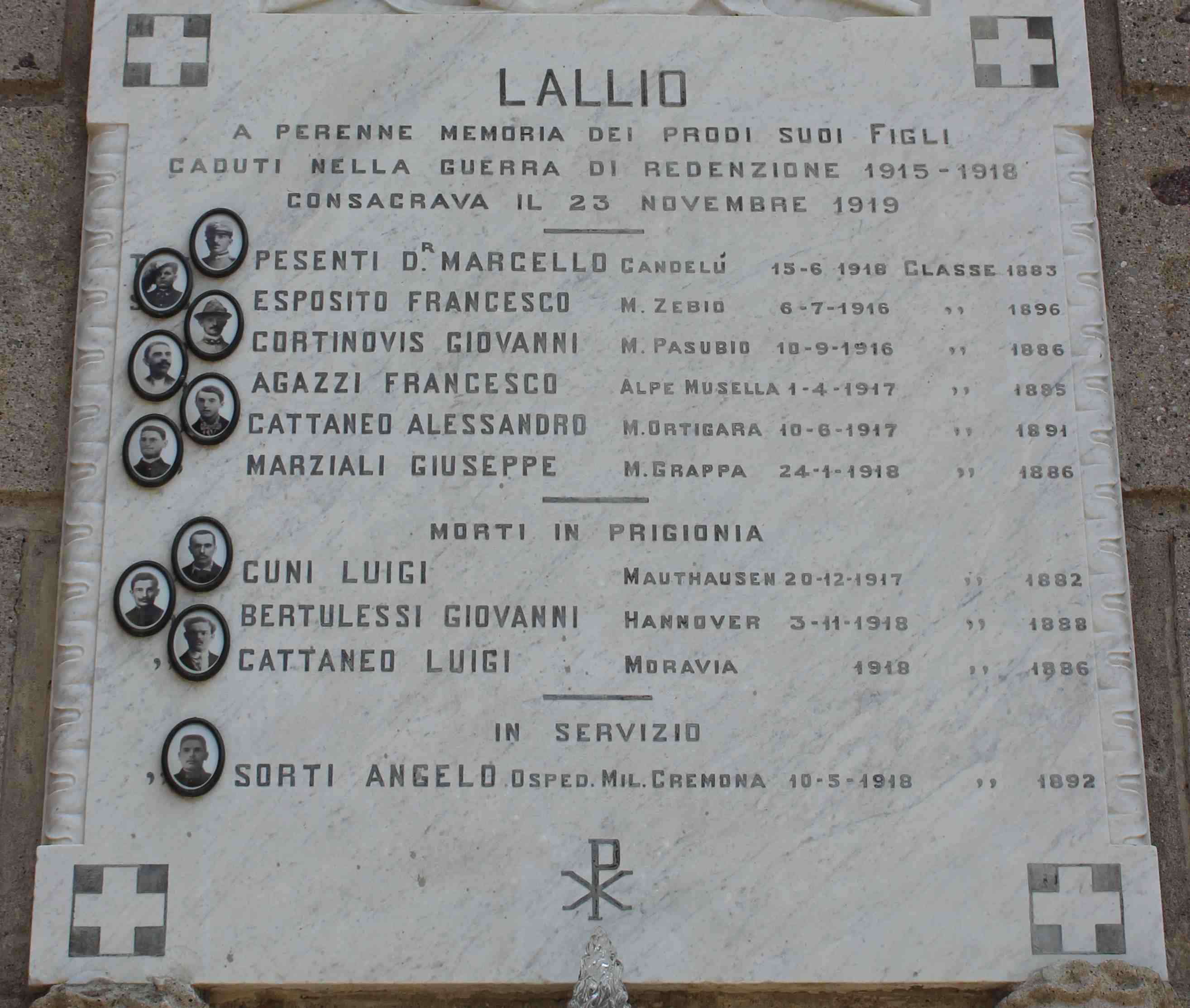 - ISCRIZIONI sulla lapide - LALLIO / A PERENNE MEMORIA DEI PRODI SUOI FIGLI / CADUTI NELLA GUERRA DI REDENZIONE 1915-1918 / CONSACRAVA IL 23 NOVEMBRE 1919 / PESENTI DR. MARCELLO CANDELÙ 15-6-1916 CLASSE 1893 / ESPOSITO FRANCESCO M.ZEBIO 6-7-1916 “ 1896 / CORTINOVIS GIOVANNI M.PASUBIO 10-9-1916 “ 1896 / AGAZZI FRANCESCO ALPE MUSELLA 1-4-1917 “ 1885 / CATTANEO ALESSANDRO M.ORTIGARA 10-6-1917 “ 1891 / MARZIALI GIUSEPPE M.GRAPPA 24-1-1918 “ 1886 / MORTI IN PRIGIONIA / CUNI LUIGI MAUTHAUSEN 20-12-1917 “ 1882 / BERTULESSI GIOVANNI HANNOVER 3-11-1918 “ 1888 / CATTANEO LUIGI MORAVIA 1918 ” 1886 / IN SERVIZIO / SORTI ANGELO OSPED. MIL.CREMONA 10-5-1918 “ 1892 - capitale - a incisione -