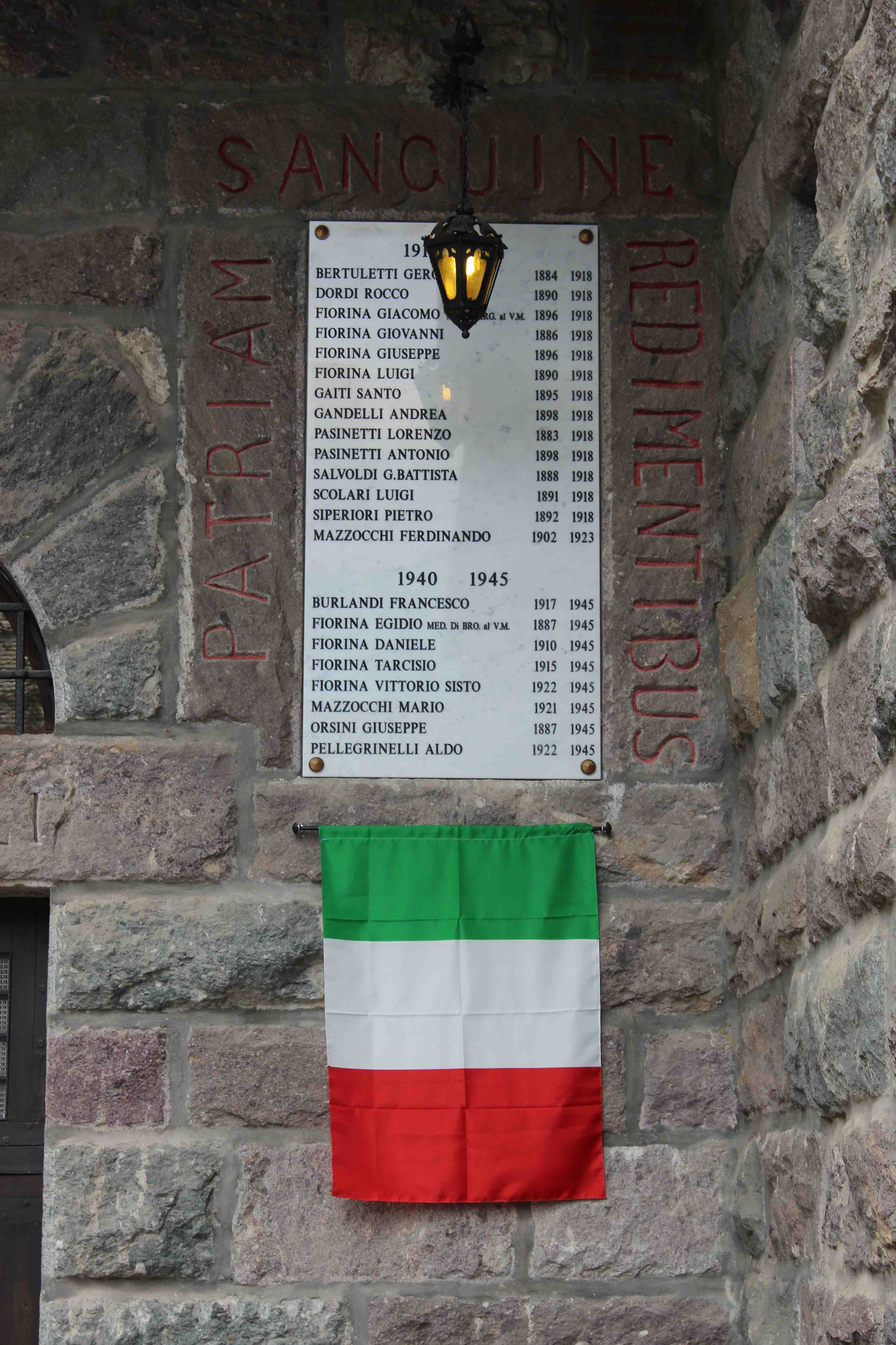 - ISCRIZIONI sulla lapide - 1915 1918 / BERTULETTI GEROLAMO 1884 1918 / DORDI ROCCO 1890 1918 / FIORINA GIAOCMO MED. D'ARG AL V. M. / 1896 1918 / FIORINA GIOVANNI 1886 1918 / FIORINA GIUSEPPE 1896 1918 / FIORINA LUIGI 1890 1918 / GAITI SANTO 1895 1918 / GANDELLI ANDREA 1898 1918 / PASINETTI LORENZO 1883 1918 / SALVOLDI G. BATTISTA 1888 1918 / SCOLARI LUIGI 1891 1918 / SIPERIORI PIETRO 1892 1918 / MAZZOCCHI FERDINANDO 1902 1923 / 1940 1945 / BURLANDI FRANCESCO 1917 1945 / FIORINA EGIDIO MED. DI BRO. AL V.M. 1887 / 1945 / FIORINA DANIELE 1910 1945 / FIORINA TARCISIO 1915 1945 / FIORINA VITTORIO SISTO 1922 1945 / MAZZOCCHI MARIO 1921 1945 / ORSINI GIUSEPPE 1887 1945 / PELLEGRINELLI ALDO 1922 1945 - capitale - a incisione - italiano