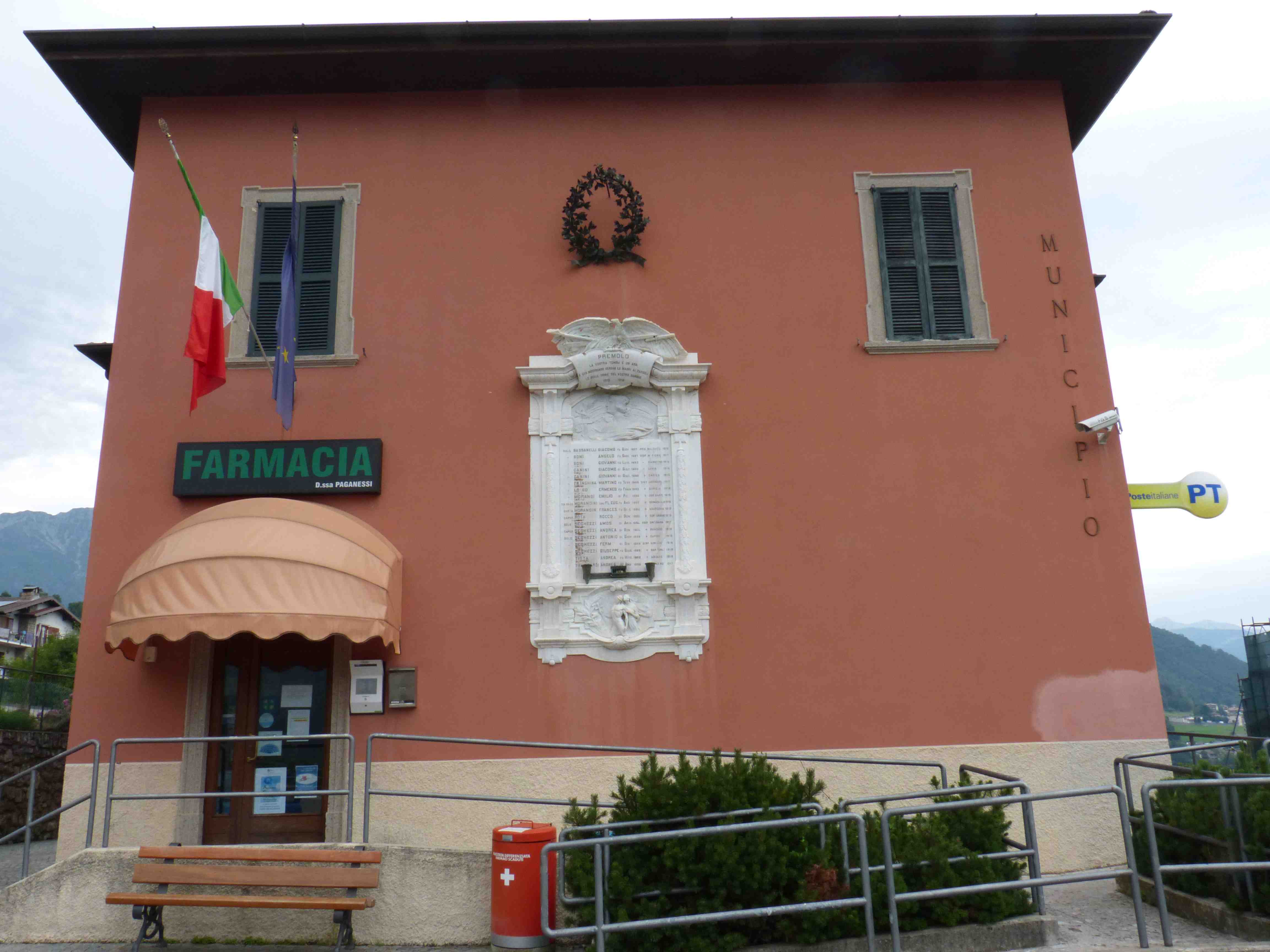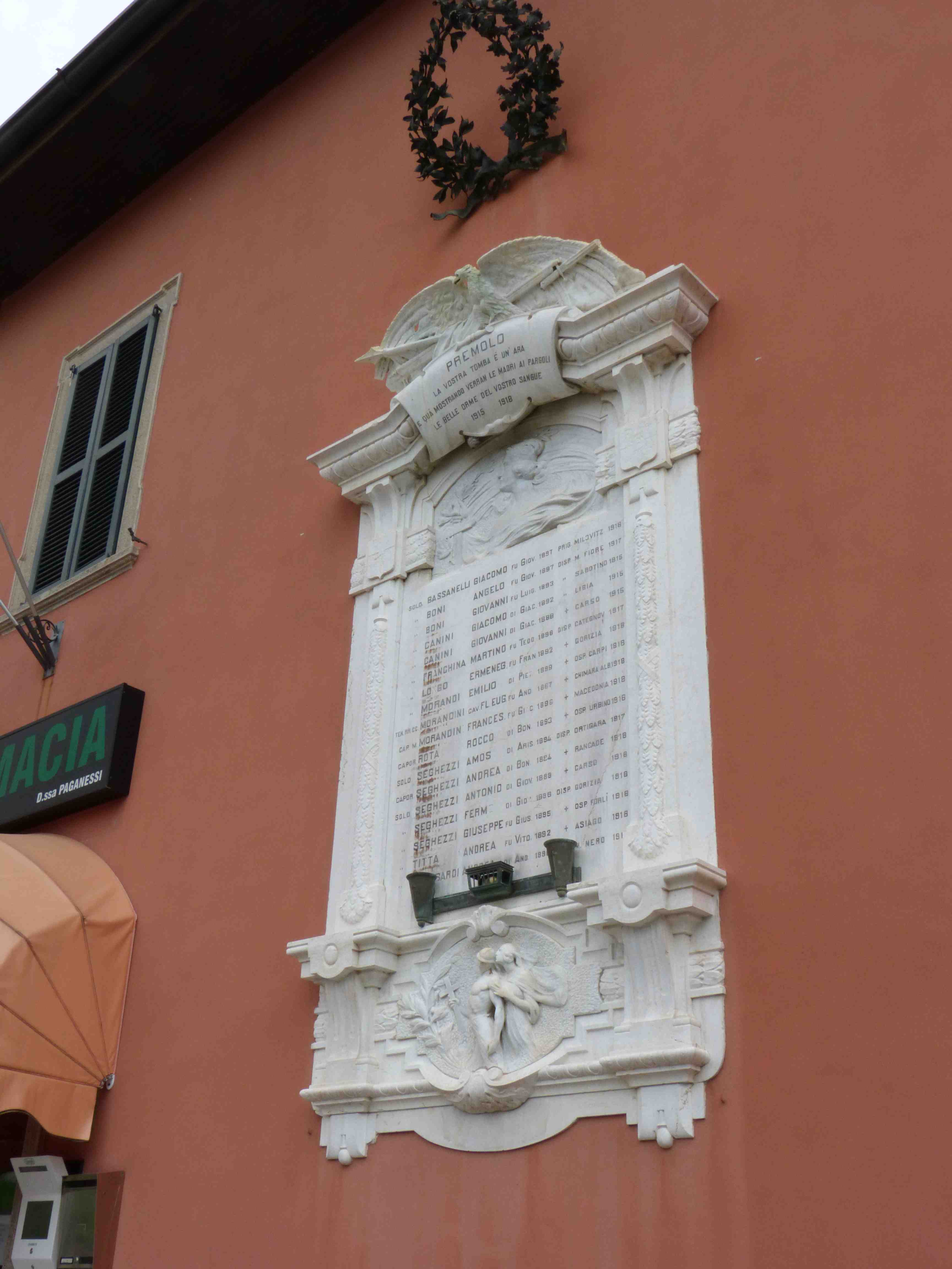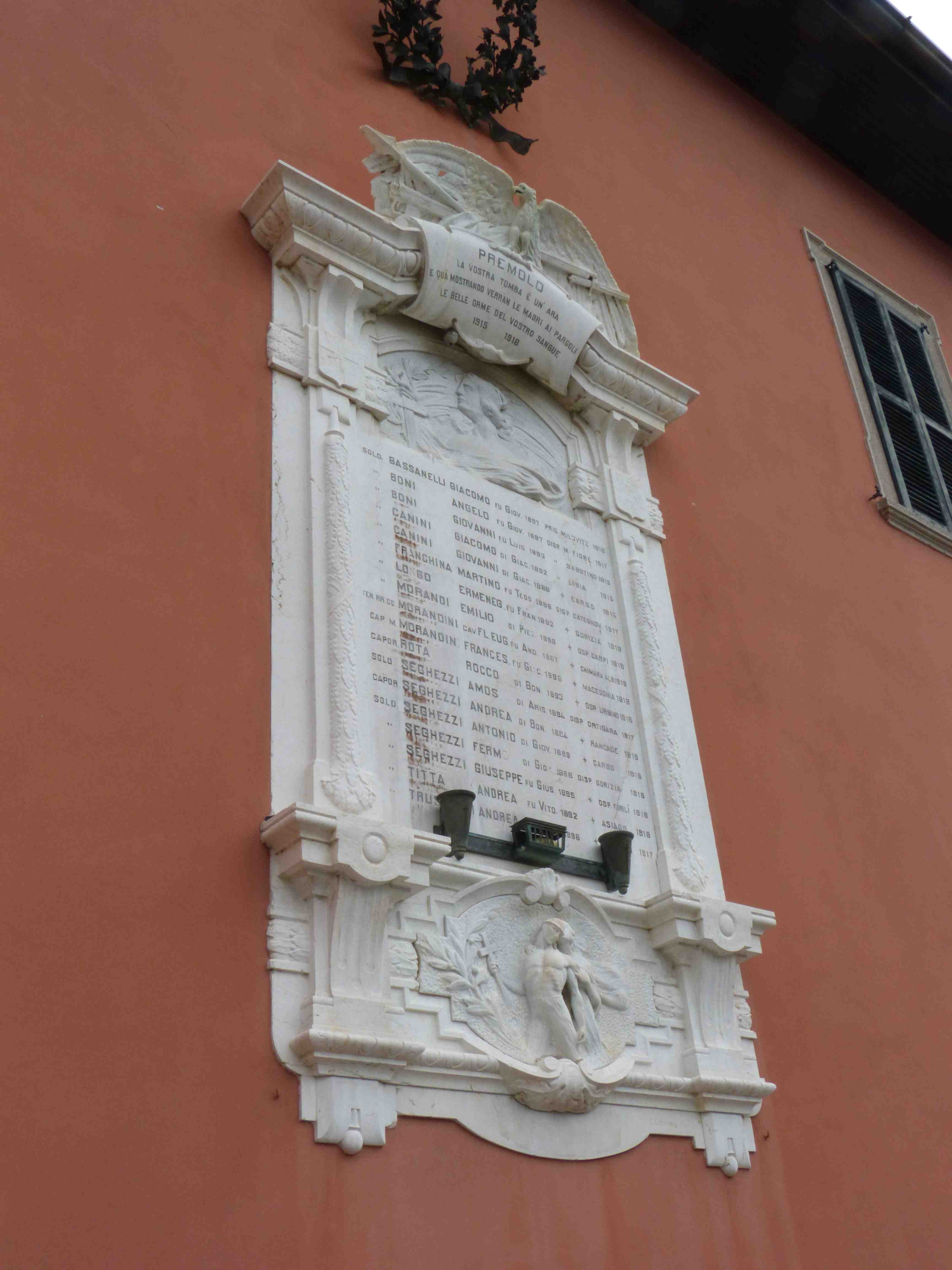 - ISCRIZIONI in alto - PREMOLO/ LA VOSTRA TOMBA È UN’ ARA / E QUÁ MOSTRANDO VERRAN LE MADRI AI PARGOLI / LE BELLE ORME DEL VOSTRO SANGUE / 1915 1918 - capitale - a incisione -