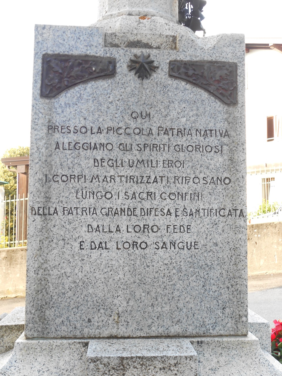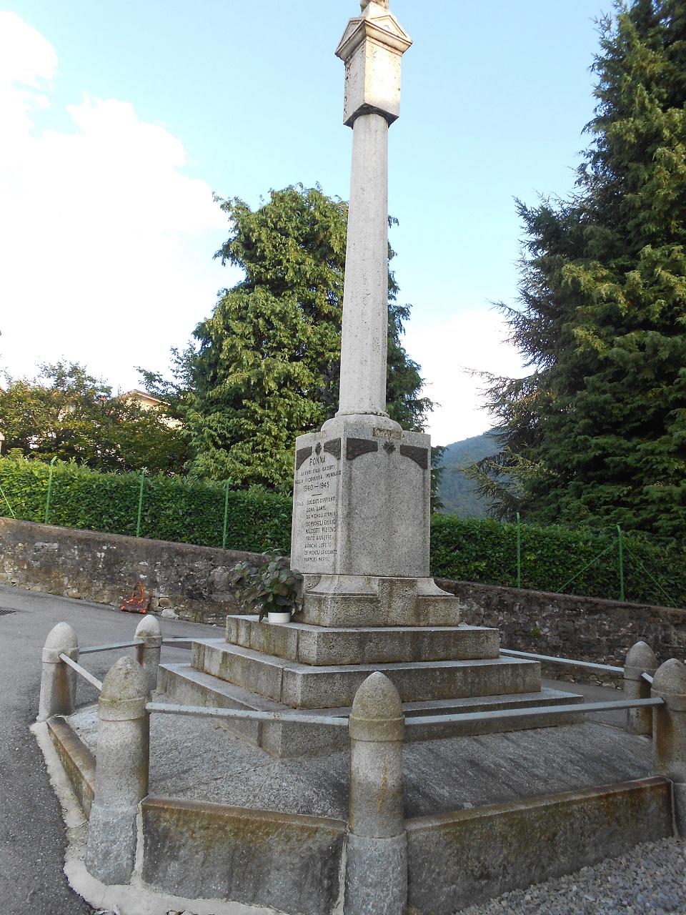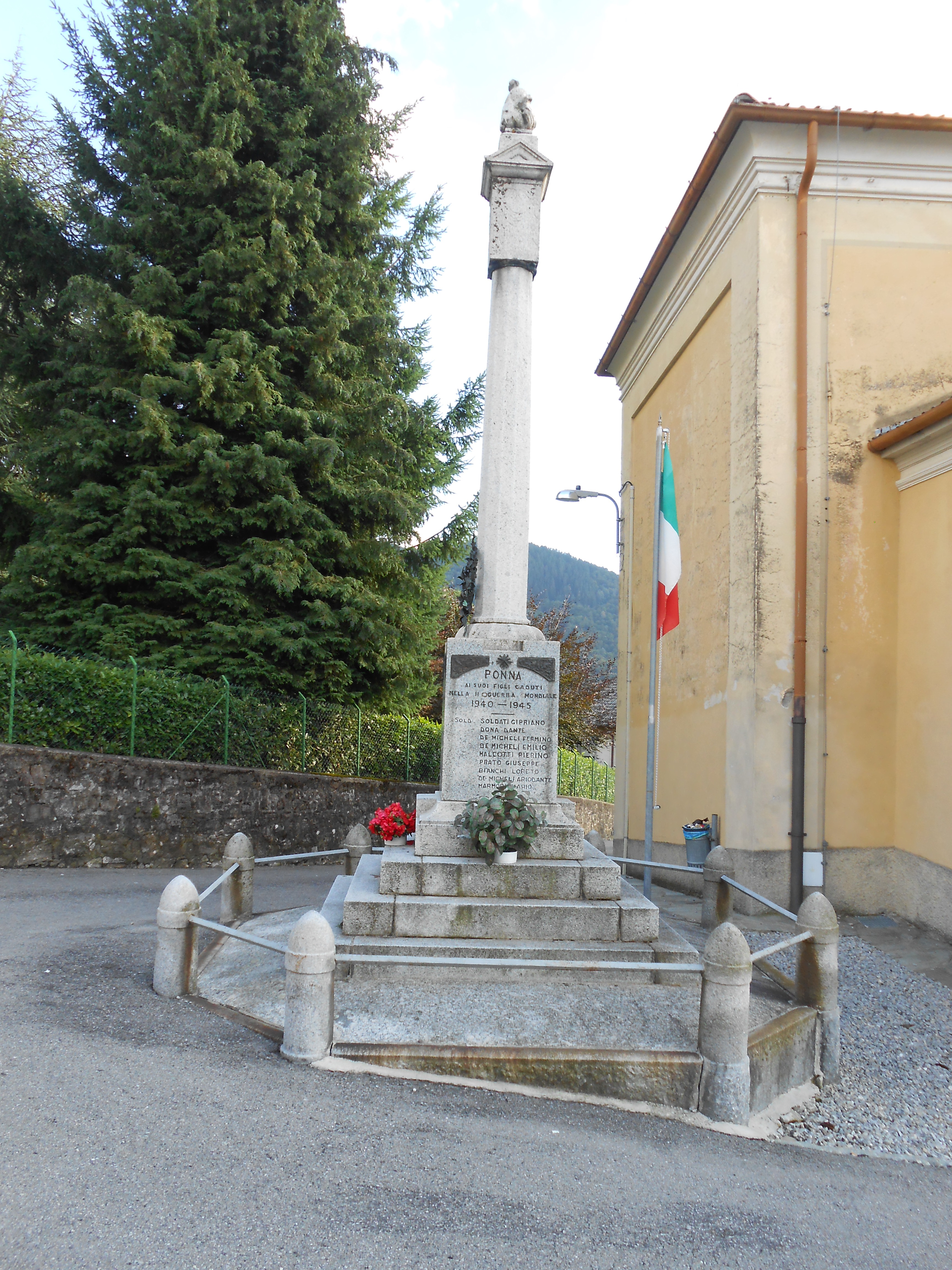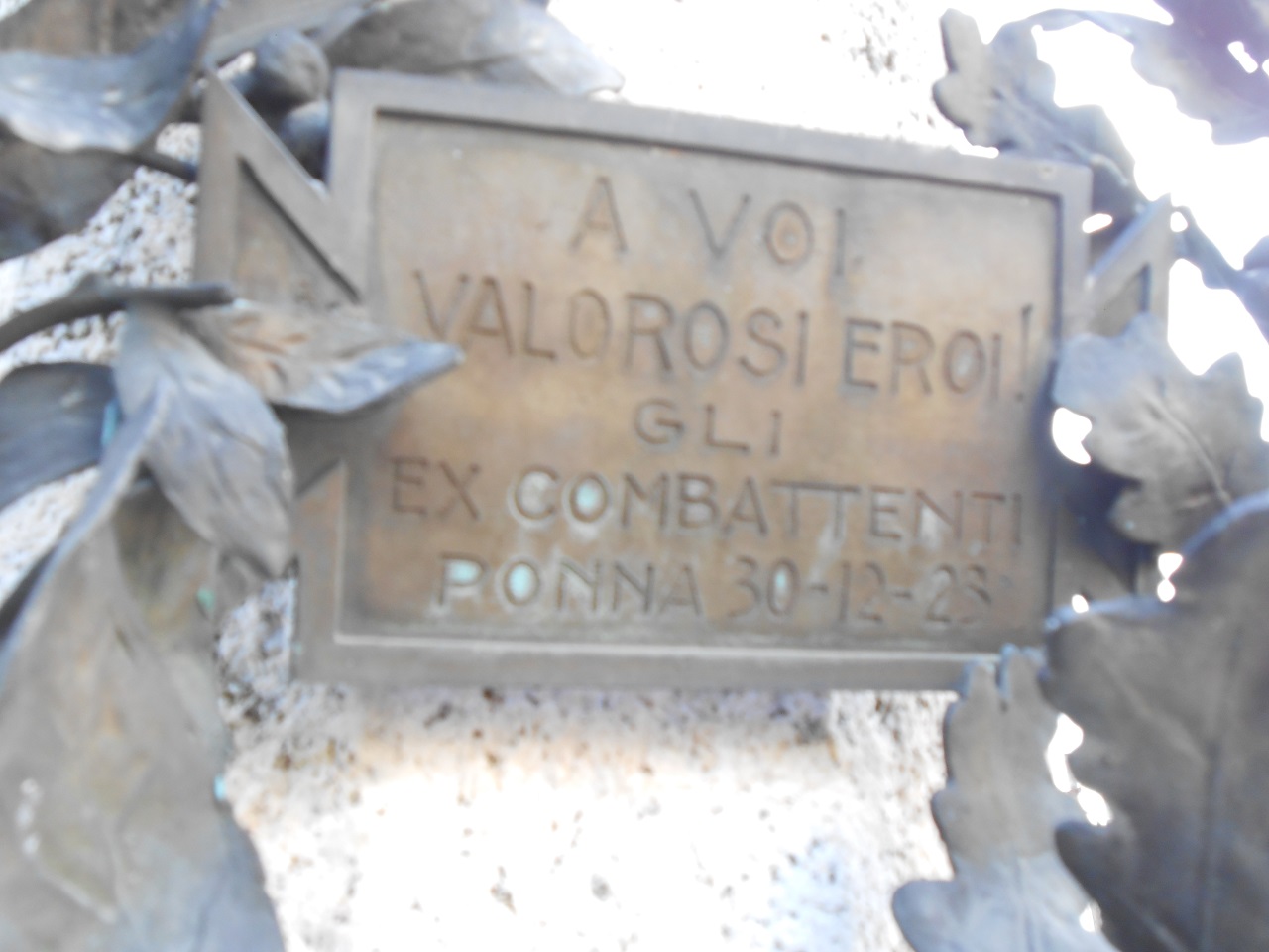 - NOTIZIE STORICO CRITICHE Il termine ante quem della datazione proposta è suggerito dal fatto che nel 1923 le donne di Ponna donano la corona di alloro in bronzo che decora la base della colonna, come attesta l'iscrizione incisa sulla targhetta apposta sulla medesima corona. Nel 1924, inoltre, il monumento compare in una cartolina pubblicata in www.monumentigrandeguerra.it (ID 830). Dal confronto con l'immagine riprodotta nella cartolina risulta che il monumento non ha subito modifiche, se non l'aggiunta della lapide ai caduti della seconda guerra