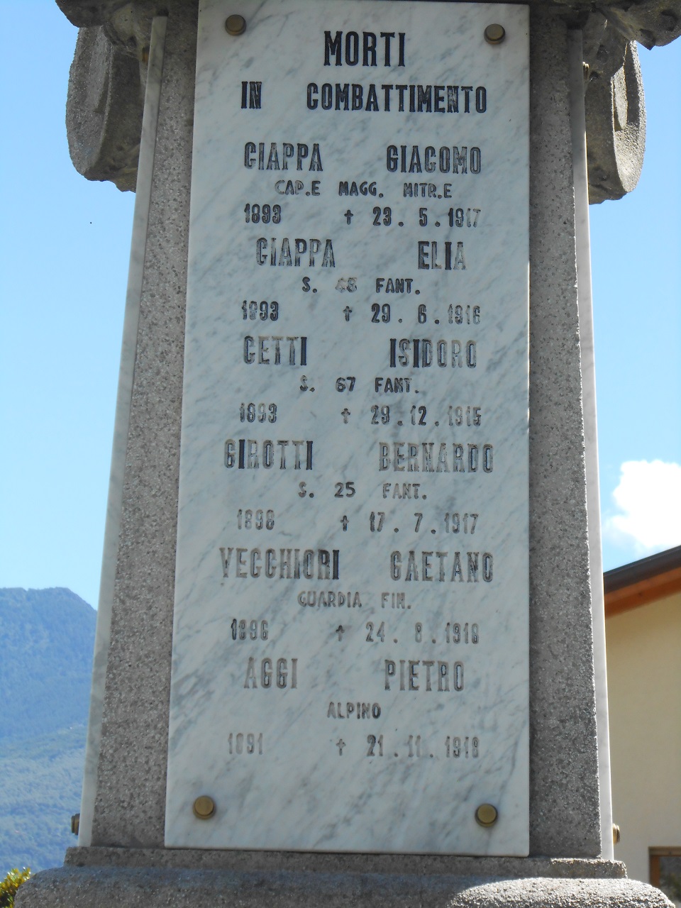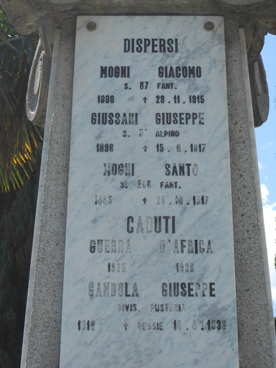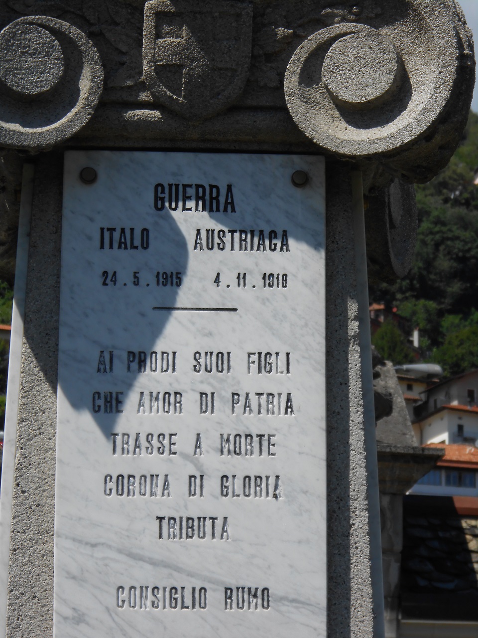 - ISCRIZIONI pilastro, lato frontale - GUERRA/ ITALO AUSTRIACA/ 24.5.1915 4.11.1918/ AI PRODI SUOI FIGLI/ CHE AMOR DI PATRIA/ TRASSE A MORTE/ CORONA DI GLORIA/ TRIBUTA/ CONSIGLIO DI RUMO - capitale - a incisione - italiano