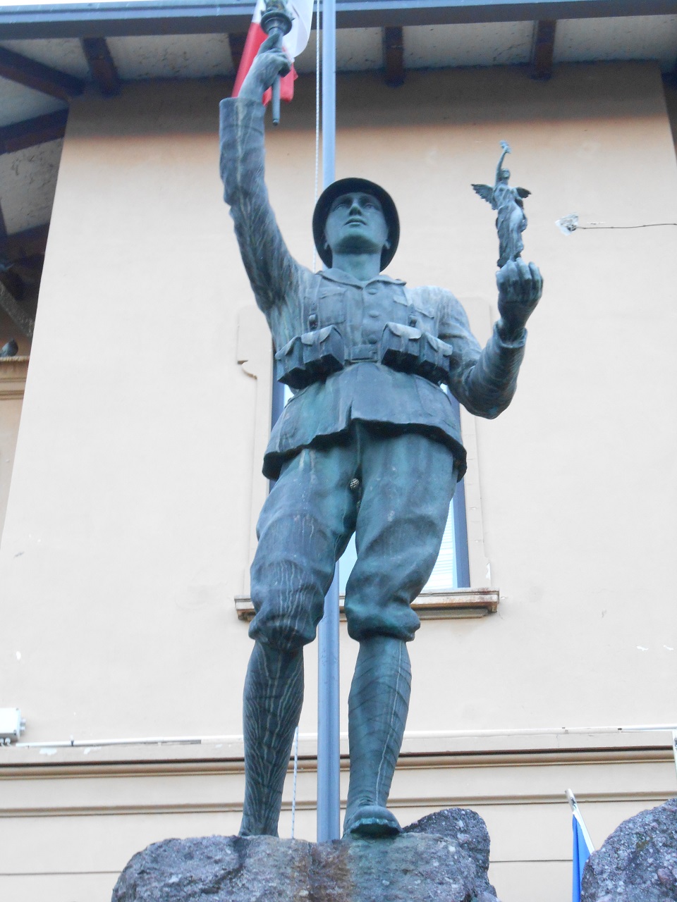 sopra una base quadrata, dal profilo sagomato, è impostato un cippo a blocchi di serizzo che reca una lapide sul lato frontale ed è sormontato dalla statua di un fante con la Vittoria e una fiaccola