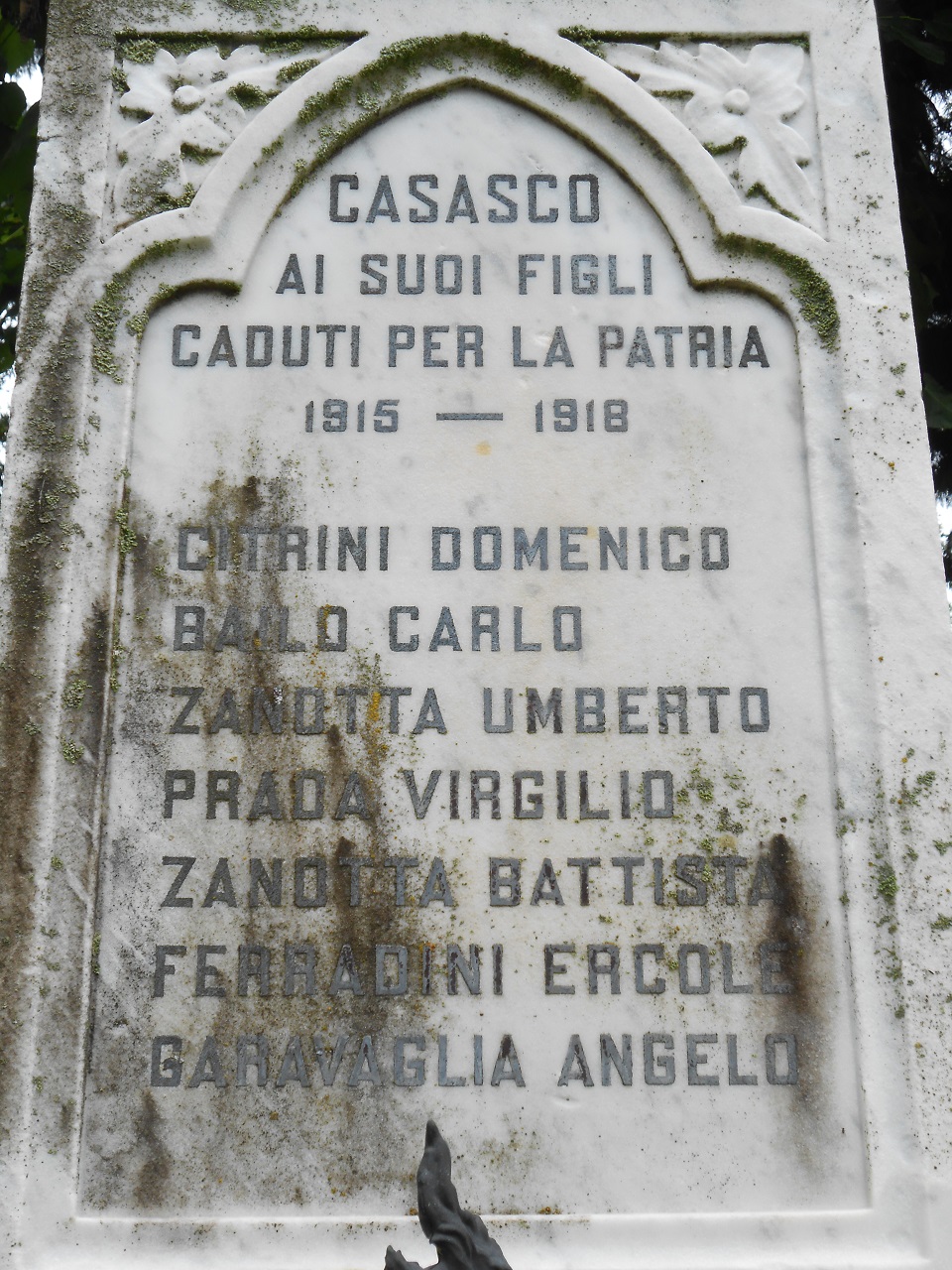 - ISCRIZIONI cippo, lato frontale - CASASCO/ AI SUOI FIGLI/ CADUTI PER LA PATRIA/ 1915-1918/ CITRINI DOMENICO/ BAILO CARLO/ ZANOTTA UMBERTO/ PRADA VIRGILIO/ ZANOTTA BATTISTA/ FERRADINI ERCOLE/ GARAVAGLIA ANGELO - capitale -