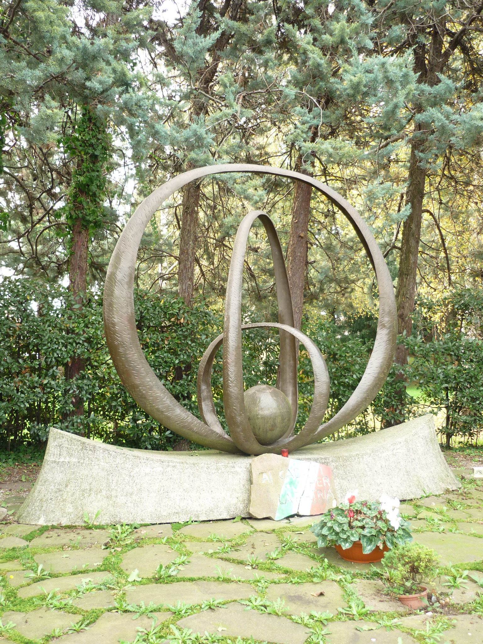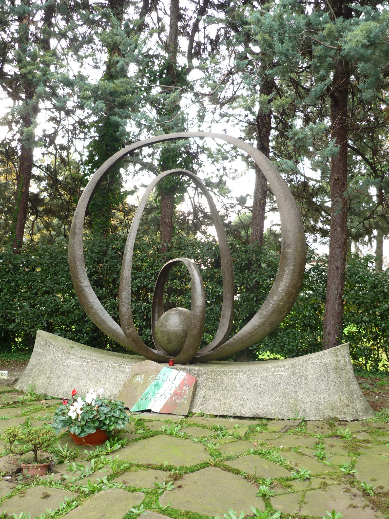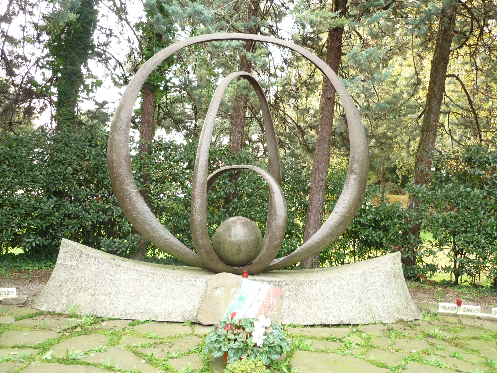 Monumento dedicato ai caduti della prima e della seconda guerra mondiale. Basamento in pietra sopra il quale sono presenti tre anelli in bronzo e una sfera sempre in bronzo, con chiaro significato allegorico simbolico
