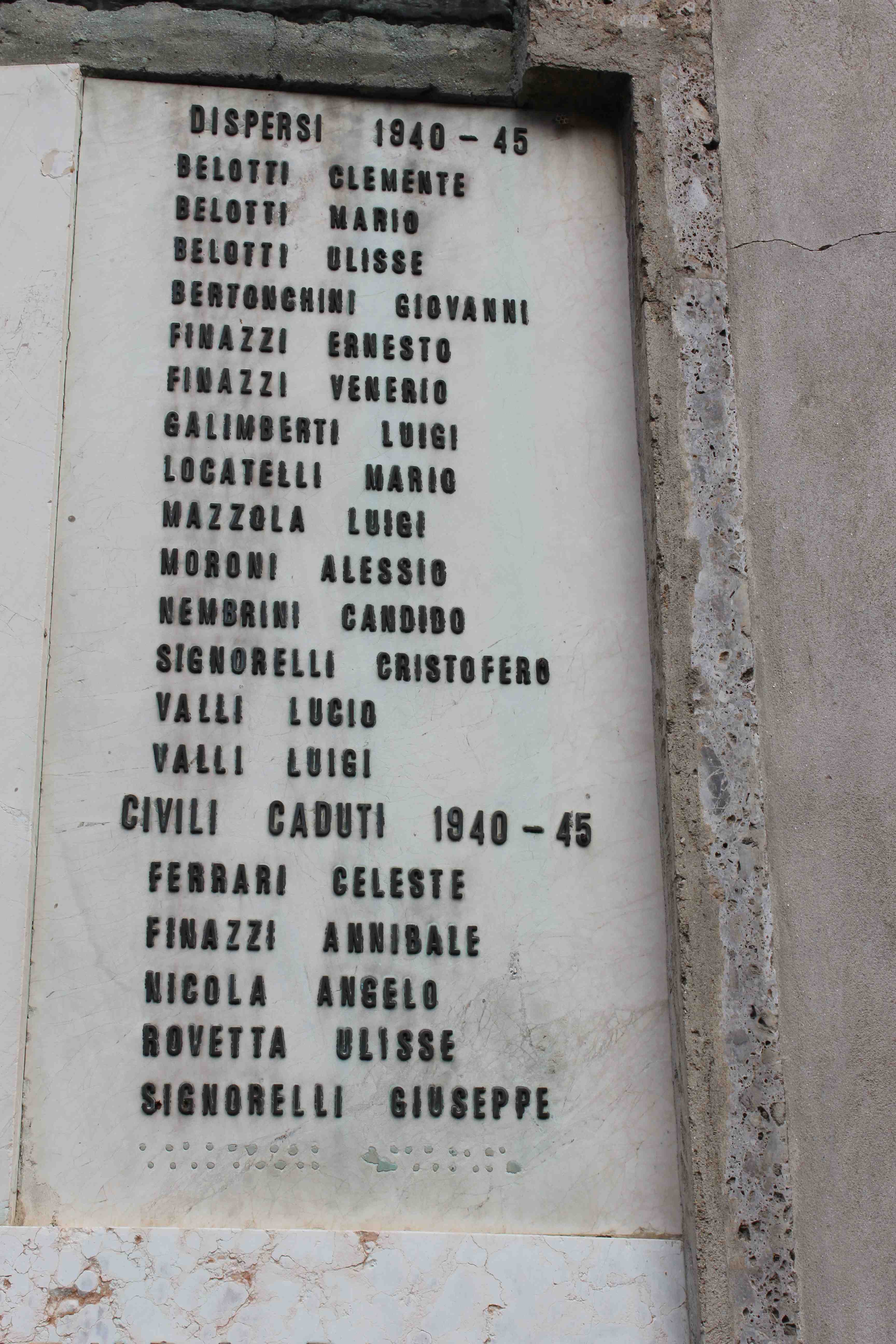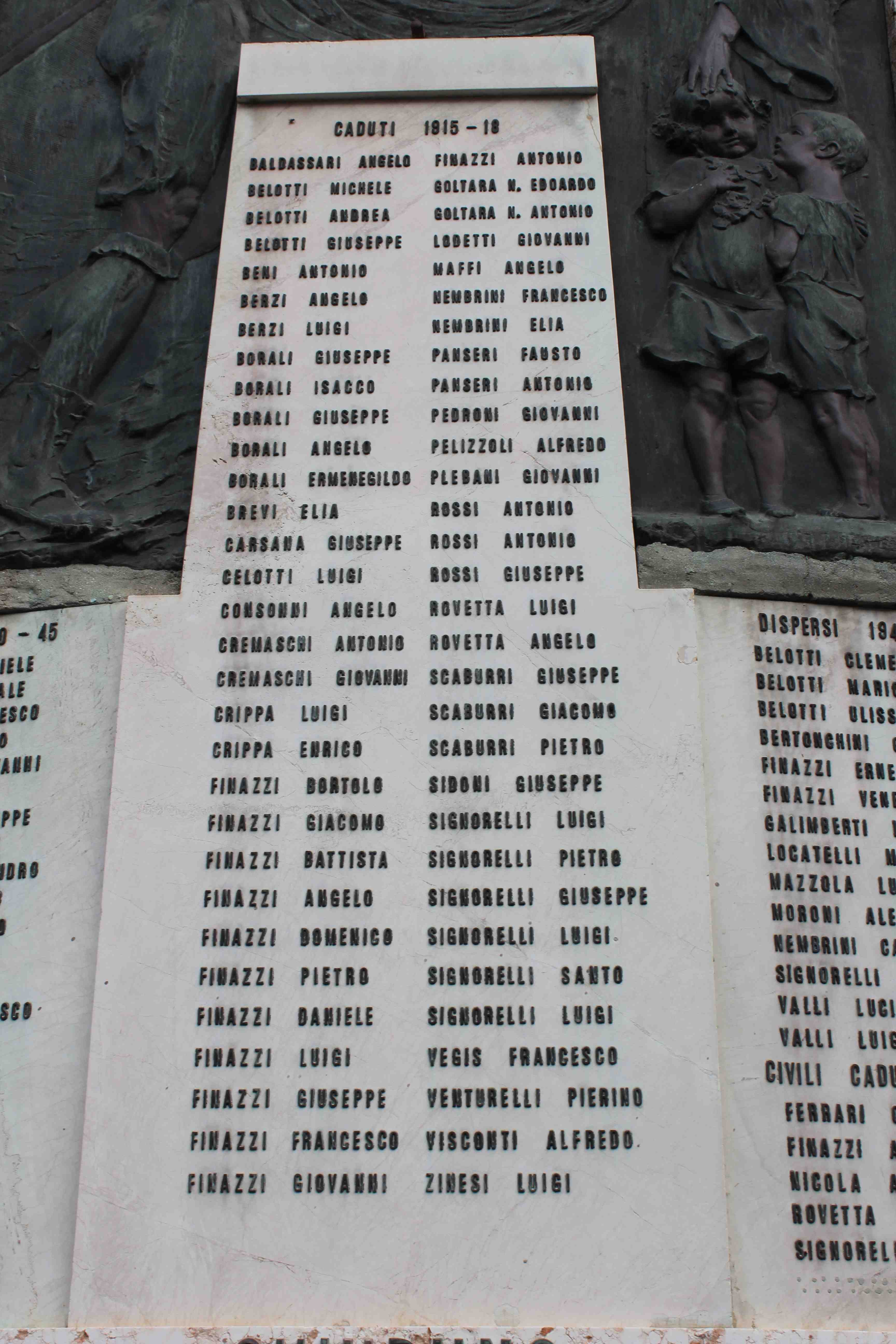 - ISCRIZIONI sulla lapide al centro - CADUTI 1915 – 18/ BALDASSARI ANGELO / BELOTTI MICHELE / BELOTTI ANDREA / BELOTTI GIUSEPPE / BENI ANTONIO / BERZI ANGELO / BERZI LUIGI / BORALI GIUSEPPE / BORALI ISACCO / BORALI GIUSEPPE / BORALI ANGELO / BORALI ERMENEGILDO / BREVI ELIA / CARSANA GIUSEPPE / CELOTTI LUIGI / CONSONNI ANGELO / CREMASCHI ANTONIO / CREMASCHI GIOVANNI / CRIPPA LUIGI / CRIPPA ENRICO / FINAZZI BORTOLO / FINAZZI GIACOMO / FINAZZI BATTISTA / FINAZZI ANGELO / FINAZZI DOMENICO / FIANZZI PIETRO / FINAZZI DANIELE / FINAZZI LUIGI / FINAZZI GIUSEPPE / FINAZZI FRACESCO / FINAZZI GIOVANNI / FINAZZI ANTONIO / GOLTARA N. EDOARDO / GOLTARA N. ANTONIO / LODETTI GIOVANNI / MAFFI ANGELO / NEMBRINI FRANCESCO / NEMBRINI ELIA / PANSERI FAUSTO / PANSERI ANTONIO / PEDRONI GIOVANNI / PELIZZOLI ALFREDO / PLEBANI GIOVANNI / ROSSI ANTONIO / ROSSI ANTONIO / ROSSI GIUSEPPE / ROVETTA LUIGI / ROVETTA ANGELO / SCABURRI GIACOMO / SCABURRI PIETRO / SIDONI GIUSEPPE / SIGNORELLI PIETRO / SIGNORELLI GIUSEPPE / SIGNORELLI LUIGI / SIGNORELLI SANTO / SIGNORELLI LUIGI / VEGIS FRANCESCO / VENTURELLI PIERINO / VISCONTI ALFREDO / ZINESI LUIGI - mons. Francesco Vistalli - capitale -