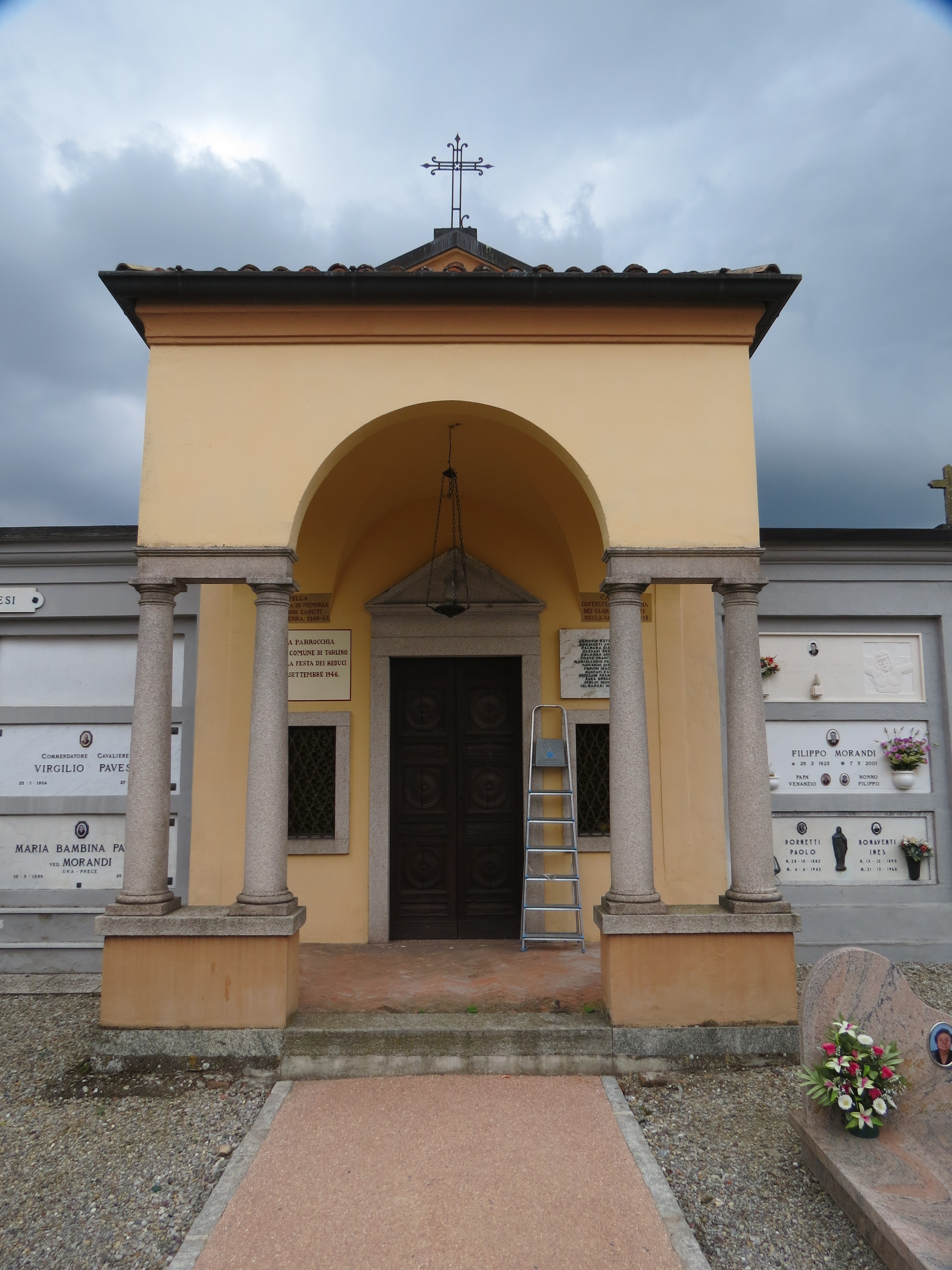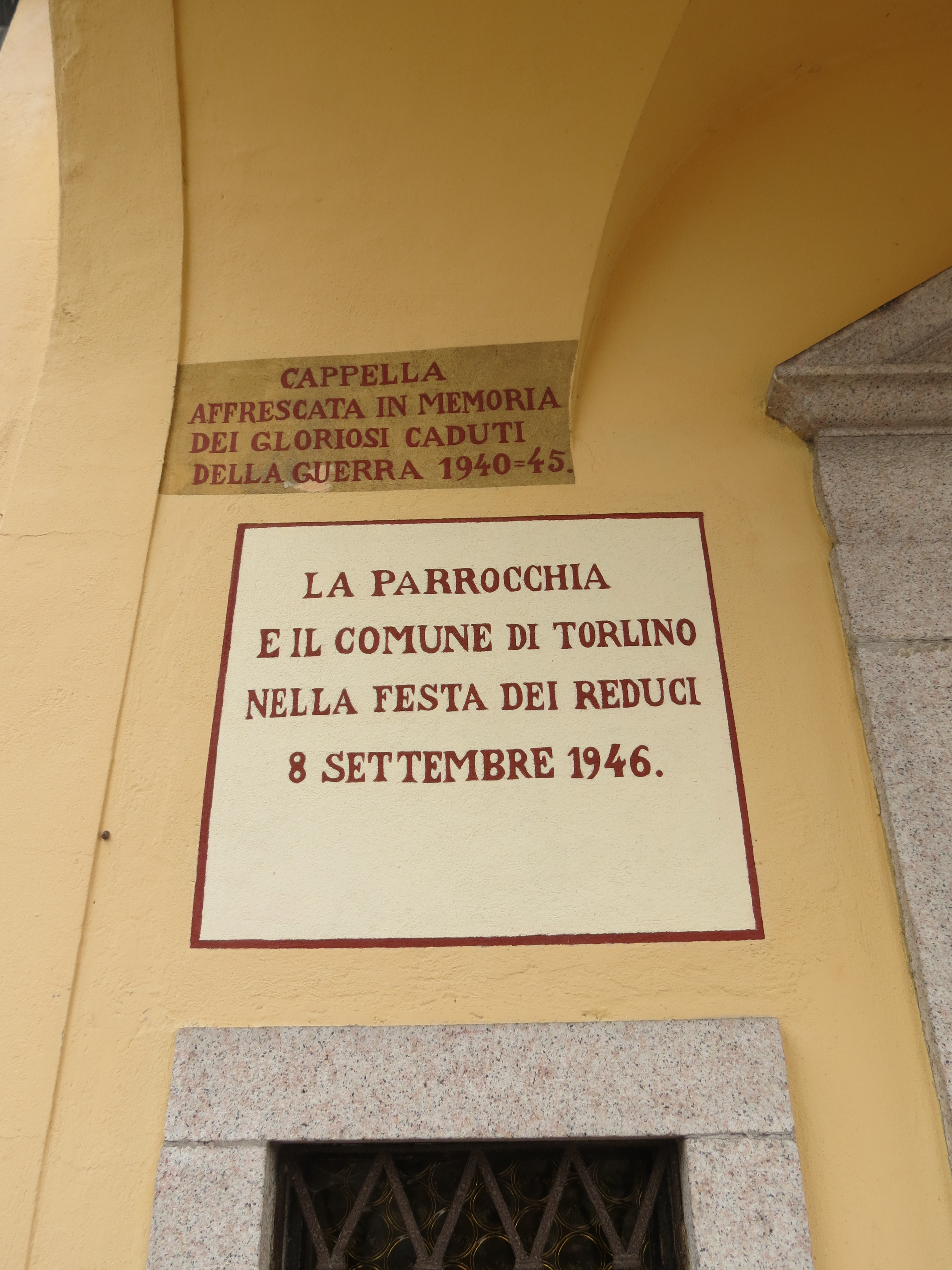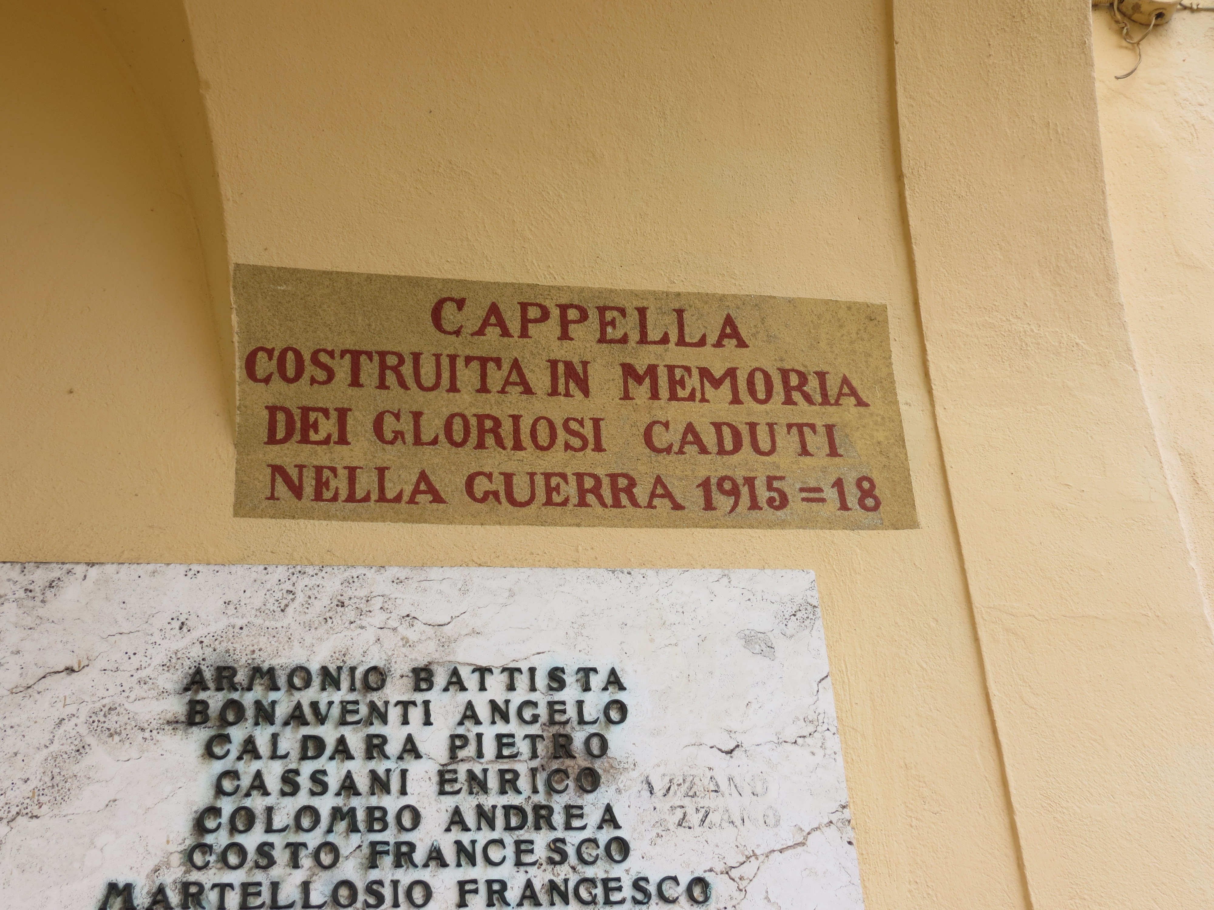 - NOTIZIE STORICO CRITICHE La lapide è posta sulla facciata della cappella all'interno del cimitero. La cappella fu costruita in memoria dei caduti della Prima Guerra Mondiale e affrescata in memoria dei caduti della Seconda, come riportato nelle iscrizioni sulla facciata, ai lati della porta d'ingresso, in alto. La dedica da parte dell'Amministrazione Comunale e della Parrocchia avvenne nella festa dei reduci l'8 Settembre 1946, come ricorda un'altra iscrizione in facciata. Nel 1990 il Comune commissionò un nuovo monumento ai caduti delle due guerre, posto di fronte al Municipio (NCTN 03254029)