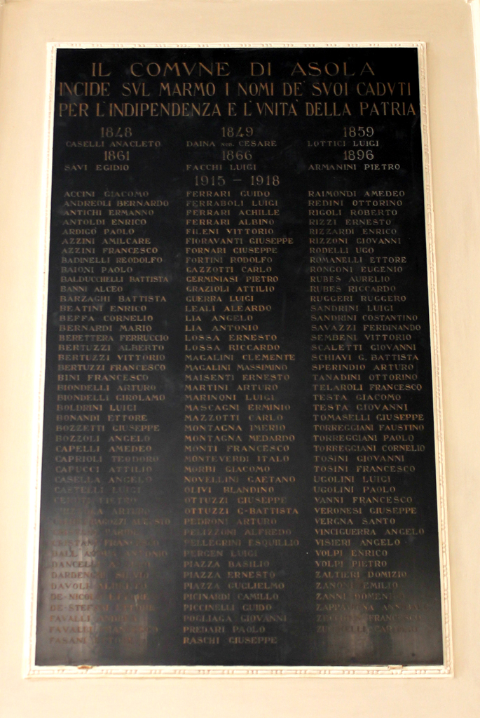 - ISCRIZIONI sulla lapide commemorativa ai caduti della Grande Guerra - COMVNE DI ASOLA/ INCIDE SVL MARMO I NOMI DE'SVOI CADVTI/ PER L'INDIPENDENZA E L'VNITA' DELLA PATRIA/ 1848/ CASELLI ANACLETO/ 1849/ DAINA NOB. CESARE/ 1859/ LOTTICINI LUIGI/ 1861/ SAVI LUIGI/ 1866/ FACCHI LUIGI/ 1896/ ARMANINI PIETRO/ 1915-1918/ ACCINI GIACOMO/ ANDREOLI BERNARDO/ ANTICHI ERMANNO/ ANTOLDI ANRICO/ ARDIGO PAOLO/ AZZINI AMILCARE/ AZZINI FRANCESCO/ BADINELLI RODOLFO/ BAIONI PAOLO/ BALDUCCHELLI BATTISTA/ BANNI ALCEO/ BARZAGHI BATTISTA/ BEATINI ENRICO/ BEFFA CORNELIO/ BERNARDI MARIO/ BERETTERA FERRUCCIO/ BERTUZZI ALBERTO/ BERTUZZI VITTORIO/ BERTUZZI FRANCESCO/ BINI FRANCESCO/ BIONDELLI ARTURO/ BIONDELLI GIROLAMO/ BOLDRINI LUIGI/ BONANDI ETTORE/ BOZZETTI GIUSEPPE/ BOZZOLI ANGELO/ CAPELLI AMEDEO/ CAPROLI TEODORO/ CAPUCCI ATTILIO/ CASELLA ANGELO/ CASTELLI LUIGI/ CERUTI PIETRO/ CHIZZOLA ARTURO/ CLERICI BAGOZZI AUGUSTO/ CRISTIANI PARIDE/ CRISTIANI FRANCESCO/ DALL’ACQUA ANTONIO/ DANCELLI ANGELO/ DARDENGHI SILVIO/ DAVOLI ALBERTO/ DE-NICOLO’ ETTORE/ DE-STEFANI ETTORE/ FAVALLI ANDREA/ FAVALLI FRANCESCO/ FASANI ETTORE/ FERRARI GUIDO/ FERRABOLI LUIGI/ FERRARI ACHILLE/ FERRARI ALBOINO/ FILENI VITTORIO/ FIORAVANTI GIUSEPPE/ FORNARI GIUSEPPE/ FORTINI RODOLFO/ GAZZOTTI CARLO/ GERMINIASI PIETRO/ GRAZIOLI AUGUSTO/ GUERRA LUIGI/ LEALI ALEANDRO/ LIA ANGELO/ LIA ANTONIO/ LOSSA ERNESTO/ LOSSA RICCARDO/ MAGALINI CLEMENTE/ MAGALINI MASSIMINO/ MAISENTI ERNESTO/ MARTINI ARTURO/ MARINONI LUIGI/ MASCAGNI ERMINIO/ MAZZOTTI CARLO/ MONTAGNA IMERIO/ MONTAGNA MEDARDO/ MONTI FRANCESCO/ MONTEVERDI ITALO/ MORBI GIACOMO/ NOVELLINI GAETANO/ OLIVI BLANDINO/ OTTUZZI GIUSEPPE/ OTTUZZI G-BATTISTA/ PERDONI ARTURO/ PELLIZZONI ALFREDO/ PELLEGRINI ESQUILLIO/ PERGEN LUIGI/ PIAZZA BASILIO/ PIAZZA ERNESTO/ PIAZZA GUGLIELMO/ PICINARDI CAMILLO/ PICCINELLI GUIDO/ POGLIAGA GIOVANNI/ PREDARI PAOLO/ RASCHI GIUSEPPE/ RAIMONDI AMEDEO/ REDINI OTTORINO/ RIGOLI ROBERTO/ RIZZI ERNESTO/ RIZZARDI ENRICO/ RIZZONI GIOVANNI/ RODELLI UGO/ ROMANELLI ETTORE/ RONGONI EUGENIO/ RUBES AURELIO/ RUBES RICCARDO/ RUGGERI RUGGERO/ SANDRINI LUIGI/ SANDRINI COSTANTINO/ SAVAZZI FERDINANDO/ SEMBENI VITTORIO/ SCALETTI GIOVANNI/ SCHIAVI G. BATTISTA/ SPERINDIO ARTURO/ TANADINI OTTORINO/ TELAROLI FRANCESCO/ TESTA GIACOMO/ TESTA GIOVANNI/ TOMMASELLI GIUSEPPE/ TORREGGIANI FAUSTINO/ TORREGGIANI PAOLO TORREGGIANI CORNELIO/ TOSINI GIOVANNI/ TOSINI FRANCESCO/ UGOLINI LUIGI/ UGOLINI PAOLO/ VANNI FRANCESCO/ VERONESI GIUSEPPE/ VERGNA SANTO/ VINCIGUERRA ANGELO/ VISIERI ANGELO/ VOLPI PIETRO/ ZALTIERI DOMIZIO/ ZANONI EMILIO/ ZANNI DOMENICO/ ZAPPAVIGNA ANNIBALE/ ZECCHINA FRANCESCO/ ZUCCHELLI CARMILIO - capitale - a incisione -