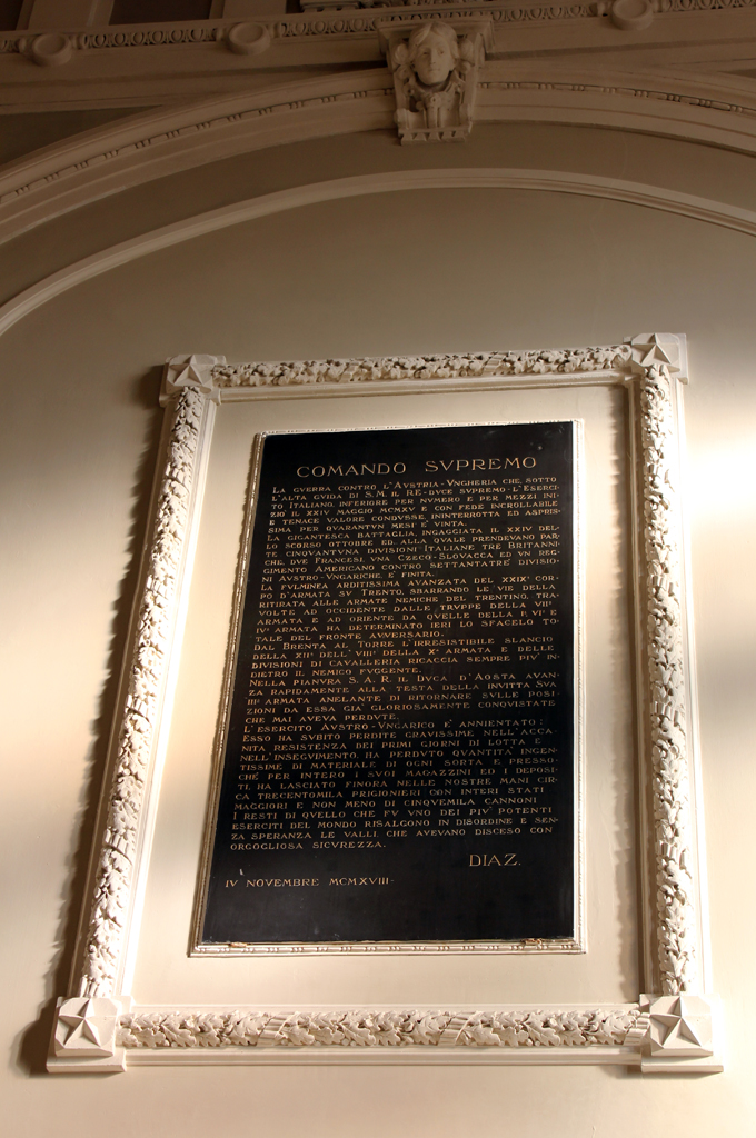 - NOTIZIE STORICO CRITICHE La lapide ai caduti della Grande Guerra del comune mantovano di Asola - accompagnata dal suo pendant col Bollettino della Vittoria - dovette essere eseguita in concomitanza con i lavori di ristrutturazione del Municipio, realizzati tra il 1915 ed il 1921 (da una comunicazione orale dell'archivista comunale Ester Cauzzi); si propone come termine cronologico per l'ante quem realizzativo proprio l'anno di chiusura dell'intervento. Si segnalano ulteriori opere commemorative ai caduti della Grande Guerra nel comune di Asola (escluse le località): il monumento su viale Belfiore (NCT 0303254040), il famedio della chiesa di San Rocco con la lapide all'interno (NCT 0303267149) e con il cippo davanti alla facciata (NCT 0303267148), il monumento all'80° Reggimento Fanteria conservato nuovamente in Municipio (NCT 0303267147). Bibliografia di confronto: Monumenti ai mantovani caduti per la patria, Associazione nazionale combattenti e reduci. Federazione provinciale di Mantova, 2002 (la lapide non è segnalata nel volume)// I caduti asolani: cento anni di storia, Armando Rati, Mantova, Sometti, 2001// Alberto Bendoni, La solidità della memoria. I materiali della storia pubblica dell'Alto mantovano nel Novecento, Università degli studi di Parma Facoltà di lettere e filosofia, Corso di laurea in lettere moderne, a.a. 2001/2002, tesi conservata presso la biblioteca comunale di Asola