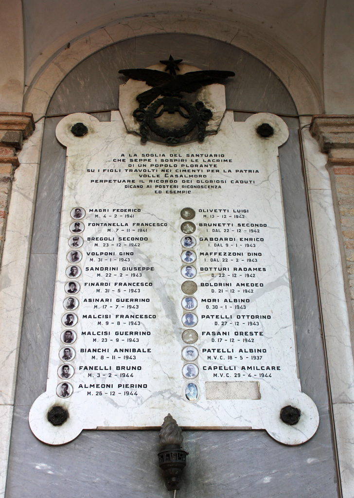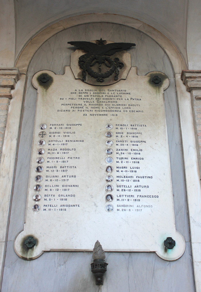 - ISCRIZIONI lapide destra - caduti della Grande Guerra - A LA SOGLIA DEL SANTUARIO/ CHE SEPPE I SOSPIRI E LE LACRIME/ DI UN POPOLO PLORANTE/ SU I FIGLI TRAVOLTI NEI CIMENTI PER LA PATRIA/ VOLLE CASALMORO/ PERPETUARE IL RICORDO DEI GLORIOSI CADUTI/ PERCHE’ IL NOME E L’EFFIGIE LORO/ DICANO AI POSTERI/ RICONOSCENZA ED ESEMPIO/ 23 NOVEMBRE 1919/ FORNARI GIUSEPPE/ M.2-10-1915/ GIORGI VIGILIO/ M.3-11-1918/ GOTTELLI BENIAMINO/ M.4-1-1917/ MADA RODOLFO/ M.11-6-1917/ PICCINELLI PIETRO/ M.1-9-1917/ MAGRI BATTISTA/ M.13-9-1917/ GILIANI ARTURO/ M.6-10-1917/ BELLINI GIOVANNI/ M.8-12-1917/ BEFFA ORLANDO/ M.5-1-1918/ PATELLI ARIODANTE/ M.11-1-1918/ REBOLI BATTISTA/ M.15-1-1918/ GHIO GIUSEPPE/ M.3-4-1918/ CANUTI GIUSEPPE/ M.26-4-1918/ ZANINI EMILIO/ M.24-10-1918/ TURINI ENRICO/ M.2-11-1918/ MAGRI LUIGI/ M.4-11-1918/ MELEAGRI FAUSTINO/ M.10-12-1918/ GOTTELLI ARTURO/ M.26-12-1918/ LOTTIERI FRANCESCO/ M.11-2-1919/ SANDRINI ALFONSO/ M.26-8-1917 - capitale - a incisione -