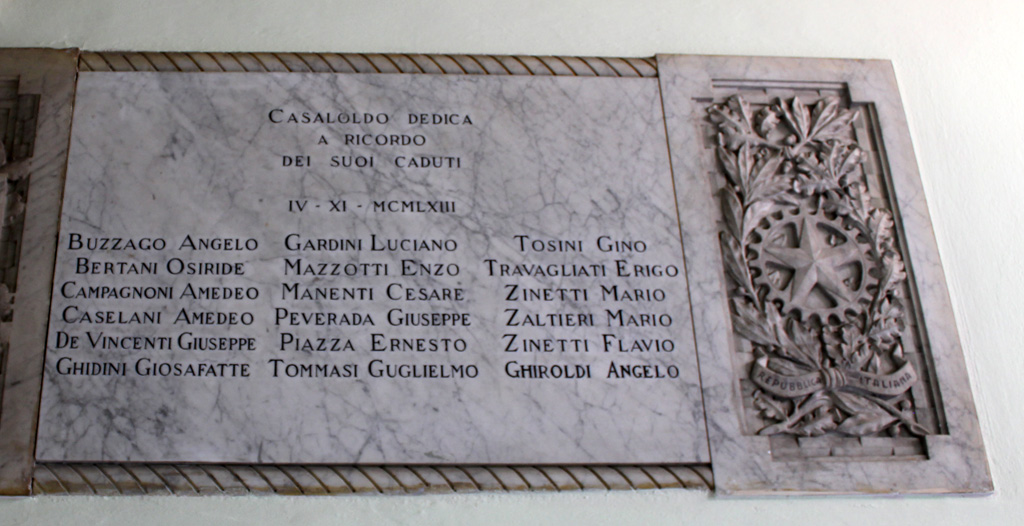 - ISCRIZIONI lapide sinistra ai caduti della Grande Guerra - AI PRODI SUOI FIGLI CADUTI/ PER LA GRANDEZZA D'ITALIA/ CASALOLDO DEDICA/ XX - II - MCMXIX/ BELLINI PIETRO/ BELLONI GIOVANNI/ BOLDRINI ANGELO/ CAPELLI ERNESTO/ CAPRINI GIUSEPPE/ CARLESCHI ANGELO/ CAPELLI CARLO/ CHIARI FRANCESCO/ FILIPPINI PIETRO/ FRER PIETRO/ GANDOLFINI UMBERTO/ GOBBI ZEFFERINO/ GRAZIOLI UGO/ GUERRESCHI CARLO/ CHIARI GUGLIELMO/ LANZINI ANGELO/ PERI FERDINANDO/ SENIGA LUIGI/ STANGHELLINI ELIA/ TORREGGIANI GIACOMO/ UMETTI RODOLFO/ AZZINI LUIGI/ CIRANI ENRICO - capitale - a incisione -