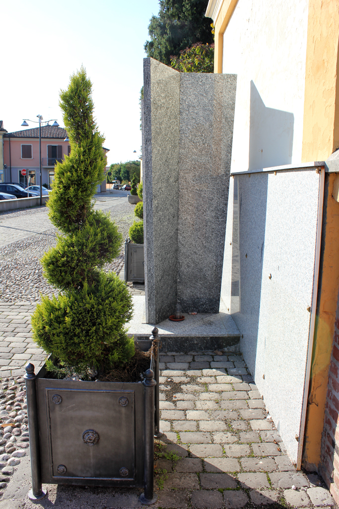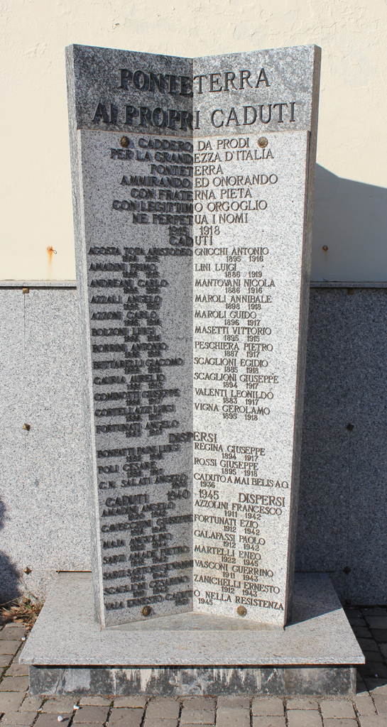 - ISCRIZIONI sulla stele - PONTETERRA/ AI PROPRI CADUTI/ CADDERO DA PRODI/ PER LA GRANDEZZA D'ITALI/ PONTETERRA/ AMMIRANDO/ ED ONORANDO/ CON FRATERNA PIETA'/ CON LEGITTIMO ORGOGLIO/ NE PERPETUA I NOMI/ 1915 1918/ CADUTI/ AGOSTA TOTA ARISTODEO/ 1886 1915/ AMADINI PRIMO/ 1895 1915/ ANDREANI CARLO/ 1895 1919/ AZZALI ANGELO/ 1898 1917/ AZZONI CARLO/ 1885 1916/ BOLZONI LUIGI/ 1886 1918/ BORRINI ANTONIO/ 1885 1918/ BUTTARELLI GIACOMO/ 1899 1918/ CAURIA AURELIO/ 1881 1917/ COMINOTTI GIUSEPPE/ 1886 1917/ CORTELLAZZI LUIGI/ 1886 1917/ FORTUNATI ANGELO/ 1887 1917/ GNICCHI ANTONIO/ 1895 1916/ LINI LUIGI/ 1886 1919/ MANTOVANI NICOLA/ 1886 1916/ MAROLI ANNIBALE/ 1898 1918/ MASETTI VITTORIO/ 1895 1915/ PESCHIERA PIETRO/ 1887 1917/ SCAGLIONI EGIDIO/ 1885 1918/ SCAGLIONI 1894 1917/ VALENTI LEONILDO 1883 1917/ VIGNA GEROLAMO/ 1895 1918/ DISPERSI/ BONFATTI FAINI LUIGI/ 1892 1916/ POLI CESARE/ 1898 1917/ C.N. SALATI ANGELO CADUTO A MAI BELES A.O. 1903 1936/ REGINA GIUSEPPE/ 1894 1917/ ROSSI GIUSEPPE/ 1895 1918/ CADUTI 1940 1945/ AMADINI ANGELO/ 1920 1942/ CAVECCHINI GIUSEPPE/ 1916 1945/ MAJA ANGIOLINO/ 1922 1944/ SARZI AMADE' PIETRO/ 1915 1942/ SARZI SARTORI GIOVANNI/ 1914 1943/ SCAGLIONI CESARINO/ 1919 1942/ VAIA ERNESTO CADUTO NELLA RESISTENZA/ 1921 1945/ DISPERSI 1940 1945/ AZZOLINI FRANCESCO/ 1911 1942/ FORTUNATI EZIO/ 1912 1942/ GALAFASSI PAOLO/ 1912 1942/ MARTELLI ENEO/ 1922 1945/ VASCONI GUERRINO/ 1911 1943/ ZANICHELLI ERNESTO/ 1911 1943/ - capitale - a caratteri applicati in bronzo -