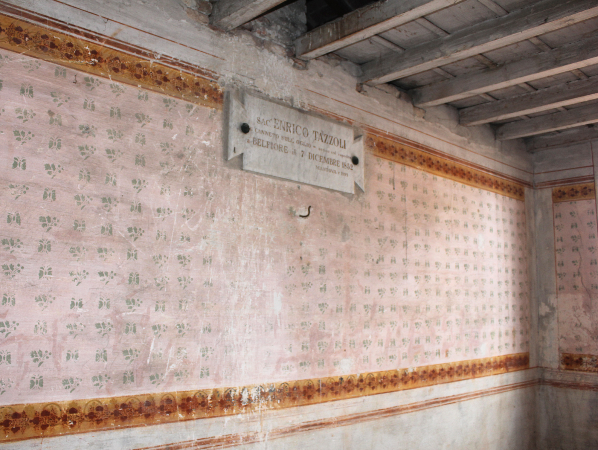 L'ambiente è collocato nell'ammezzato del secondo piano del Castello di San Giorgio, nell'ala di sud-ovest. Accessibile dal Corridoio principale delle Carceri tramite un'anticamera, la stanza da letto dell'ispettore delle prigioni politiche Francesco Casati (1797-1881), si raggiunge per mezzo di una breve scalinata. Il vano rettangolare, di piccole dimensioni e con soffitto piano a travetti, presenta una sola finestra nel lato orientale. La fascia superiore delle pareti, articolata in tre registri, è ornata con decorazioni pittoriche stampigliate a matrici applicate. Nel registro maggiore i soggetti svolti prevedono l'alternanza di motivi vegetali con farfalle stilizzate, mentre le cornici che lo inquadrano mostrano un fregio ad intreccio fitomorfo continuo. Sulla parete settentrionale è affissa la lapide in ricordo di don Tazzoli