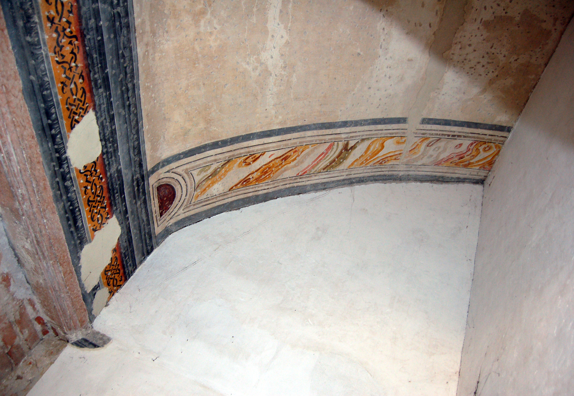 L'ambiente in oggetto, parte della Magna Domus di Corte Vecchia, è accessibile dal Camerino del Sole, costituendo con esso l'estremo angolo di sud-ovest dell'appartamento di Santa Croce. Il piccolo vano a pianterreno, certamente ridimensionato rispetto all'estesione originaria, presenta un coperto voltato a semi-botte; il perimetro delle arcate di sostegno del soffitto è percorso da specchiature a finto marmo. L'imposta della volta, al di sopra di un architrave lapideo (NCT 0303267422) che sostiente il coperto, è decorata da una cornice che alterna diverse modanature dipinte a monocromo ad una fascia dorata centrale realizzata con motivi a matrici stampigliate. In origine il vano doveva presumibilmente mostrare una struttura architettonica che si serviva del supporto dell'architrave e di due colonnine ritrovate murate presso la parete nord (si vedano la relative schede OA NCT 0303267419 e 0303267420)