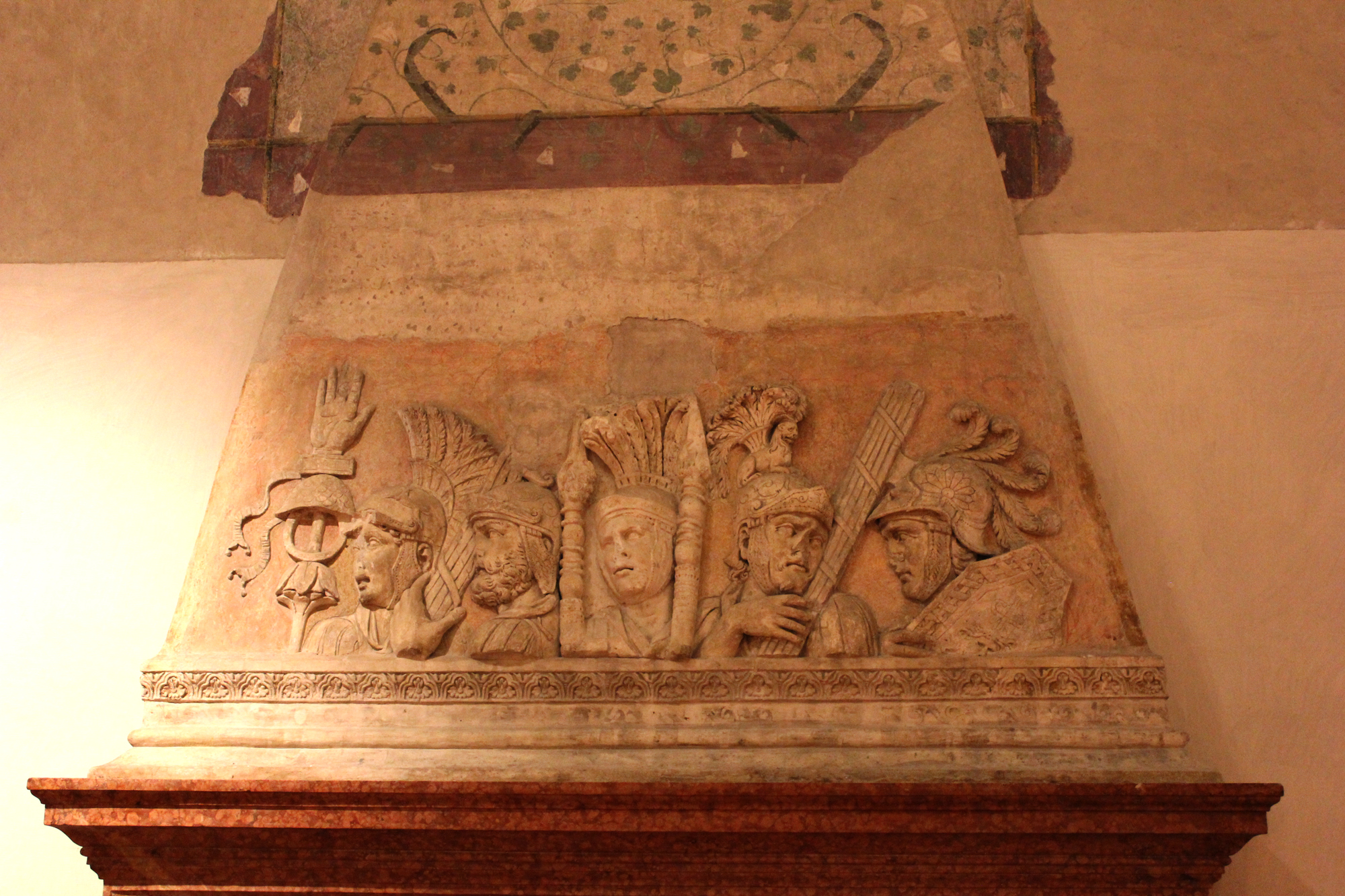 Il camino della Sala Imperiale presenta nel registro inferiore della cappa un bassorilievo raffigurante soldati e centurioni romani. L'inserto centrale, riconoscibile dal punto di vista cromatico e materico, è un marmo di epoca traianea, che rappresenta il volto centurione con l'usuale elmo crestato, racchiuso tra due lance. Il castone romano è inserito in una composizione di stucco, realizzata in stile, che imita lo stesso rilievo antico