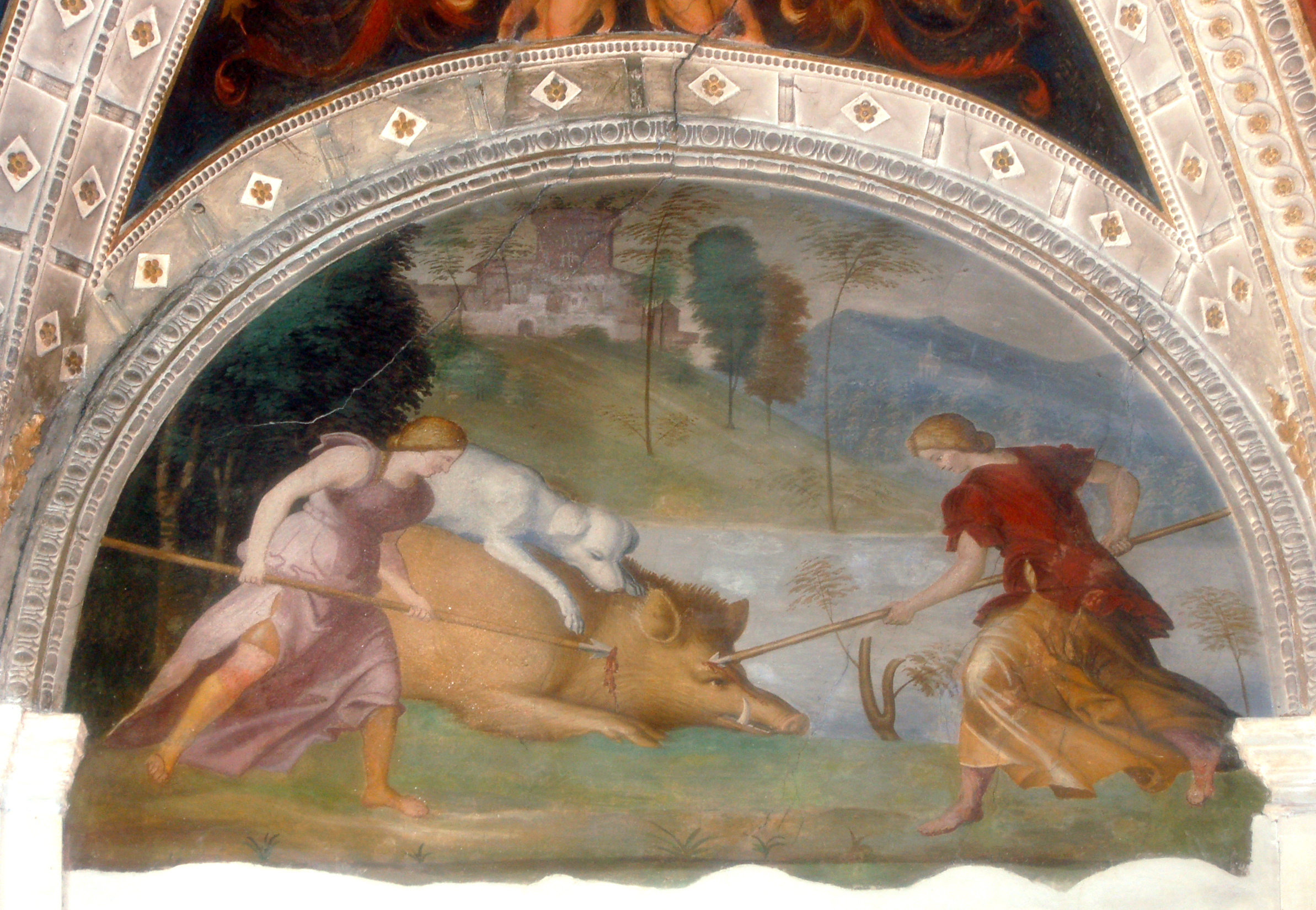 La lunetta mostra la violenta fine di una caccia al cinghiale condotta da cacciatrici panneggiate all’antica. Le due donne infiggono appuntite lance nella testa di un grosso cinghiale che domina il centro della composizione, mentre un feroce cane da caccia aggredisce la bestia sul collo. La scena di caccia si dispone nell’ameno fondale campestre della riva di un lago, oltre il quale dolci poggi collinari accompagnano il sorgere di una città fortificata in lontananza