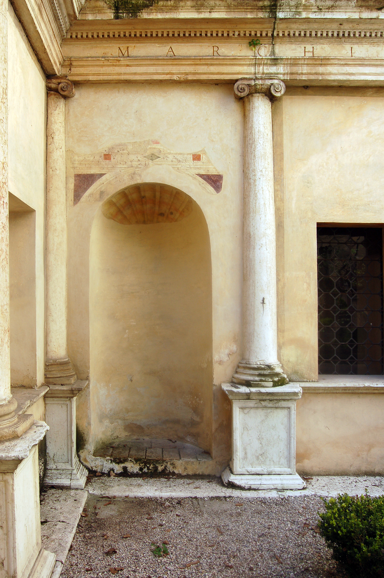 Il quarto di colonna si inserisce alla congiuntura della parete occidentale (medesimo orientamento del capitello verso ovest) con quella meridionale del giardino. Il fusto rastremato si imposta sulla zoccolatura parietale che lo sostiene con un dado completo di cornice modanata superiore. Quest’ultima supporta la base della colonna costituita da due tori e due scozie, con una fascia di tre cimbie o listelli al punto mediano. L’abaco del semicapitello, relativamente consunto, è costituito dalla sovrapposizione di tre listelli ed emerge in aggetto rispetto all’imposta della trabeazione. L’unica voluta del semicapitello è quella destra e si presenta liscia lungo il margine superiore, tanto nel canale quanto nel nastro, e concava nella parte più interna. L’echino mostra un deciso aggetto circolare, tornito nella fascia centrale e privo di decorazione a fregio. Il sottostante collarino è costituito da una semplice cornice a toro