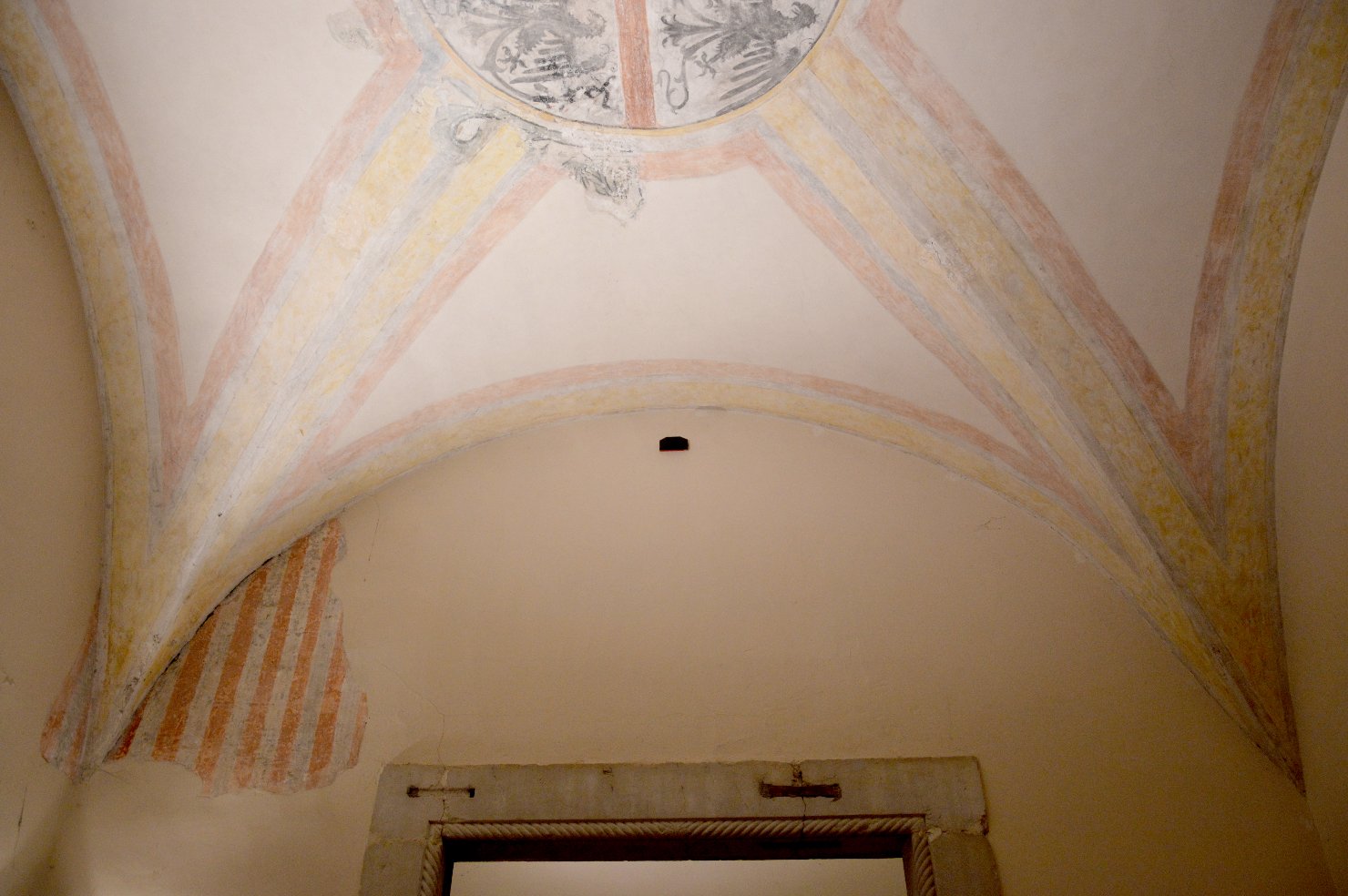 - STEMMI chiave di volta - gentilizio - Stemma - famiglia Gonzaga (dopo la concessione imperiale del marchesato) - scudo inquartato dei Gonzaga (nei colori giallo e nero) su aquile imperiali a volo abbassato e croce rossa