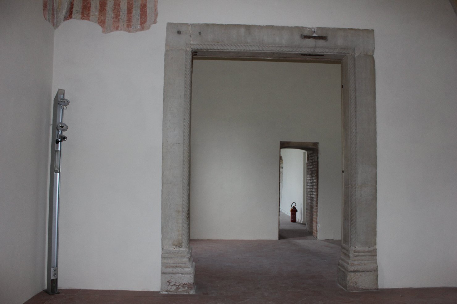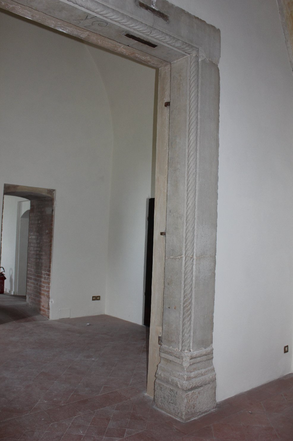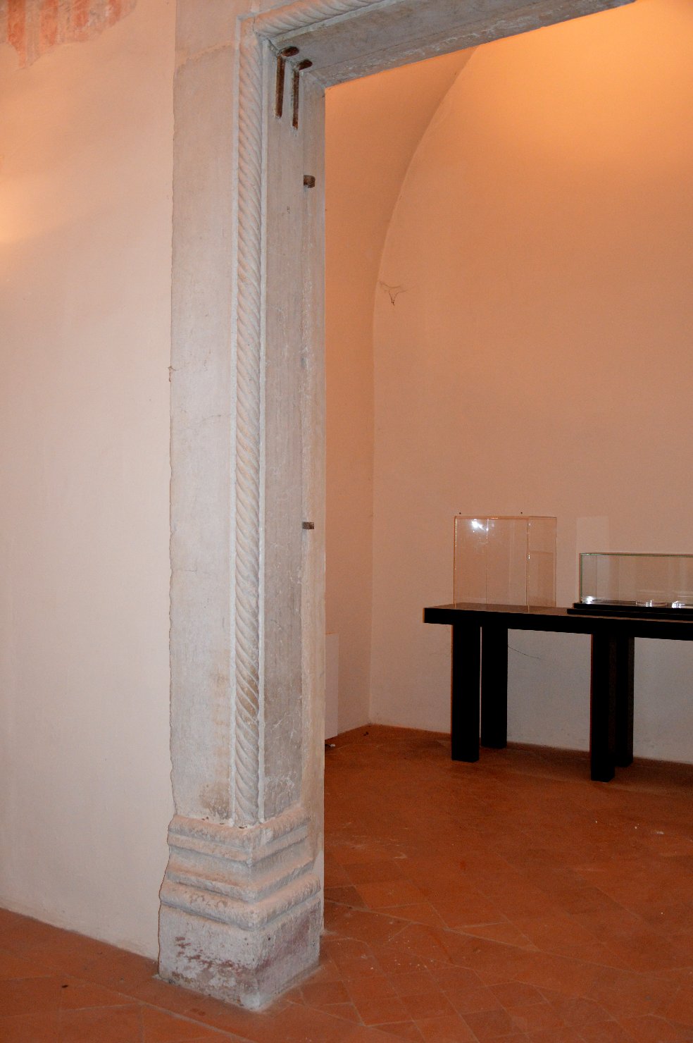 La mostra di portale è collocata presso la soglia est dell’ambiente A0-12, al pianterreno del Castello di San Giorgio. Il disegno pulito e sobrio è ingentilito dall’intreccio che corre a rilievo lungo l’architrave e gli stipiti, concludendosi presso il basamento, sagomato con modanature lisce. Si segnala la presenza di grappe ancora in essere per contenere le vistose crepe dell’architrave