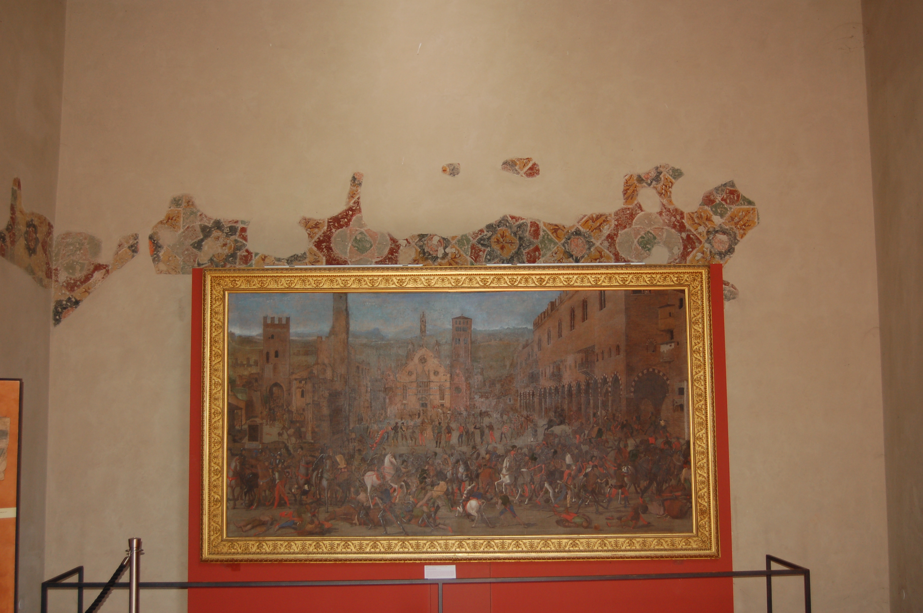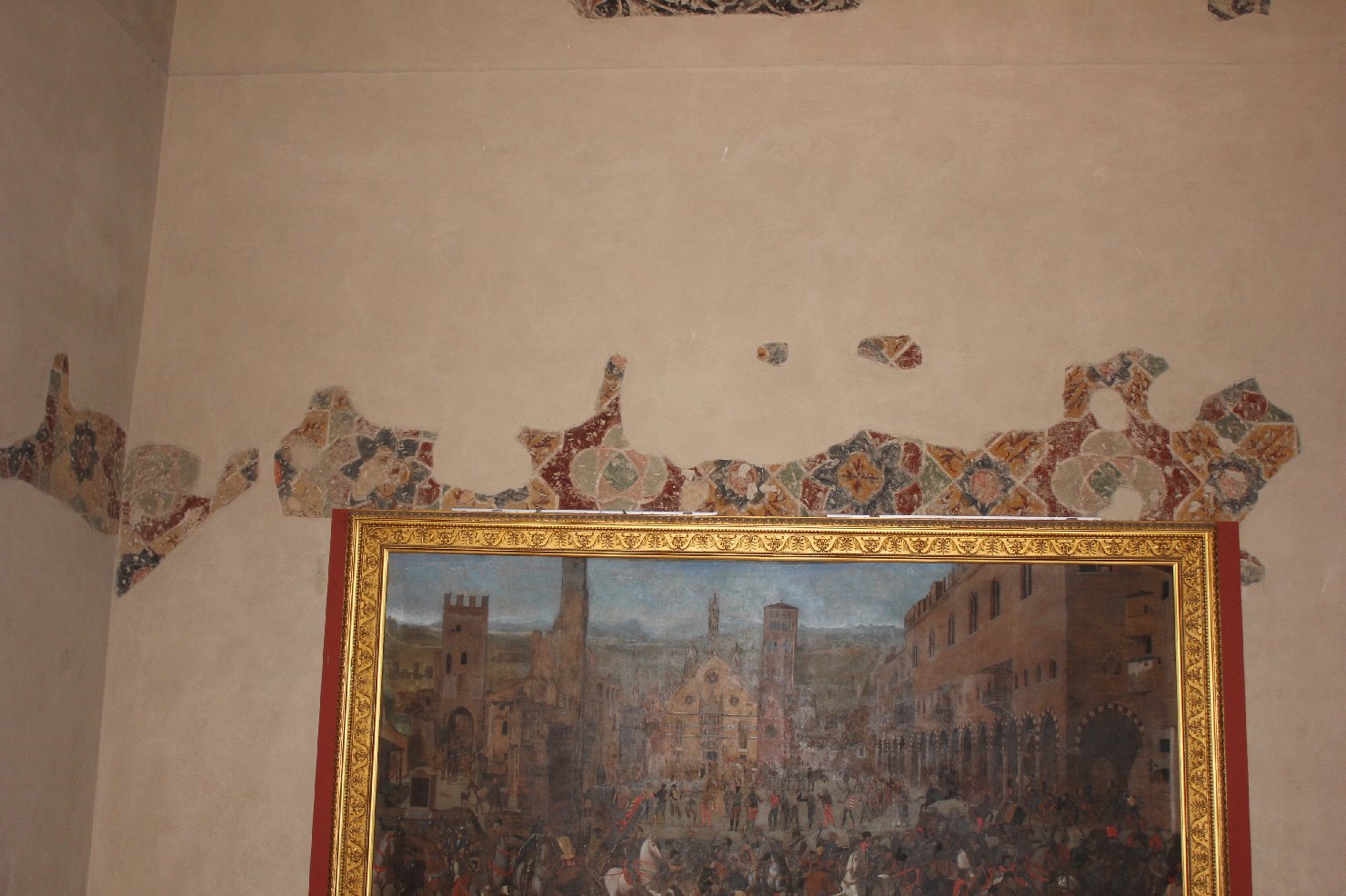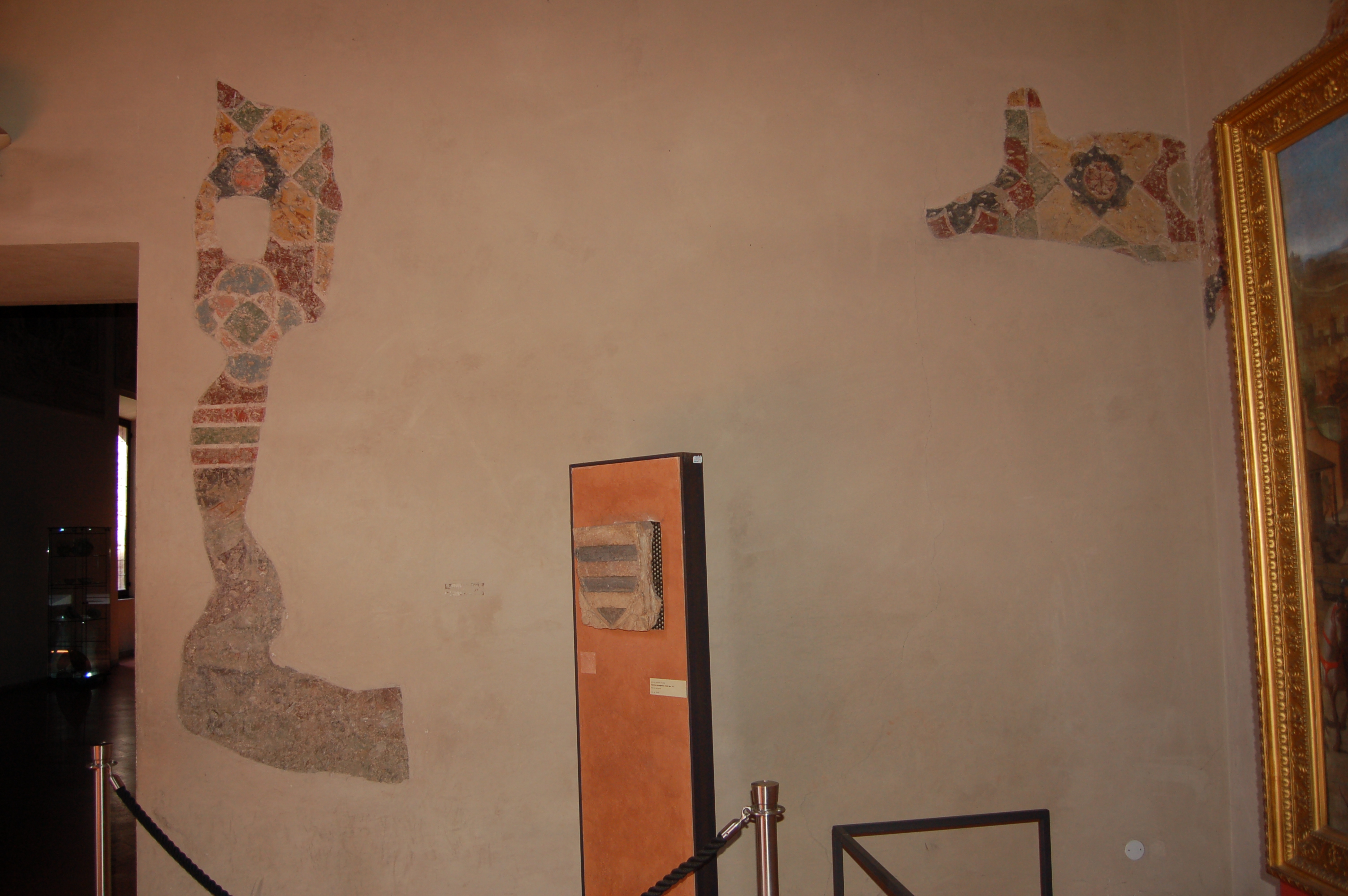 Nella Sala dei Sette Scalini (piano nobile del Palazzo del Capitano) si conservano sulle pareti ovest e sud diversi lacerti pittorici, parte di un complesso decorativo impostato su elementi geometrici dai vivaci colori che doveva probabilmente fregiare la fascia mediana dell’intero locale. Il motivo, delineato da una bordura bianca, alterna elementi decorativi compendiati su forme stellari, polilobate o cruciformi in un incastro di campiture colorate, rifinite con elementi fitomorfi