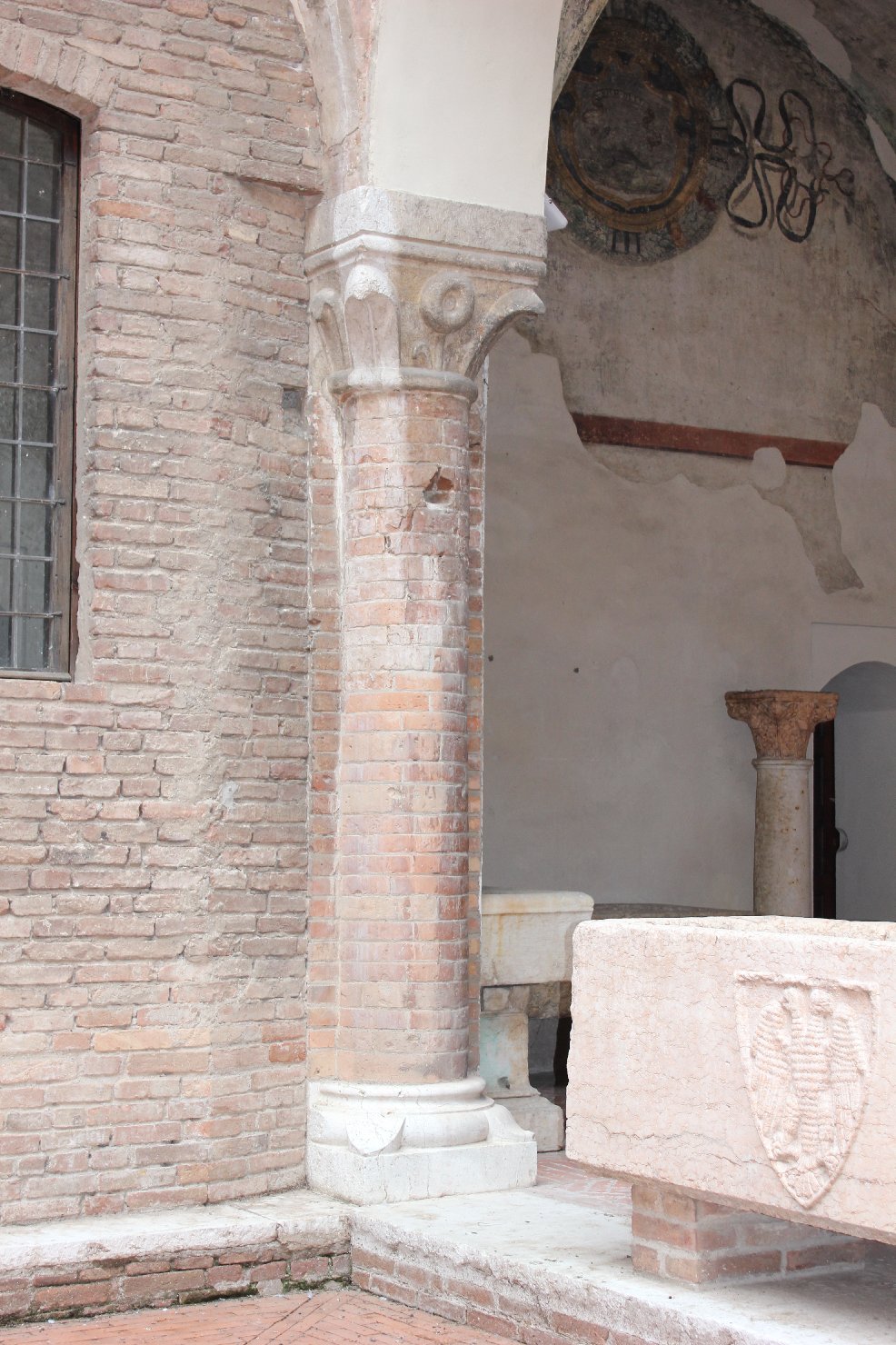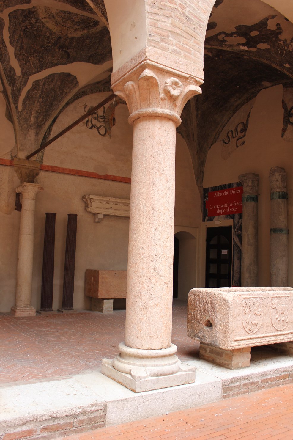 Le due colonne marmoree centrali del loggiato settentrionale del cortile del Castello di San Giorgio presentano il medesimo disegno, differenziandosi solo nei rilievi del capitello. La base, elevata su di un plinto, è completa di doppio toro con scozia intermedia, mentre il solo fusto di destra è finito con una lavorazione a bocciarda. I capitelli, di similare tipologia, sono percorsi da rilievi scultorei che compendiano elementi fitomorfi: solo nel capitello di destra appare il bel motivo della calendula gonzaghesca (o margherita) tra larghe foglie incurvate. Le colonne centrali sono conchiuse ai lati da semicolonne; i tre fornici del loggiato terminano ad ovest in una semicolonna in mattoni addossata al prospetto occidentale del cortile (l’unico privo di porticato) con un capitello in pietra calcarea, che mostra anch’esso un motivo affine con fogliame e fiore gonzaghesco, mentre il loggiato nel fronte orientale, pur interrotto dal ballatoio quattrocentesco (aggiunta fancelliana), conserva ancora tracce di una semicolonna in mattoni del tutto comparabile a quella dirimpetto sul braccio ovest, con un capitello in calcare ricalcato sulle forme di quello centrale di sinistra