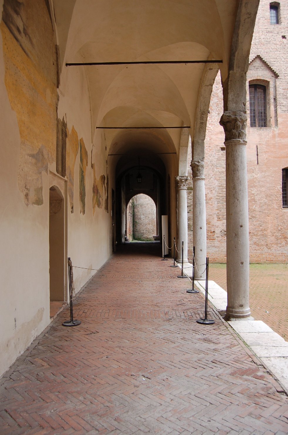 Il braccio meridionale del cortile del Castello di San Giorgio presenta un vano loggiato a pianterreno suddiviso in tre campate a crociera di egual misura. I tre fornici a tutto sesto, sottolineati da una cornice modanata, poggiano su quattro colonne inquadrate da una coppia di pilastri. I capitelli corinzi sono scolpiti a rilievo con un doppio giro di foglie d’acanto chiuso da una cornicetta modanata con volute ai vertici e fiore nell’abaco (è probabile che i due capitelli laterali siano copie novecentesche, mentre il solo fusto laterale destro pare sostituito). Il loggiato sostiene un ballatoio che serviva come disimpegno di collegamento esterno tra le stanze del piano nobile affacciate sul cortile; il prospetto terrazzato mostra poco oltre la linea dei fornici una cornice marcapiano, sotto il quale campeggiano 4 corone aggettanti modellate in stucco (le tracce pittoriche superstiti non permettono l’individuazione degli emblemi araldici dipinti entro i clipei). [SI PROSEGUE IN OSS - Osservazioni]