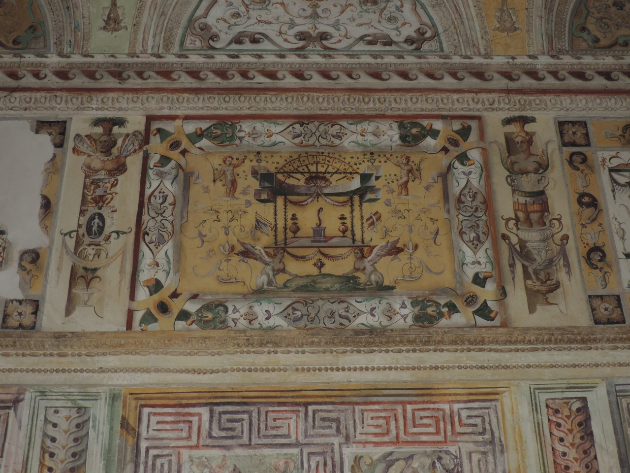 - NOTIZIE STORICO CRITICHE Alle pareti del camerino, immediatamente sotto la sequenza di lunette, corre una fascia dipinta, delimitata superiormente dal cornicione d'imposta della volta e lungo il margine inferiore da una cornice minore. La decorazione, priva di soluzioni di continuità strutturali, appare organizzata in dodici riquadri (tre per lato), la cui lunghezza corrispondente a quella delle soprastanti lunette: ciascun riquadro è separato dal successivo da un soggetto di ispirazione grottesca, simile a un'erma, posto in corrispondenza della base del pennacchio. Come negli elementi della volta, anche nella successione dei riquadri ricorre l'alternanza dei colori giallo-ocra e bianco, alternativamente costituenti il colore di fondo della cornice e della parte centrale di ogni riquadro. Proprio il diverso tipo di cornice dipinta determina la successione di due modelli: il primo caratterizzato da cornice decorata da motivi a racemi su fondo bianco e quattro piccole cornici a cartoccio angolari, il secondo con bordo di girali vegetali su fondo giallo e quattro rosette dorate angolari. Tutti i riquadri contengono una fine decorazione a grottesche, nella quale il ruolo di protagonisti è assunto da animali di ogni tipo, reali e fantastici, dipinti con particolare attenzione al dettaglio; le architetture di fantasia seguono prospettive centrali ben costruite e ogni figura appare definita nel minimo particolare. Le “erme” tra i riquadri sono alternativamente maschili e femminili e costruite per assemblaggio di elementi: basi, recipienti, cornucopie, tessuti, e molti altri. Solo il riquadro centrale della parete orientale, con le due “erme” laterali, è frutto integrale di restauro poiché, come ricorda Cottafavi (1928) in fase preliminare ai lavori, la finestra “era stata otturata nella metà inferiore e portata in alto in rottura fino sopra al cornisotto”: con il ripristino dell'apertura originaria si procedette quindi all'integrazione pittorica, affidata ad Aldo Fiozzi. Al di sotto della fascia dipinta corre una cornice in stucco ornata da motivi dorati su fondo bianco di foglie stilizzate, fusarole e perline che separa la decorazione soprastante dal registro inferiore delle pareti. L'interruzione della cornice sul lato orientale e le sconnessioni che si osservano in alcuni punti sono dovute rispettivamente all'ampliamento verso l'alto della porta-finestra e all'apertura di porte in fasi successive, come ricorda Cottafavi (1928) preliminarmente al restauro: il muro settentrionale era stato, infatti, perforato da due porte, poi otturate, operazione che causò l'abbassamento di un tratto del “cornisotto”; di una certa rilevanza la lunga crepa che attraversa la cornice sulla parete meridionale, causa di problemi statici anche per la corrispondente loggetta dei Cani e sulla quale si intervenne proprio in occasione del restauro degli anni Venti del secolo scorso