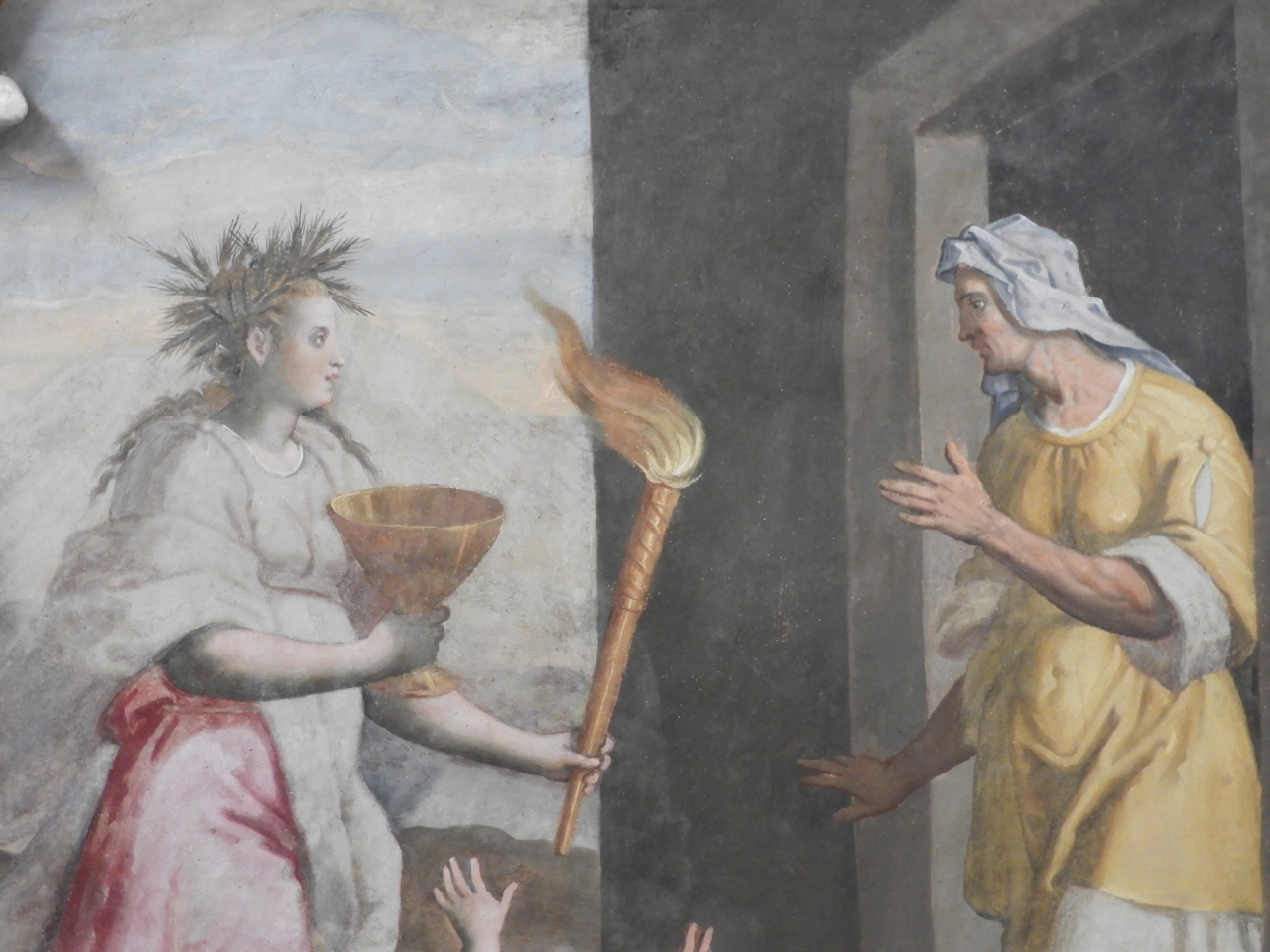 - NOTIZIE STORICO CRITICHE Il dipinto, collocato all'angolo nord-occidentale, è uno dei quattro riquadri di dimensioni maggiori della volta. La scena, condotta a olio, rappresenta Cerere, dea delle messi, che, sfinita per la continua ricerca della figlia Proserpina, rapita da Plutone, riceve da una vecchia una bevanda dolce con polenta inzuppata con la quale ristorarsi: un fanciullo lì presente, Ascalabo, la derise chiamandola ingorda, e la dea, adiratasi, le scagliò addosso la bevanda, che subito riempì il ragazzo di chiazze, tramutandolo in un geco (Metamorfosi, V, 438-461). Signorini evidenzia le affinità tra il dipinto e le tavole 63 di Salomon (“Ceres cherche sa fille”, contenuta nell'opera “La Métamorphose d'Ovide figurée”, Lione 1557), 48 di Tempesta (“Deridens Cererem puer in stellionem abit”) e 49 di De Passe. L'Occaso (2007, pp. 104-105) attribuisce questa e le altre tre scene nei riquadri angolari della volta a Bernardino Malpizzi, al cui ambito riferisce inoltre la tela centrale con "Apoteosi di Ercole"