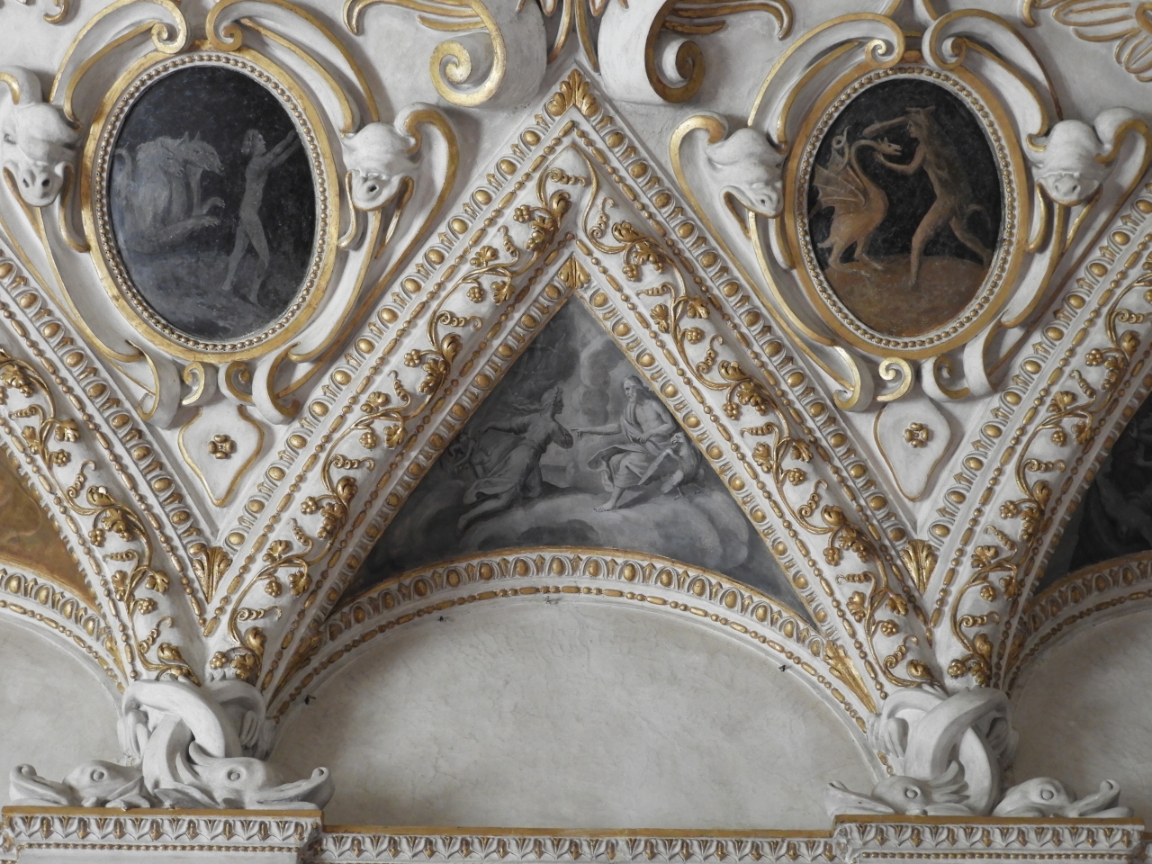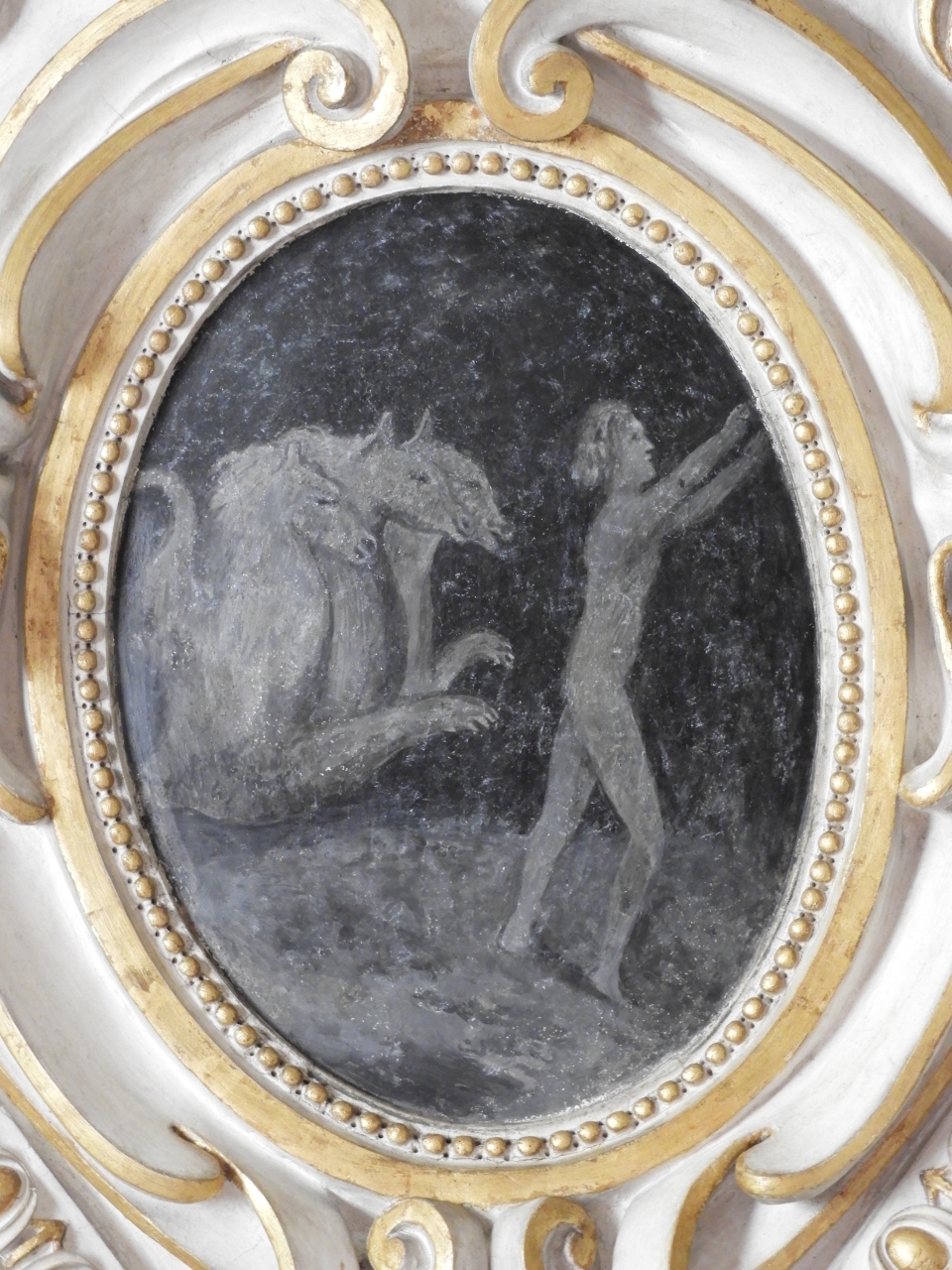 - NOTIZIE STORICO CRITICHE Il dipinto, condotto a olio, è uno dei quattro ovali della volta dedicati ad alcune imprese di Ercole, eroe protagonista della scena di apoteosi (dipinta su tela) al centro della volta stessa. L'immagine, di scarsa qualità (probabilmente ridipinta?), è stata infatti letta da Signorini come raffigurazione di Esione, figlia del fondatore di Troia Laomedonte, insidiata da un mostro marino a tre teste mandato da Nettuno, dal quale sarà liberata grazie all'intervento di Ercole (Metamorfosi, XI, 211-213). La scena non pare derivare da alcuna incisione di Antonio Tempesta. Come gli altri tre ovali della volta, il dipinto, monocromo, tende ad assomigliare ad una gemma o ad un cammeo, richiamando lo stesso gioco imitativo sotteso all'esecuzione delle vele