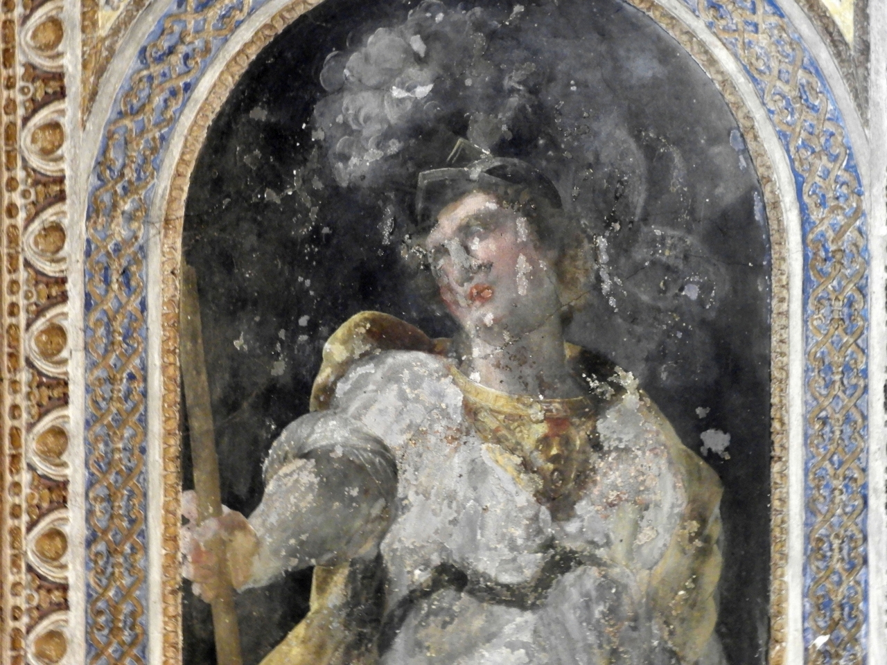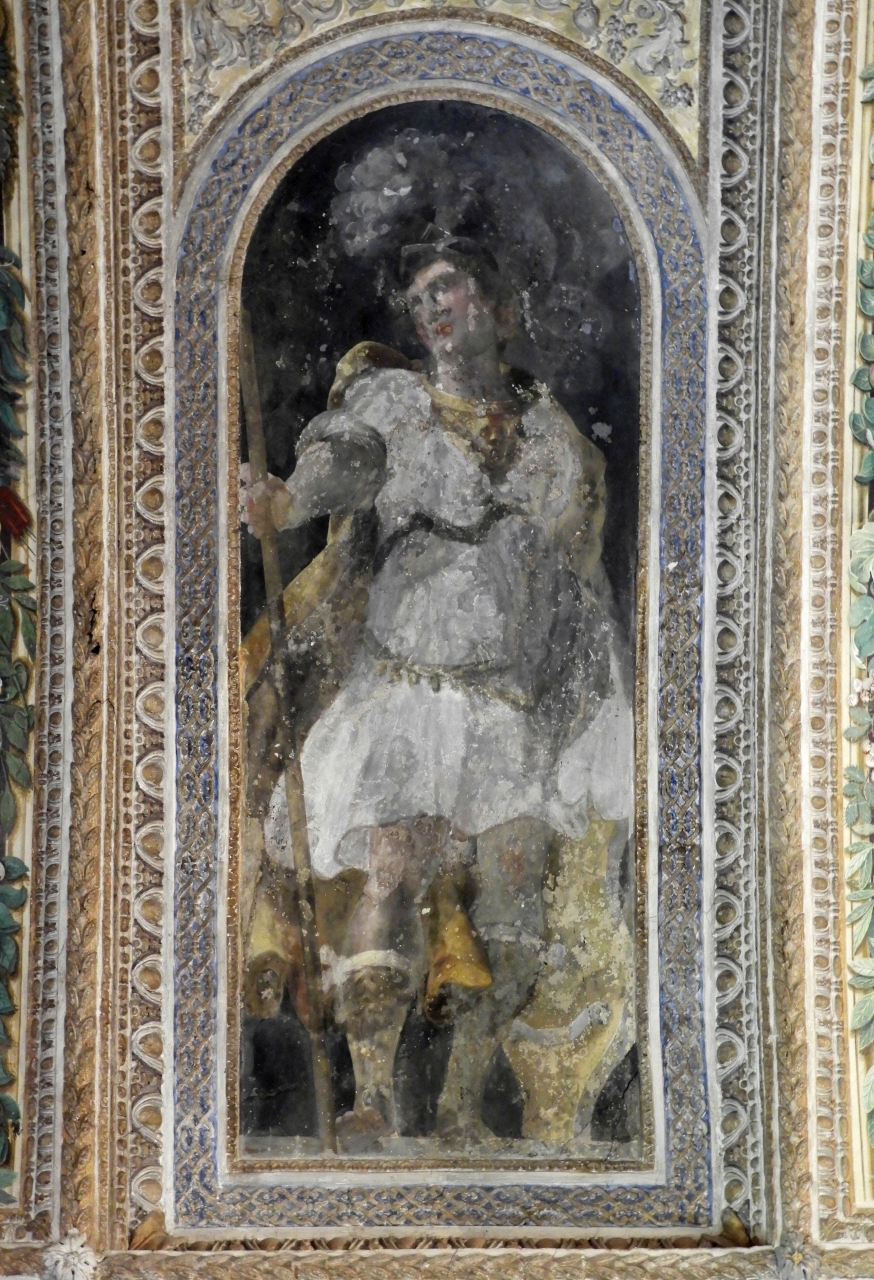 - NOTIZIE STORICO CRITICHE Nella prima finta nicchia del lato meridionale, alla sinistra dell'ottagono con consesso di divinità, è dipinta una figura in armi su fondo scuro: si riconoscono l'elmo piumato, la corazza con gorgone sul petto, gli schinieri, la lancia e lo scudo. L'identità del personaggio non è definibile con chiarezza: potrebbe trattarsi di un eroe, ma anche di Marte (oppure di Minerva?). La didascalia sottostante, in lettere dorate su fondo scuro entro targa rettangolare, non è connessa al dipinto, poiché fa esplicito riferimento all'indovino tebano Tiresia, padre di Manto. Già Cottafavi (1927, p. 424) aveva sottolineato l'incongruenza tra le didascalie e le soprastanti scene di questo lato della volta, ipotizzando un aggiornamento dei riquadri istoriati in una fase successiva alla prima redazione della sala. Lo scarto tra scene e didascalie non può tuttavia essere spiegato facendo ricorso a documentati lavori nel 1582, poiché il documento individuato in proposito da Patricolo (1908, p. 46) e recentemente ripreso da Koering (2013, p. 311) non si riferisce alla sala in oggetto, come chiarito da Berzaghi (2002, p. 563, nota 4). Per quanto riguarda l'esecuzione dei dipinti del lato meridionale da parte del Costa, L'Occaso (2007, p. 71) ipotizza una datazione non anteriore al 1570