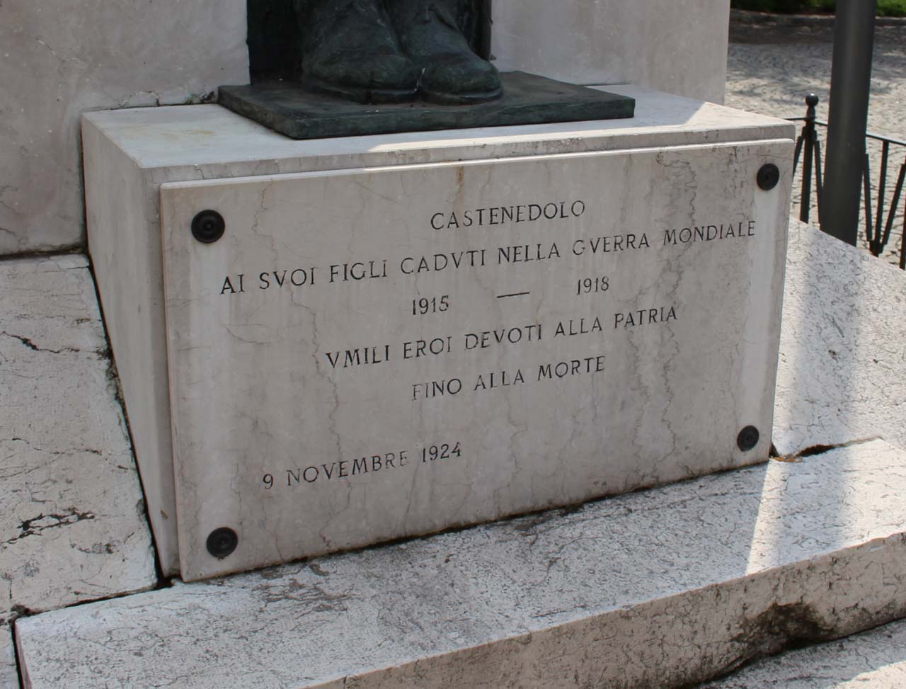 - ISCRIZIONI fronte del monumento, lapide posta sul basamento - CASTENEDOLO/ AI SVOI FIGLI CADVTI NELLA GVERRA MONDIALE/ 1915 - 1918/ VMILI EROI DEVOTI ALLA PATRIA/ FINO ALLA MORTE/ 9 NOVEMBRE 1924 - capitale - a incisione -