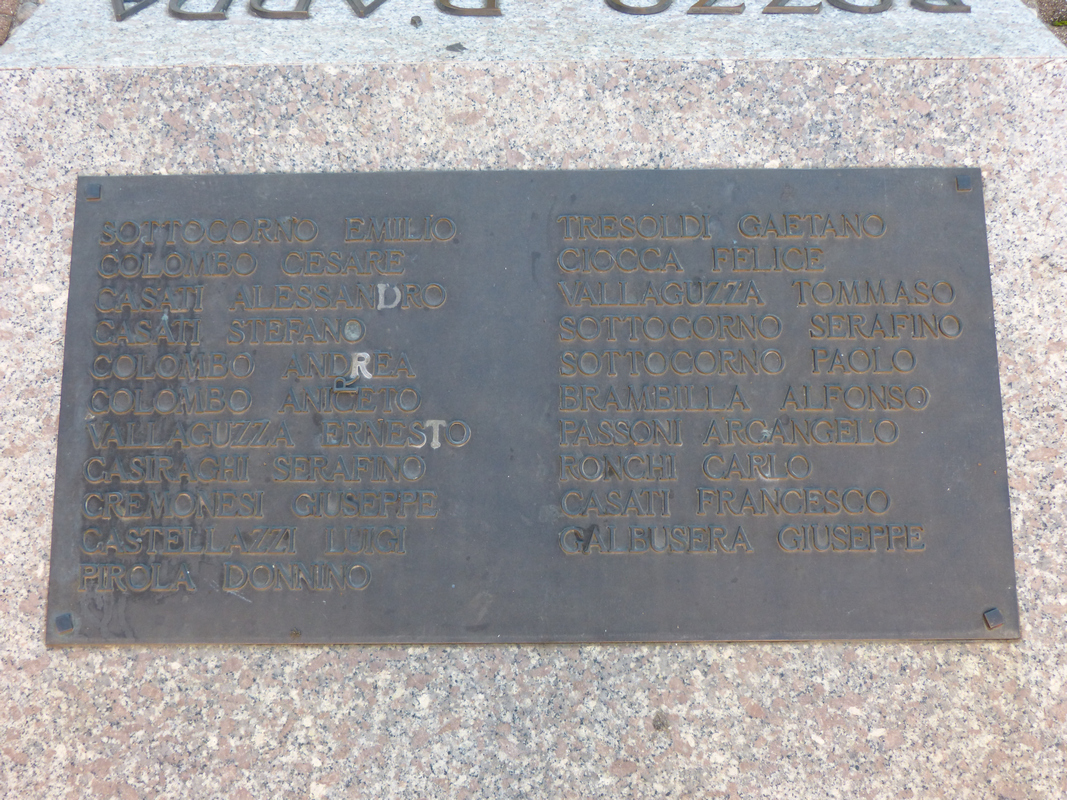 - ISCRIZIONI sulla targa rivolta verso la scultura - POZZO D'ADDA / AI SUOI / CADUTI - capitale - a caratteri applicati in bronzo -