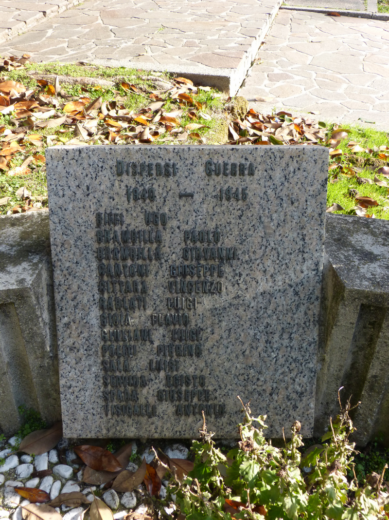 - ISCRIZIONI sulla stele centrale - MCMXV / MCMXVIII / FIGLI D'ITALIA / RIBUTTARONO IL NEMICO / CADDERO / ANDREONI AMBROGIO / ARCHIDI SIRO / CASSANELLI ATTILIO / CASSANELLI FELICE / [...] MARIO / BELLONI ANGELO / BERETTA GIOVANNI / BONALUMI AMBROGIO / BO[...]ANTI GIUSEPPE / BRUSAMOLINO AURELIO / COLOMBELLI ANGELO / CORTI MARIO / CRESPI DOMENICO / D'ADDA ANGELO / D'ADDA LUIGI / FONTANA ENICO / FRASSINO OLIVO / [...] ANGELO / [...] CARLO / [...] GIACOMO / INVERNIZZI ANDREA / [...] / MANDELLI ALFREDO / MANZONI MARIO / NEGRI FRANCESCO / PENATI FELICE / PONZONI LUIGI / PREZIATI CESARE / PREZIATI NUNZIO / RONCHI OTTORINO / SANTANDREA GIOVANNI / SCARAMUZZA [...] / TREZZI FRANCESCO / BONALUMI GIOVANNI / CAGLIO ANGELO / COMELLI EGIDIO / GALLI CARLO / GALLI GIUSEPPE / GIOIA LUIGI / [...] / PANZERA ENRICO / POZZI [...] / VILLA EMILIO - capitale - a caratteri applicati in bronzo -