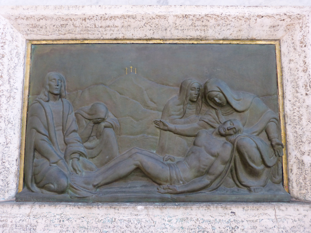 monumento ai caduti della prima e della seconda guerra mondiale: a edicola addossata al muro che chiude la piazza sul lato destro rispetto alla chiesa. Preceduta da una scalinata a tre gradini su cui si impostano due colonne ioniche che sorreggono una trabeazione terminante in un timpano decorato con una testina di angelo e una croce alla sommità. All'interno è una targa con incisi i nomi dei caduti e in basso, al centro un bassorilievo bronzeo raffigurante Cristo deposto nel grembo della Madre, le Pie donne e San Giovanni Evangelista. In basso è un sarcofago scolpito e decorato con motivi vegetali. Dal soffitto pende una lampada