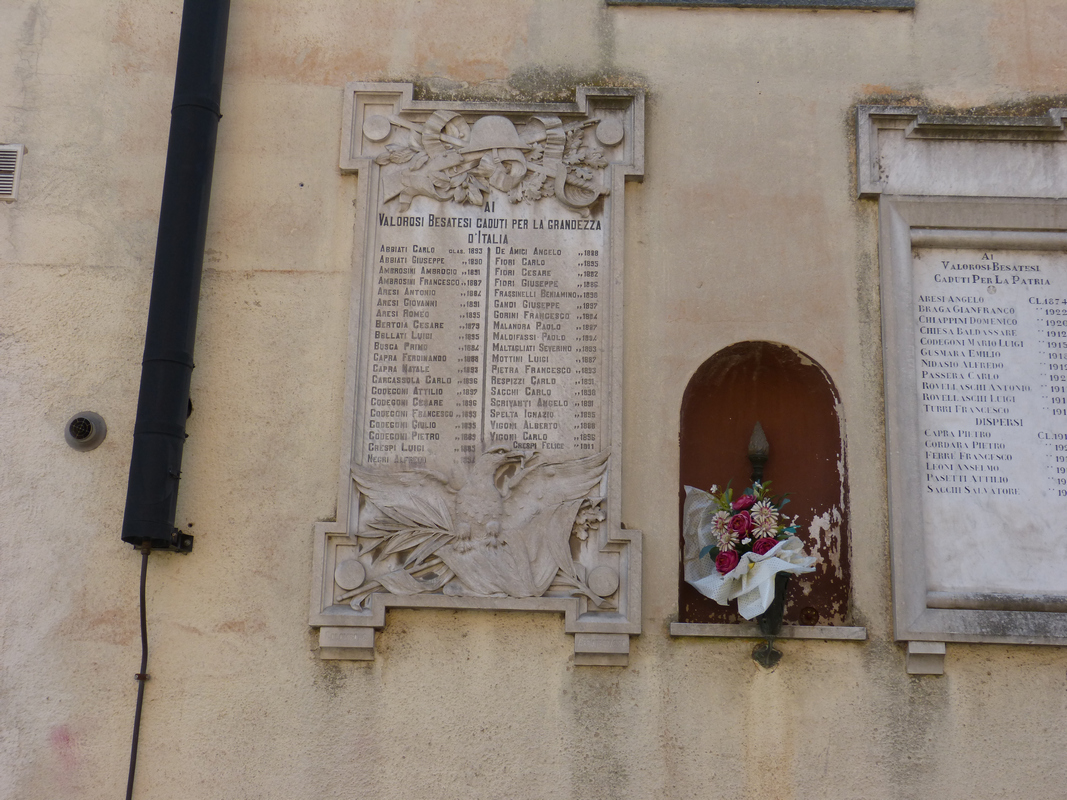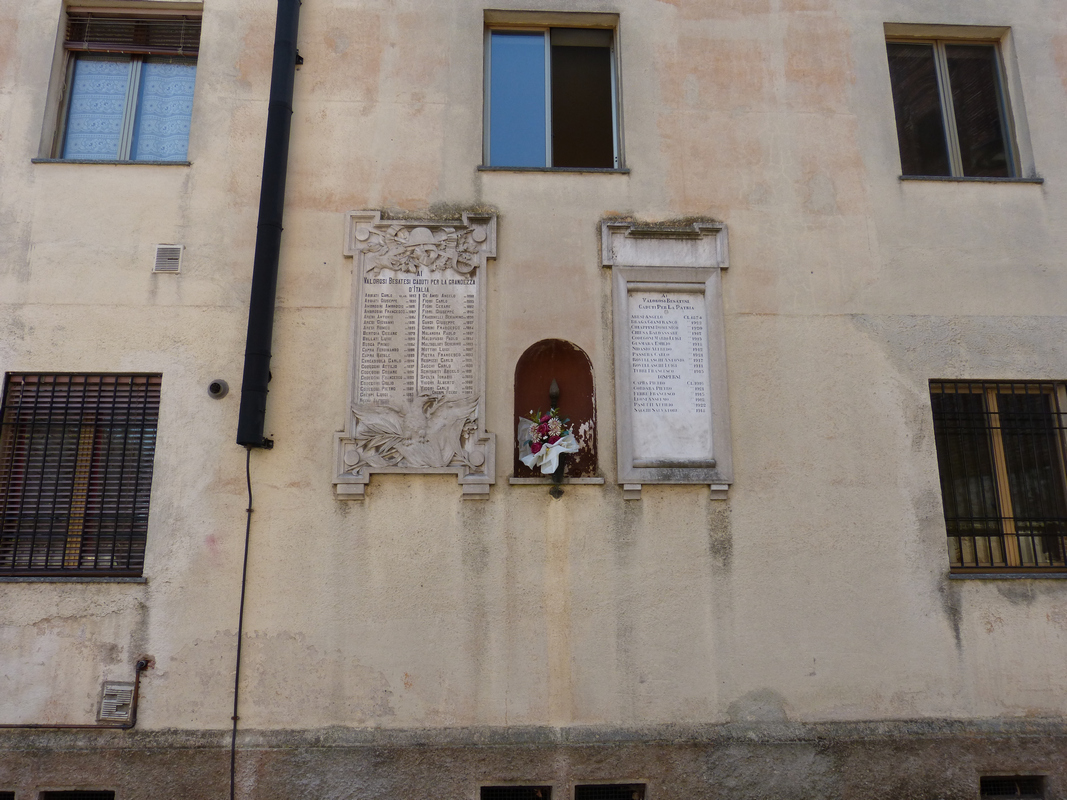 monumento ai caduti della prima guerra mondiale: lapide scolpita con in basso insegne militari: elmetto, fucile e spada intrecciati, sotto segue l'elenco dei caduti mentre in basso è un'aquila che tiene la bandiera nelle zampe ed un ramo di alloro