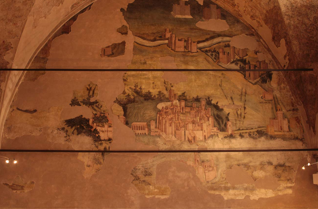 L'affresco raffigura una veduta della città di Mantova e del suo territorio, panorama che si estendeva sulle quattro pareti dell'ambiente